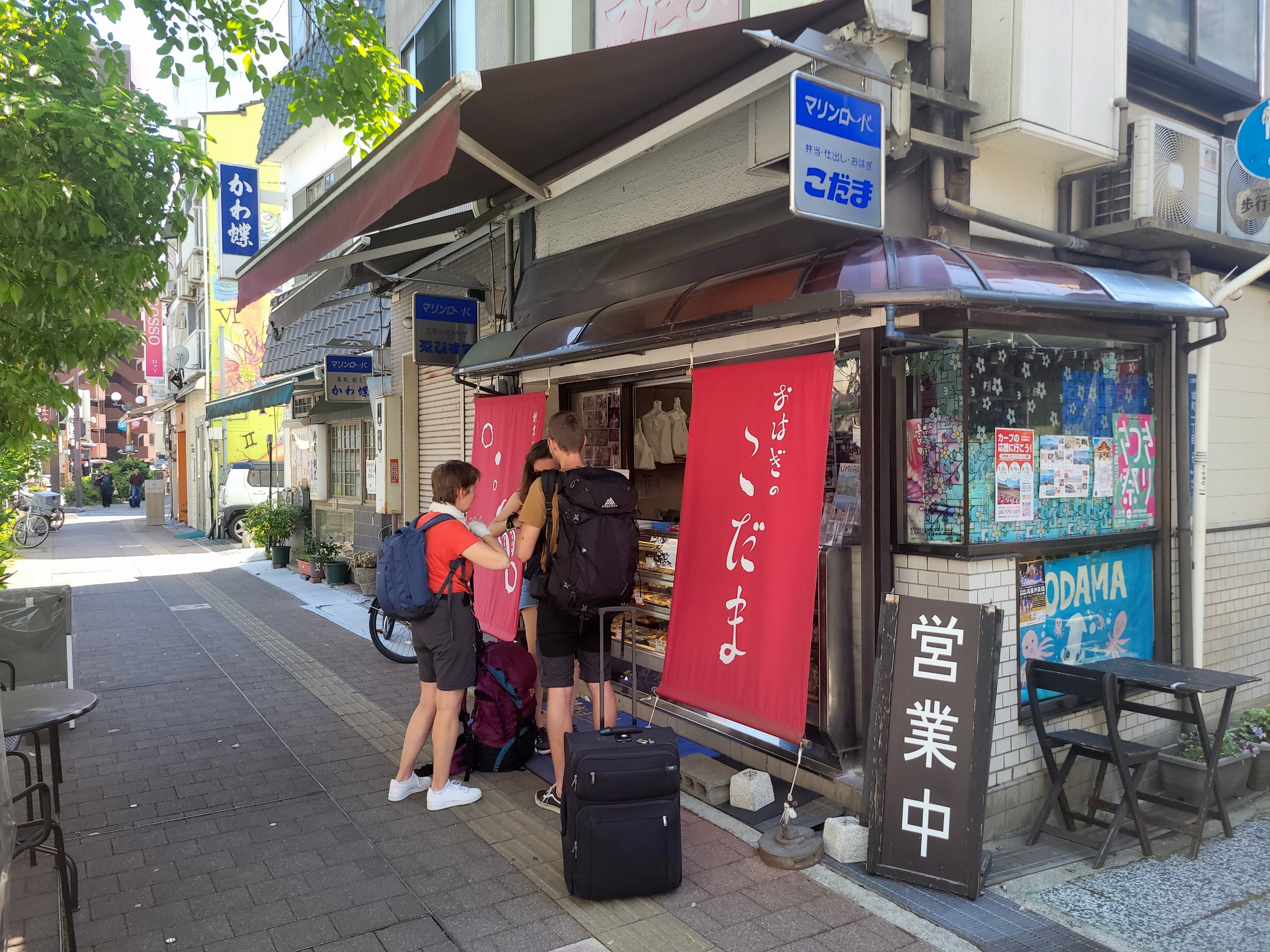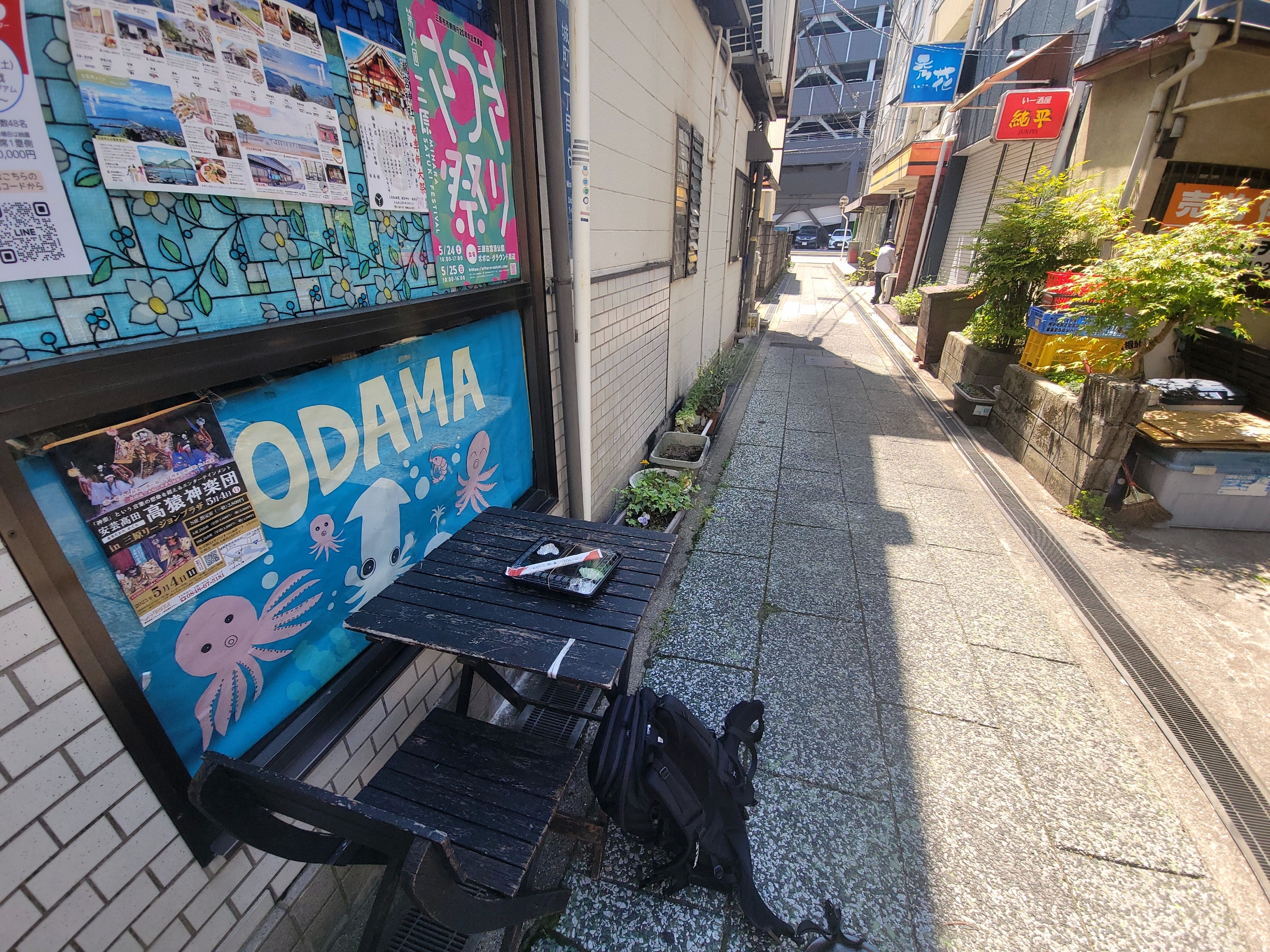 目的としていたこだま食堂へ。こんな場所にも外国人観光客がいるのを見ると、Googleマップの普及により、旅先での国籍による偏りが減っているのかもしれないと感じました。幸運にも目当てのたこ飯弁当が手に入り、店の横のテーブルで早速いただきました。
