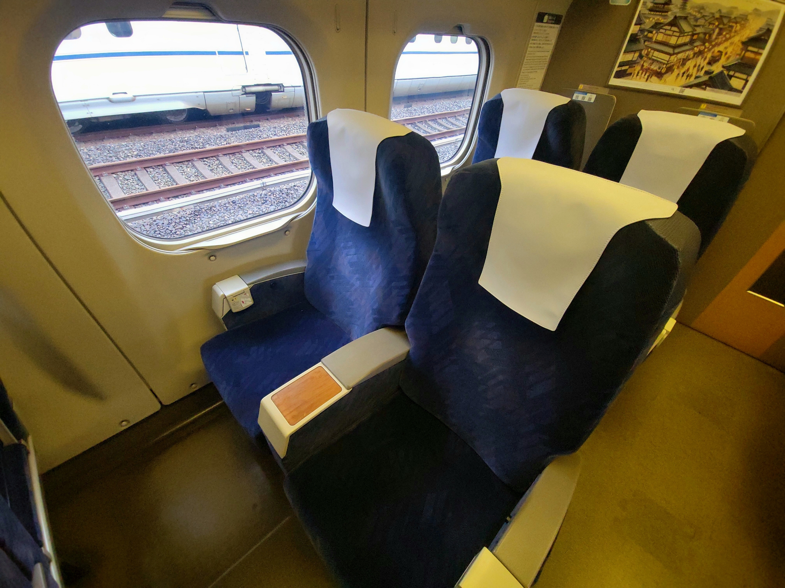 「ひかりレールスター」の指定席は、グリーン車のような2列×2列の座席配置が特徴です。座席間のアームレストはしっかりと厚みがあり、隣席との仕切りとしての役割も果たし、プライベート感を保てるのが魅力です。まあ、車内はガラガラですがね。