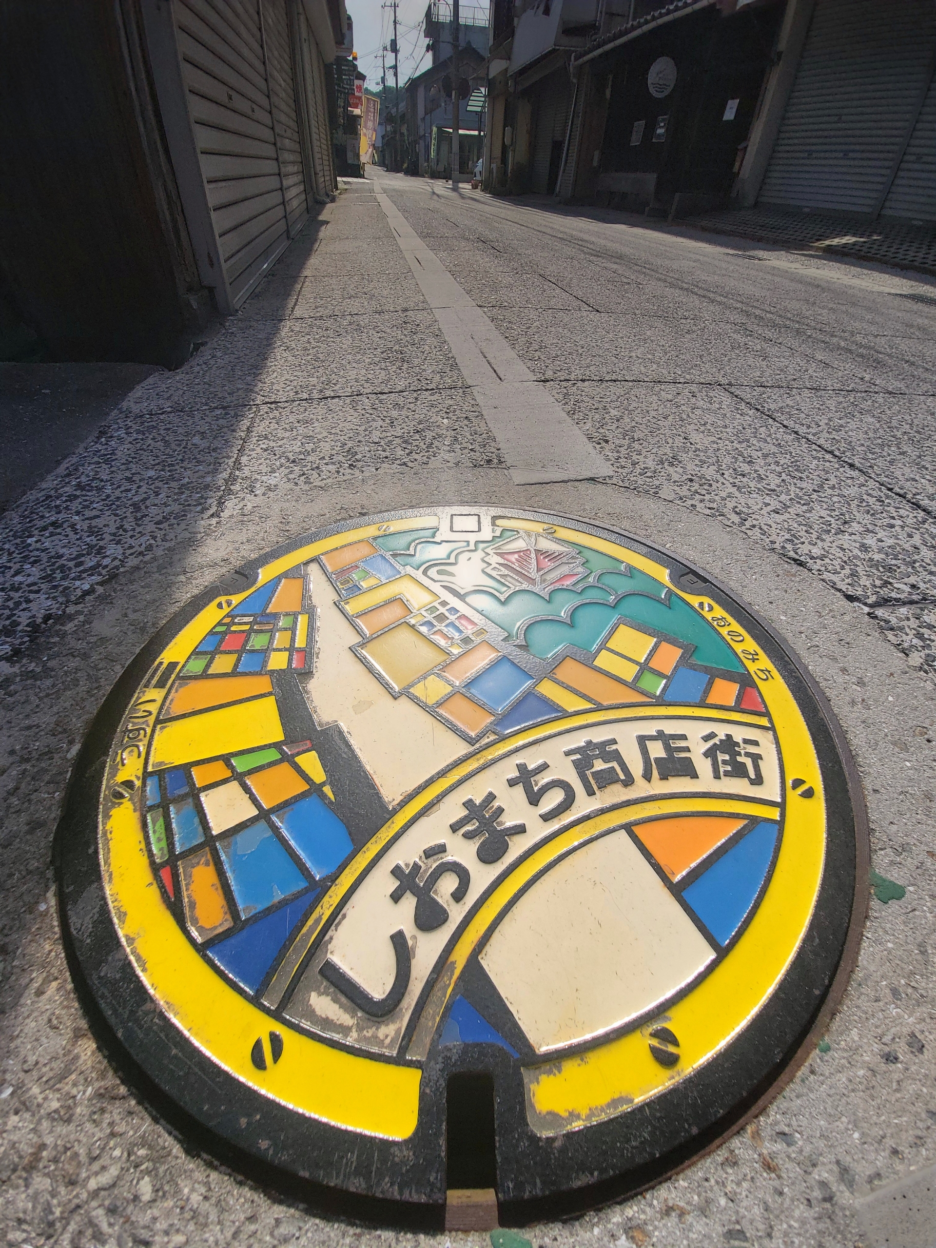 しおまち商店街を歩いていると、足元にカラフルなデザインマンホールを見つけました。これは、尾道市立大学の学生がデザインしたもので、空から見下ろした商店街の様子や、国宝指定の向上寺三重塔などが描かれています。レモン色の縁取りも印象的で、写真映えすること間違いなしです。