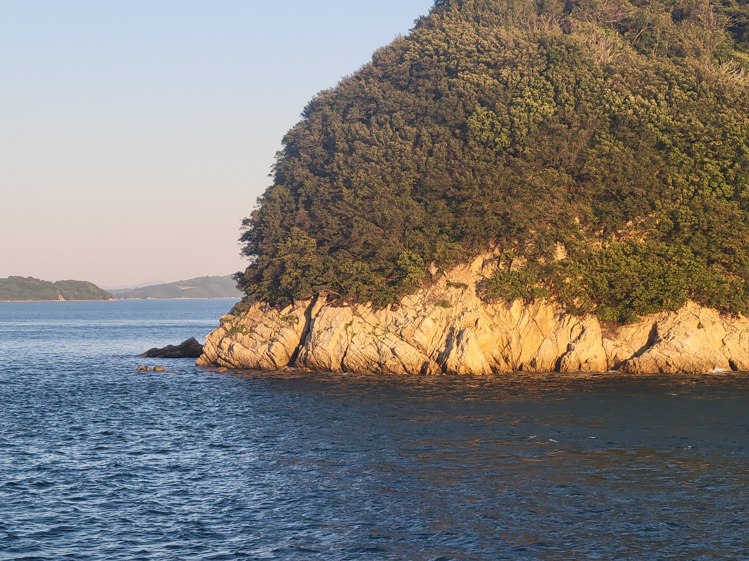 このあたりの島は花崗岩で出来ているようです。西日が当たり赤く染まっています。