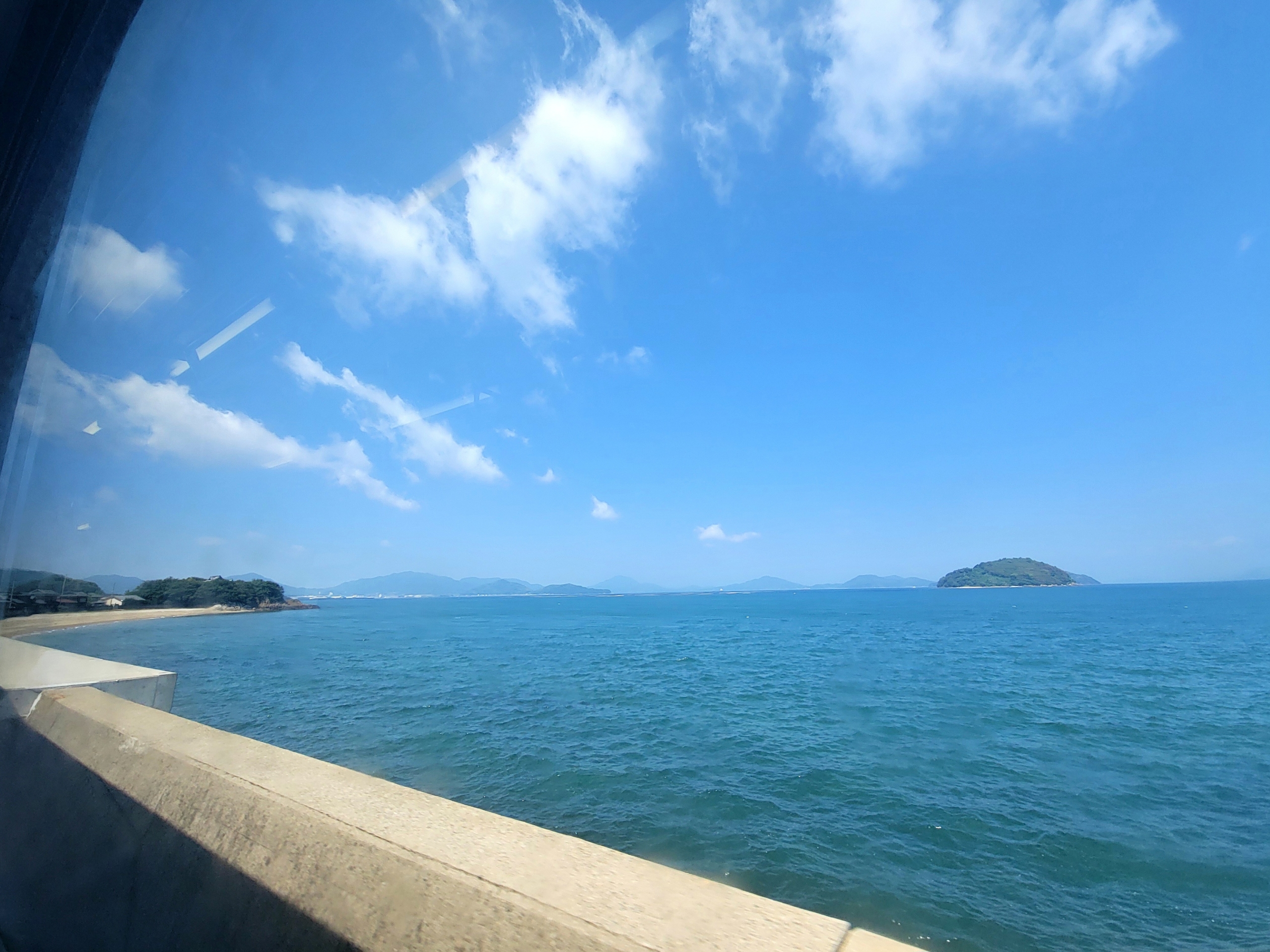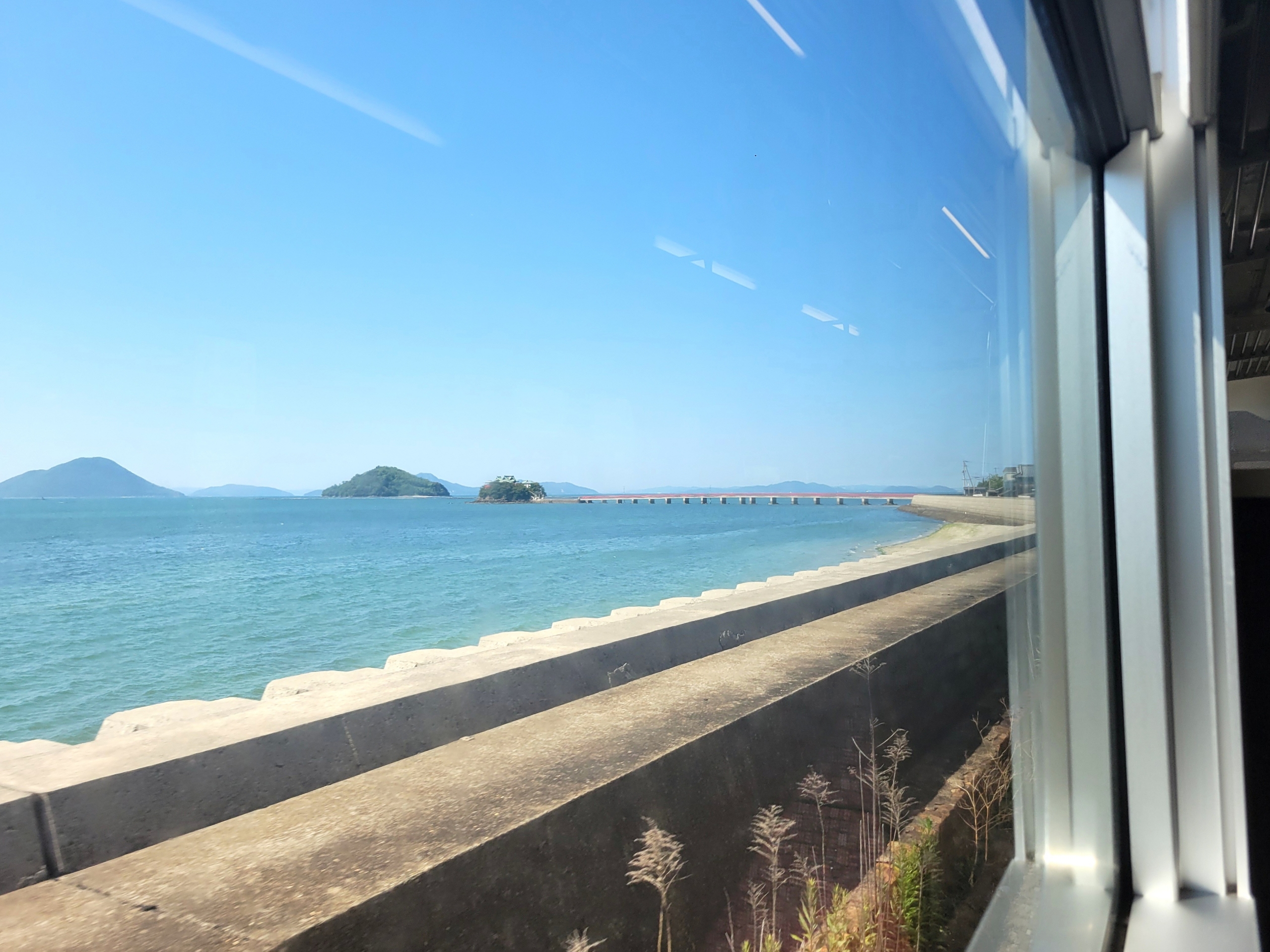 線路と海の距離が近いので、下り線(岡山→高松)は左側が景色が良いのですが、午前中ということで逆光を避けるために、右側に座りました。やはり海までは距離があって、それほど眺めが良くないですね。