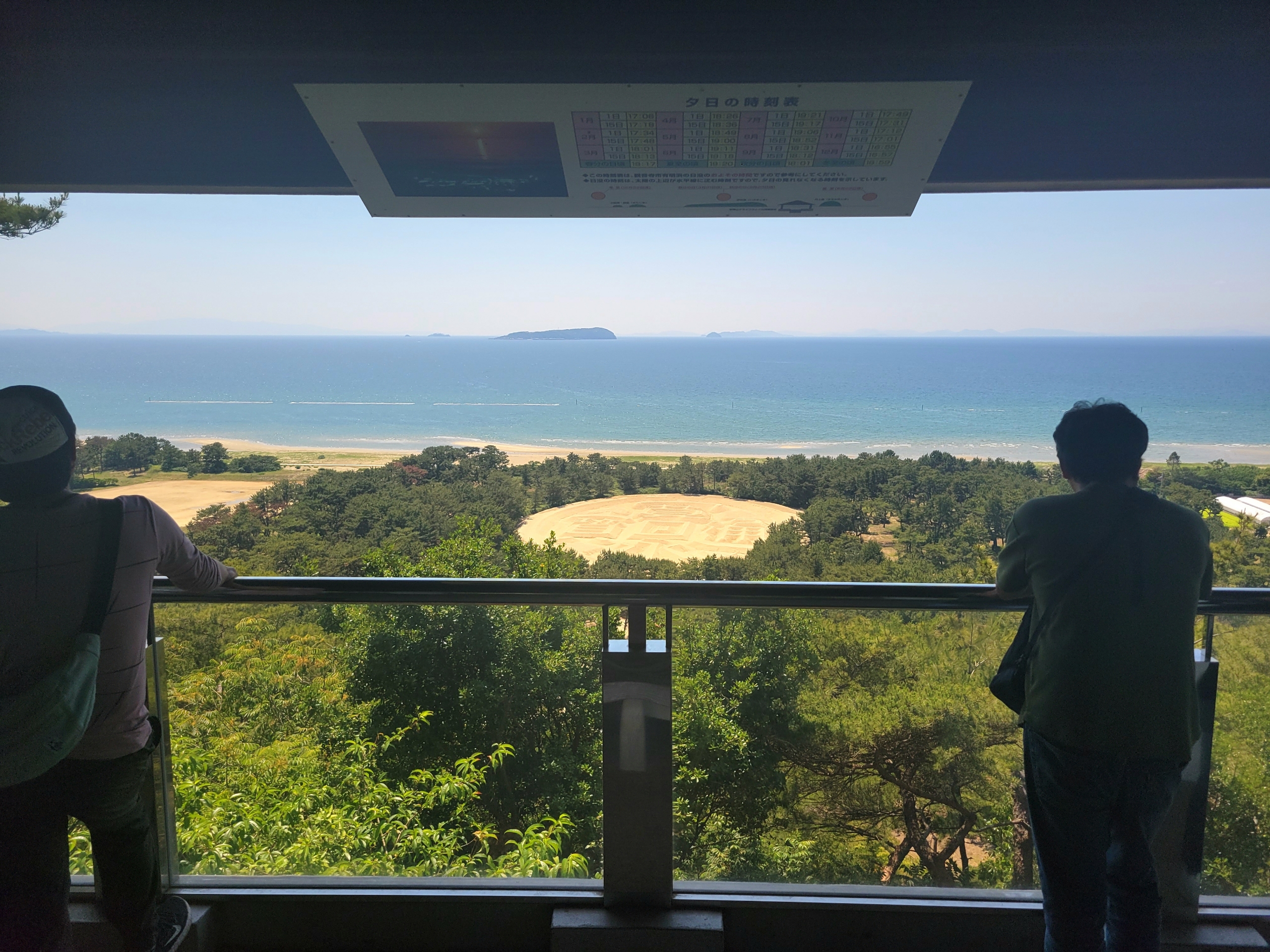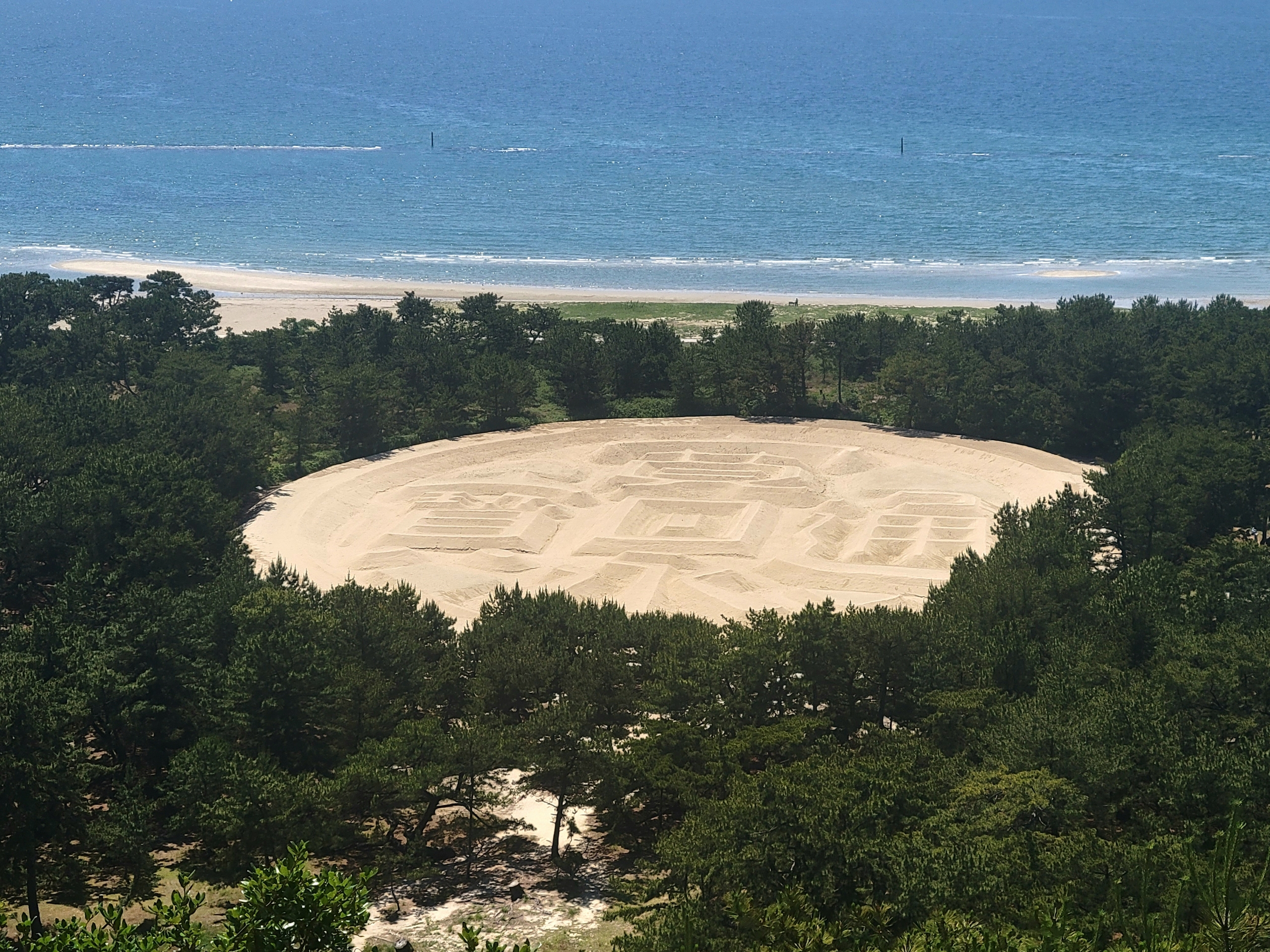展望台から眼下を見下ろすと、「寛永通宝」の砂絵が出現します。展望台からの視界では全体がよく収まるので、一見するとその規模が分かりにくいのですが、案内板を見ると、その実態は東西122m、南北90mという大きさ!砂の盛り上がりも2mほどあるそうです。
