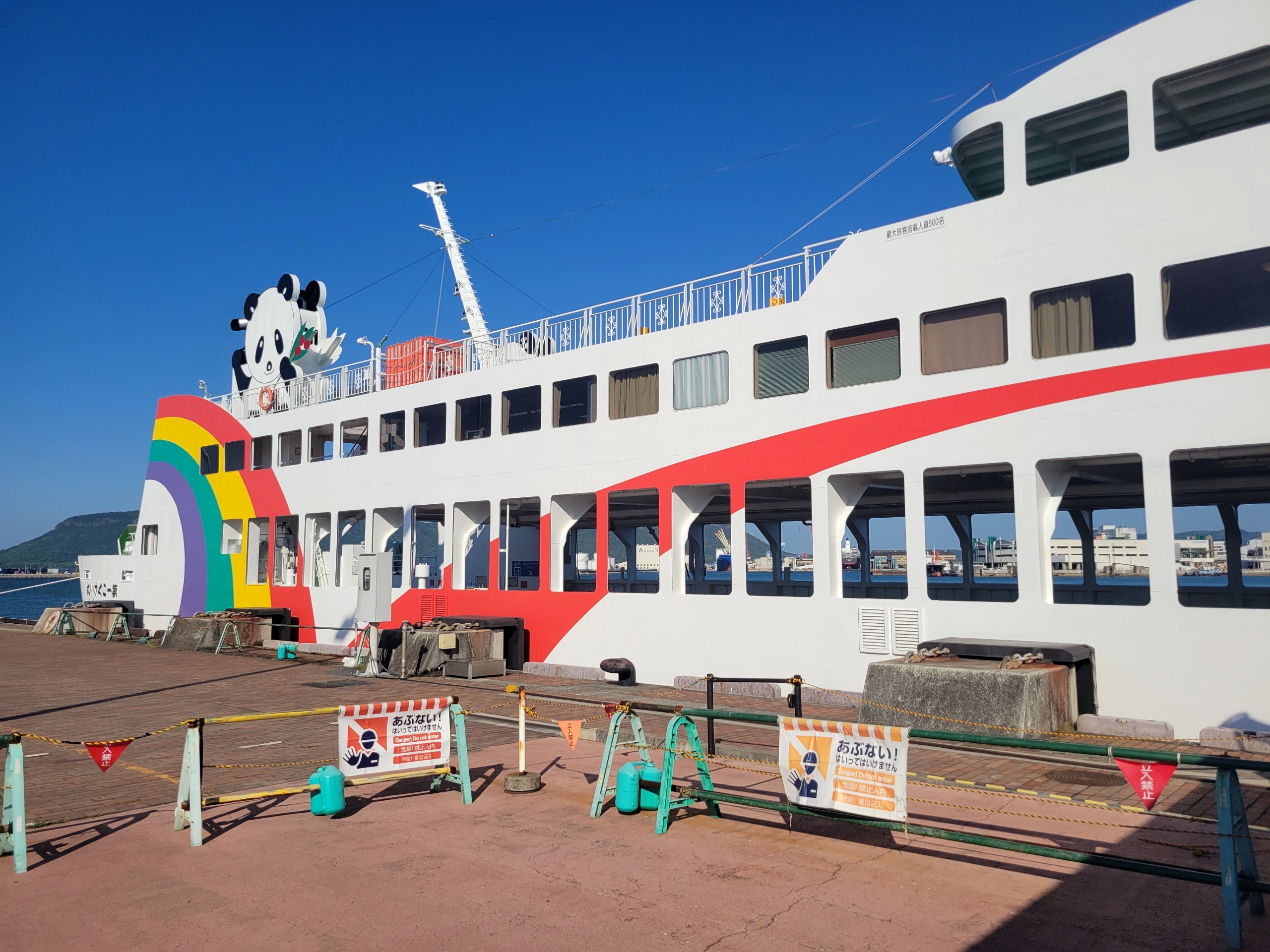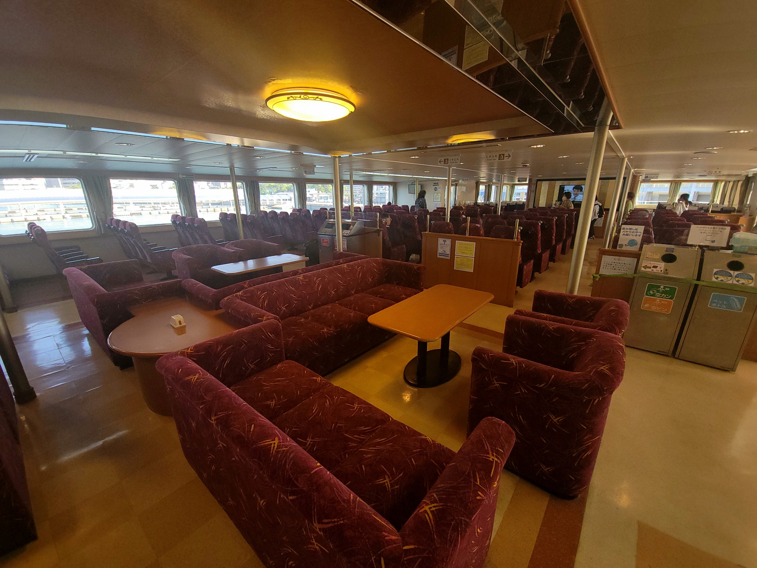 中途半端な時間だったので、船内はかなりすいていました。愛称「パンダ」号こと「第一こくさい丸」の船内は、えんじ色のファブリックで、よく言えば落ち着いた雰囲気、悪く言えば少しレトロな感じでした。2007年7月に就航開始された船で、すでに18年が経過しているため、やはり古めかしい感じがするのは否めません。