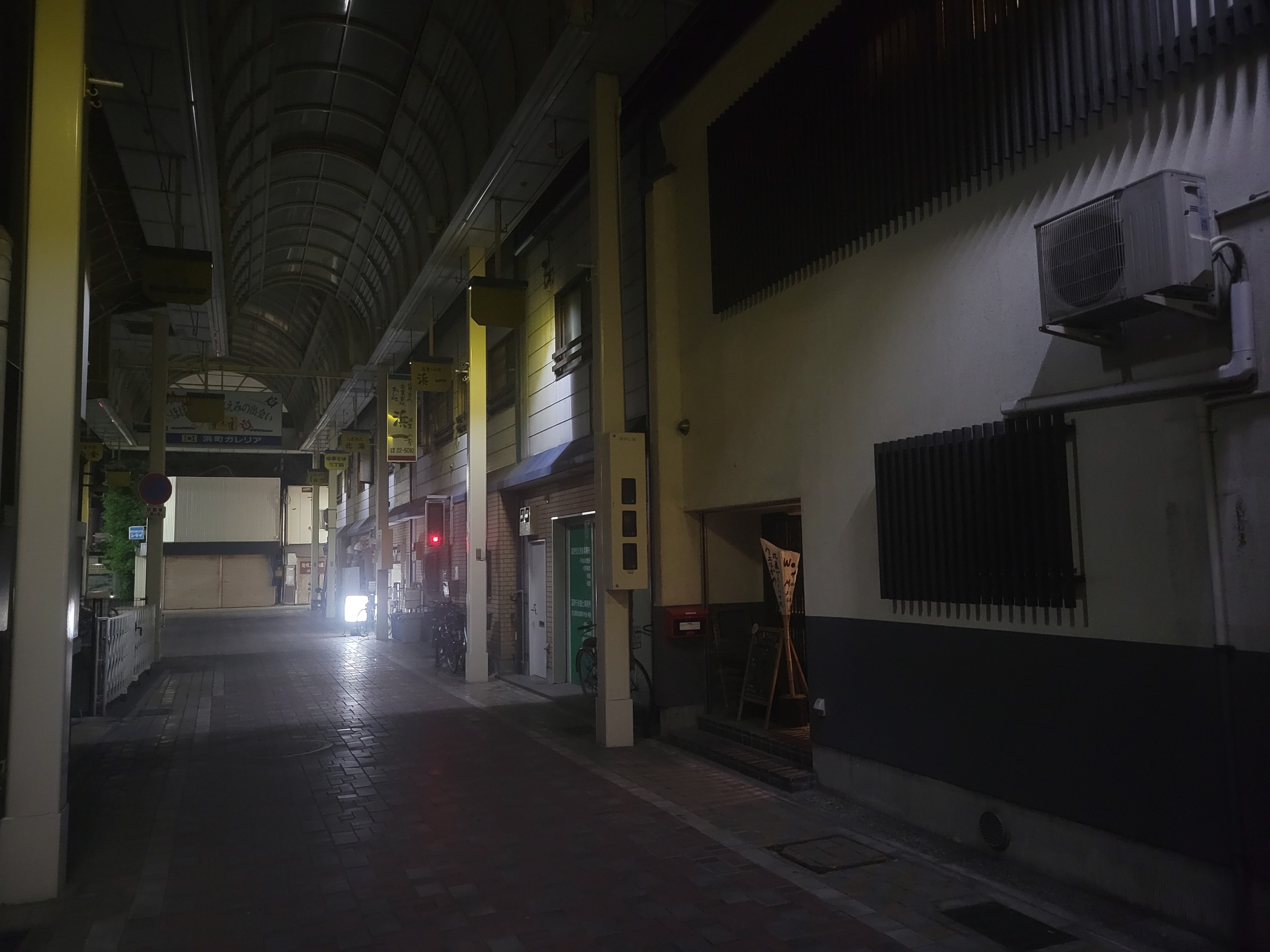 丸亀駅前の商店街に今日宿泊するゲストハウスがあります。お店も開いてないし、照明もなくて、暗すぎる…