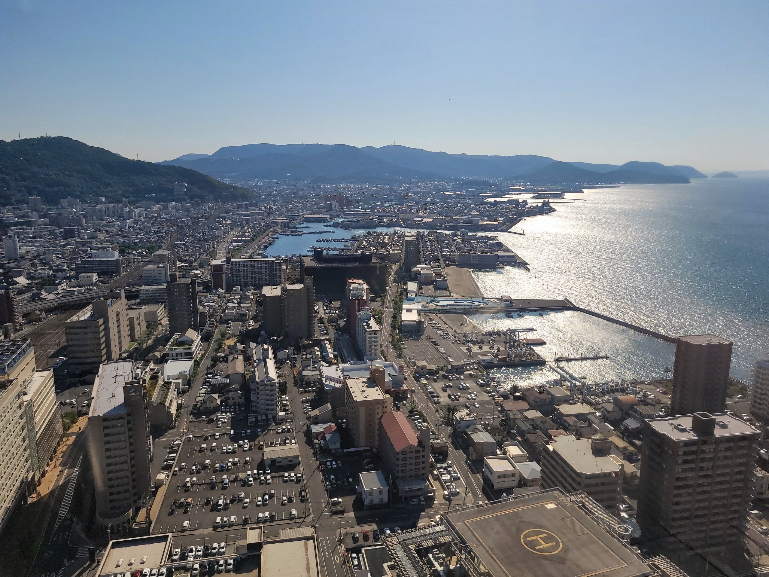 東側の眺望は、高松港と瀬戸内海。眼下にはこれから乗船する小豆島行きのフェリーが発着する高松港が見えますが、フェリーは1隻も見当たりません。連絡船が廃止されて以降も宇高国道フェリーが2019年まで運行されていましたが、現在では高松港から発着する定期航路は小豆島と直島のみ。かつて四国の玄関口として多くの船で賑わった港の歴史を思うと時代の移り変わりを感じさせてくれる風景です。