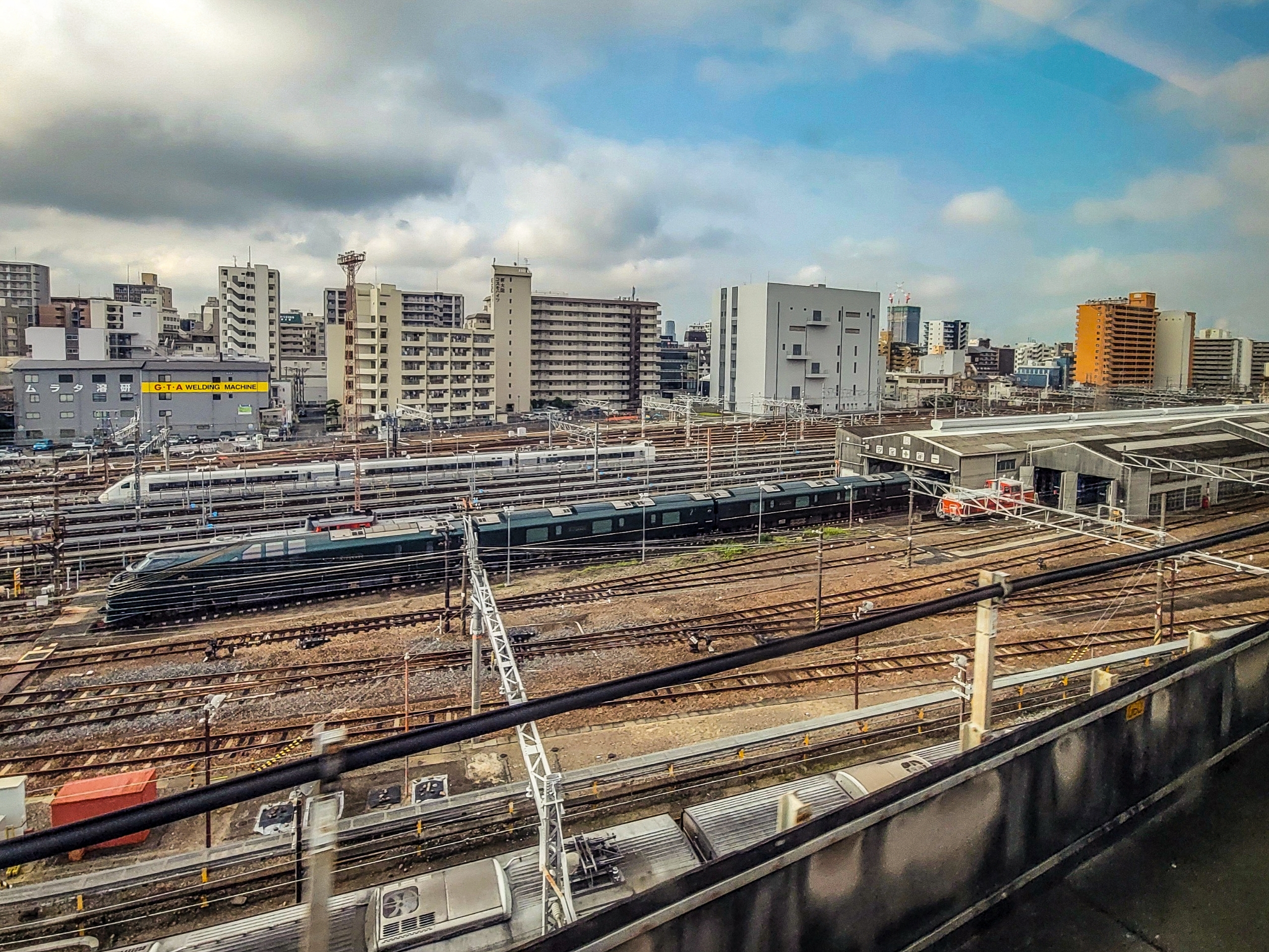 新大阪駅を出発してすぐ、左下に見えてくるのは在来線の車両基地、宮原総合運転所です。大阪駅発着の列車がここから送り込まれるため、様々な列車が停まっています。中央には、深い緑色のトワイライトエクスプレス瑞風も見えました。