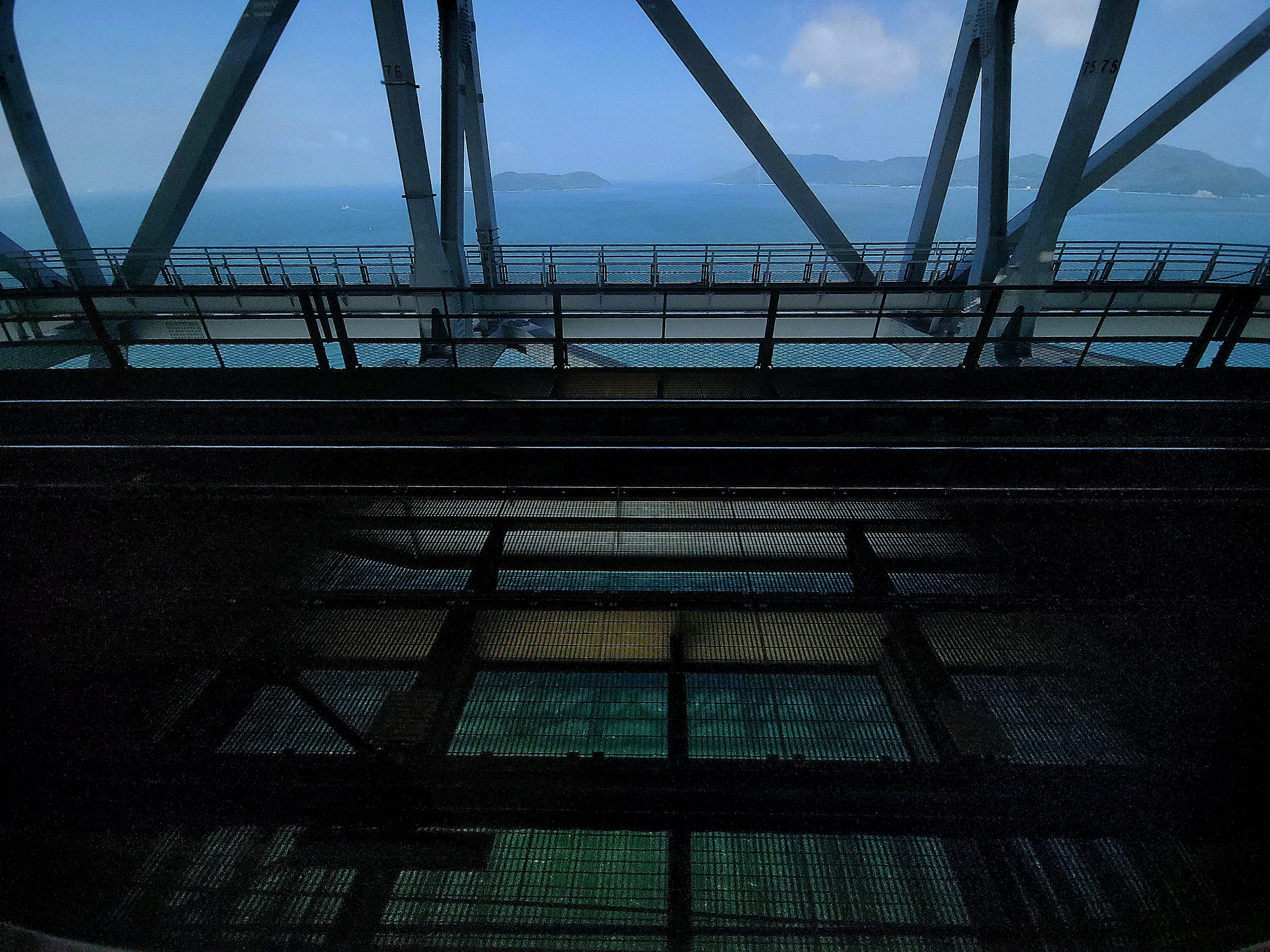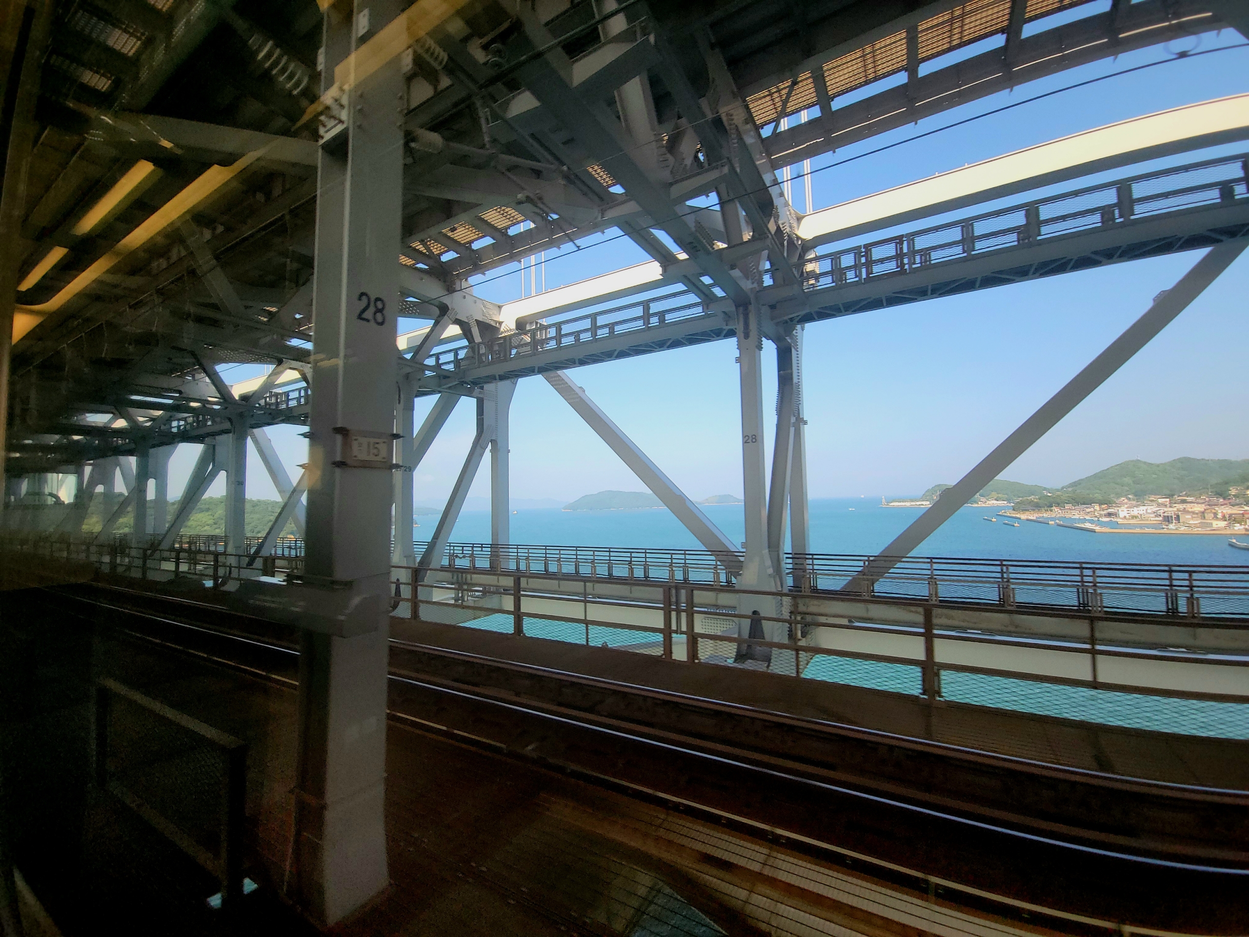 瀬戸大橋の通過は旅行者にとっては一大イベント。いや、出張できた人にとっても橋の上から海を眺めるのは珍しい光景だと思う。けど、車内は日常的に通っている人ばかりなので、窓の外にくぎ付けになっている人はほんとわずかです。