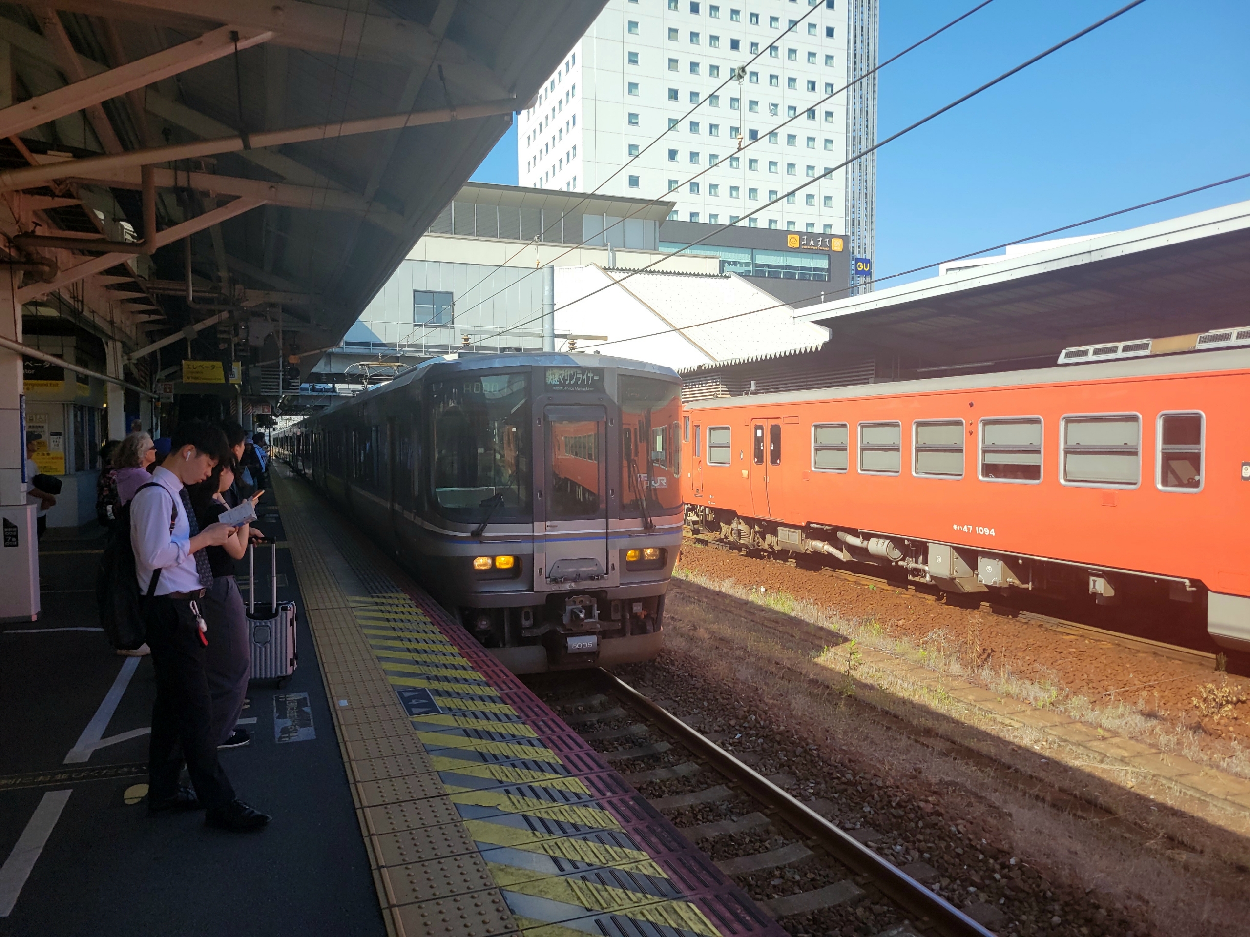 最終的に、左の各駅停車に乗ることになるんだけど、すでに立ち客多数だったので、後発するマリンライナーを利用して、坂出駅で乗り換えます。
