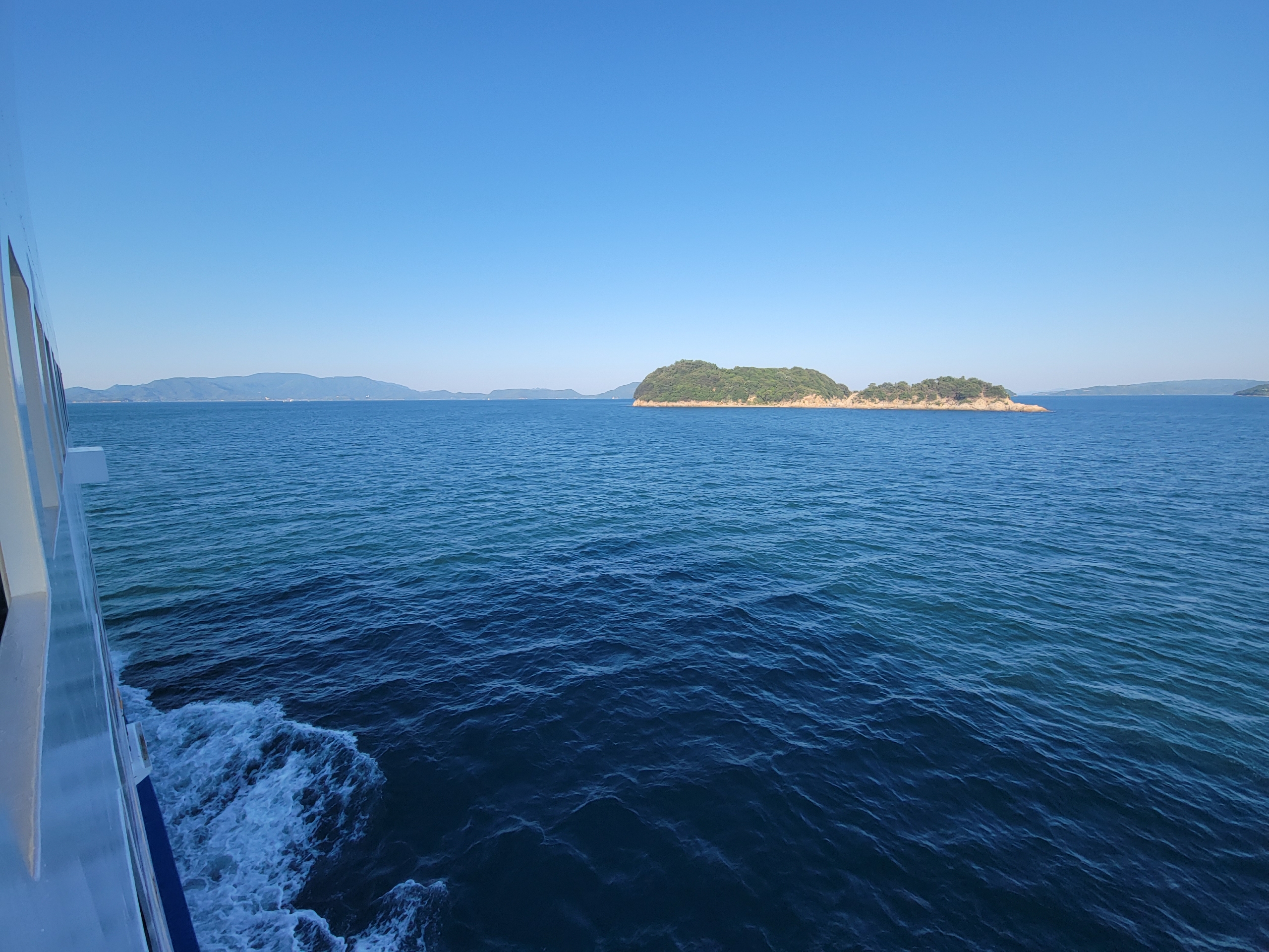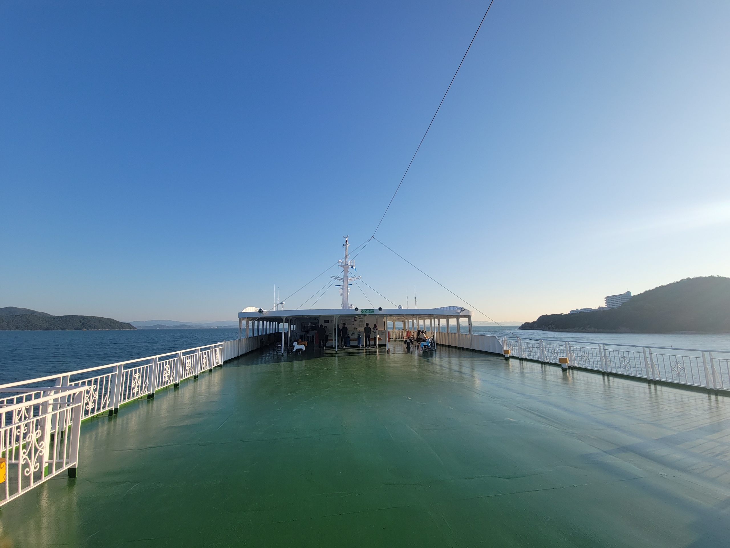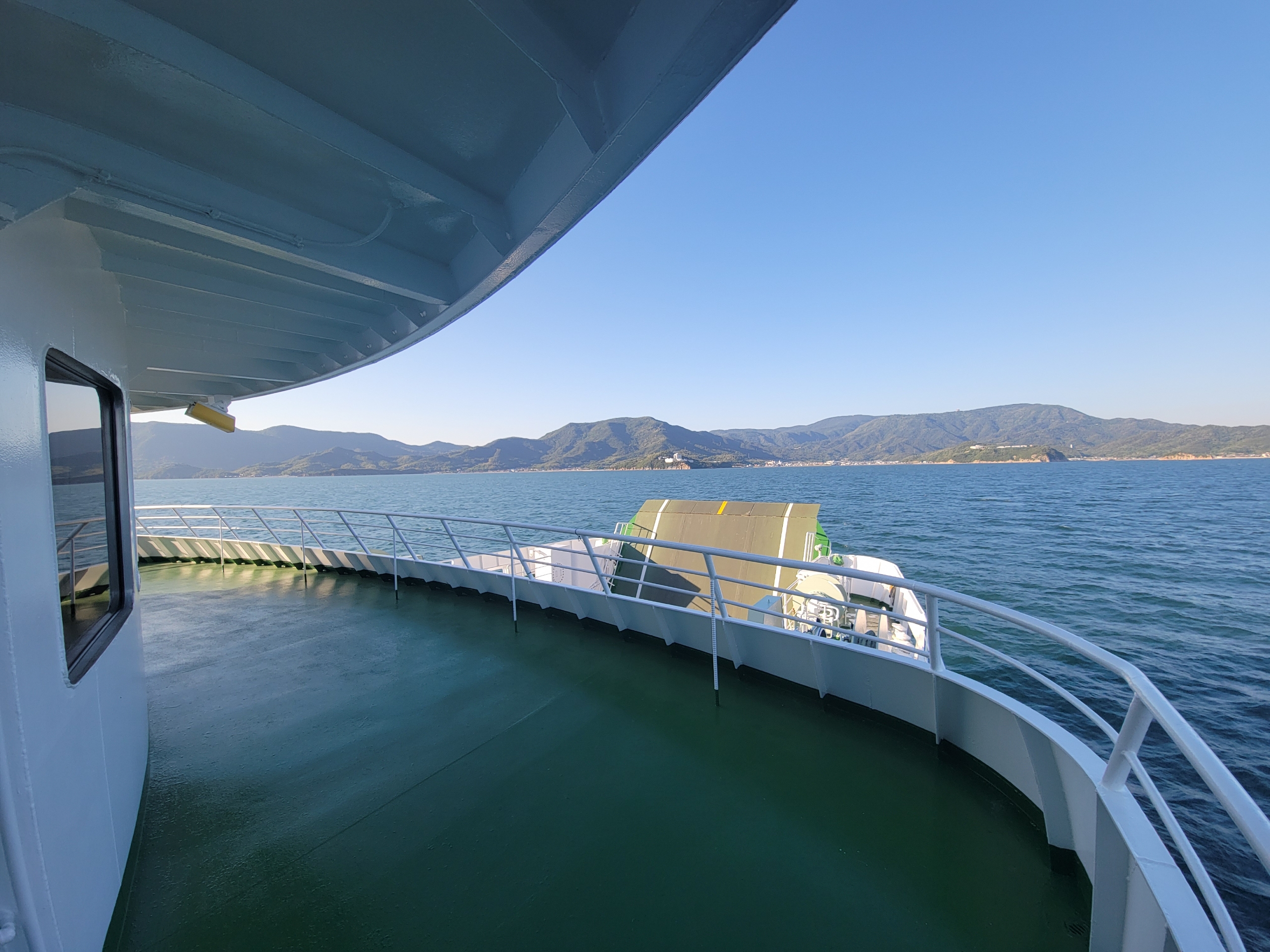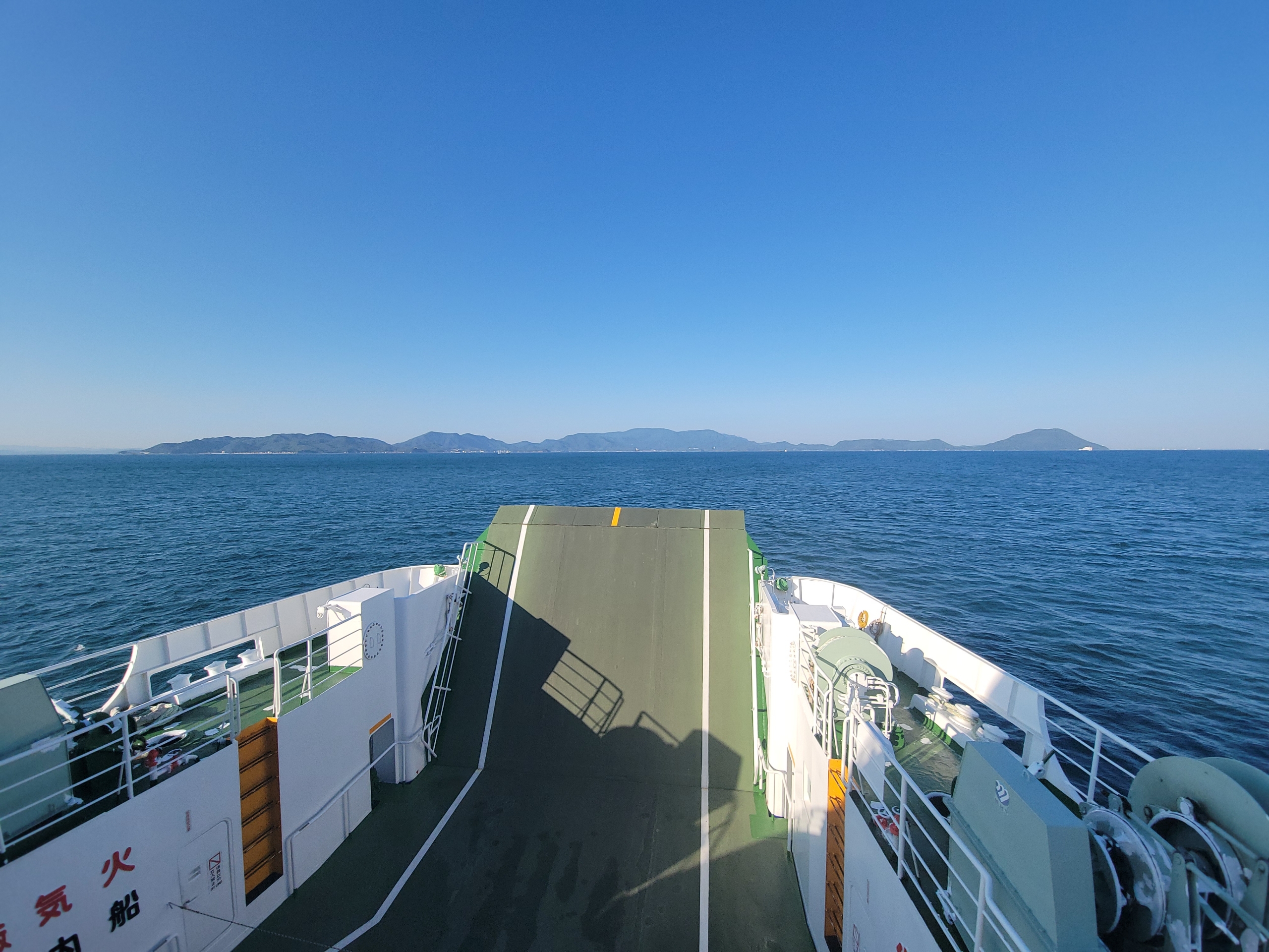 やはり甲板に上がってくるのは観光客ぐらいなもので、ほぼ貸し切りかと思いきや、喫煙所が甲板にあるため、時折、人がやってきます。しかし、基本的にはデッキは貸し切り状態です。海風が心地よく、気持ちいいですね。