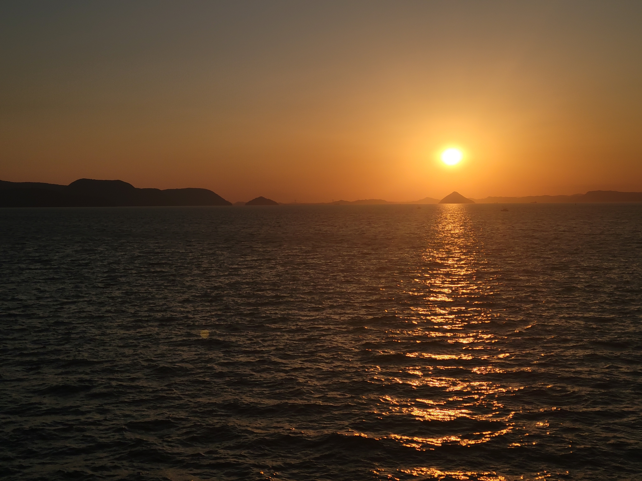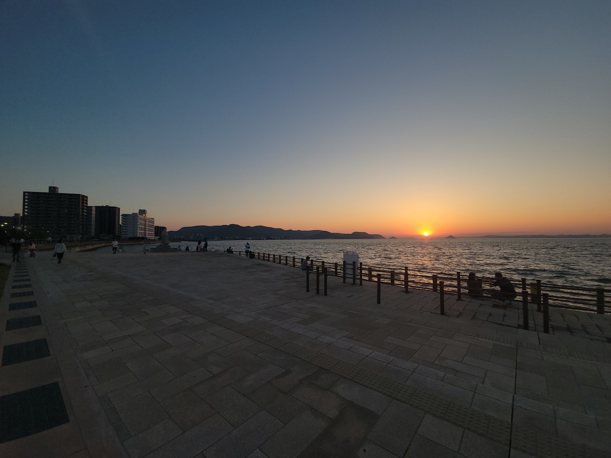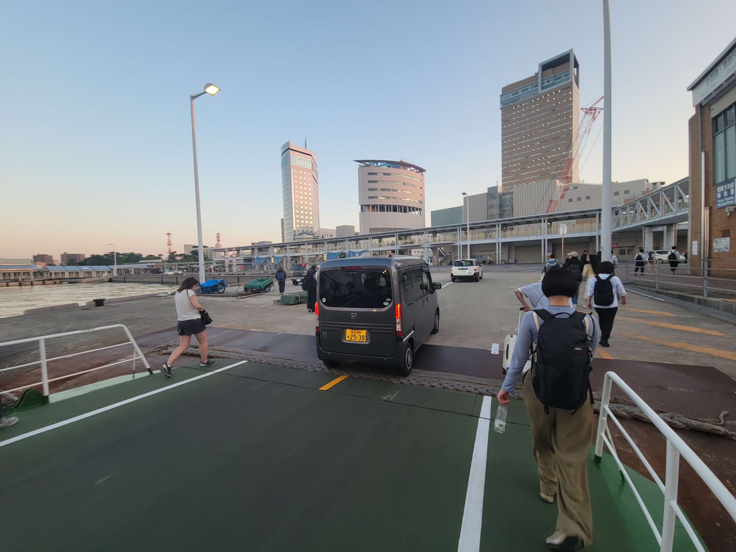 夕日が沈む前にフェリーが高松港に到着してしまったので、急いで夕陽が見える岸壁に移動します。