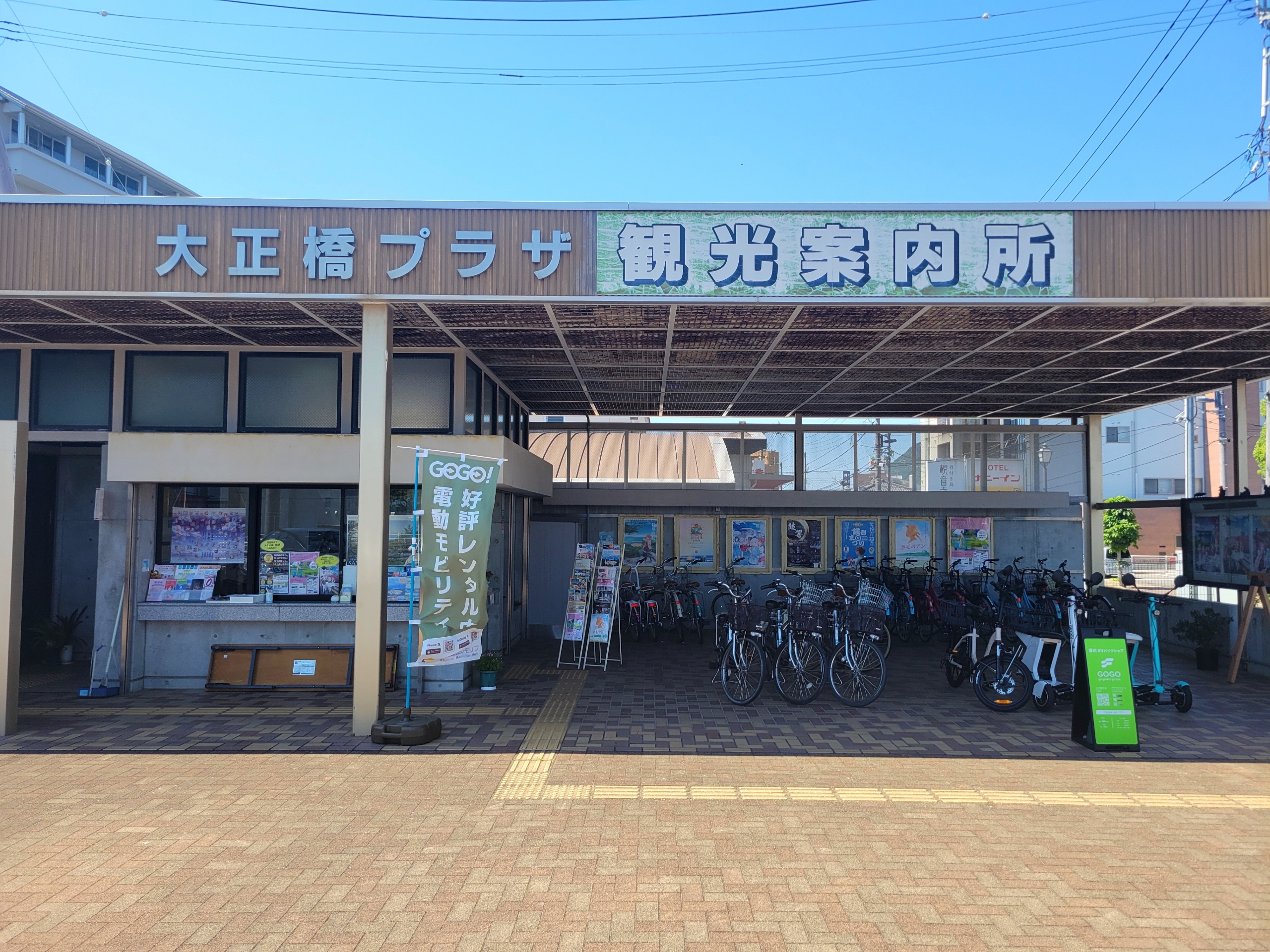 JR観音寺駅に到着後、まずは駅前の観光案内所(大正橋プラザ)で自転車を借りました。電動アシストなしなら1日200円と安価です。電動アシストつきは1日1,000円です。