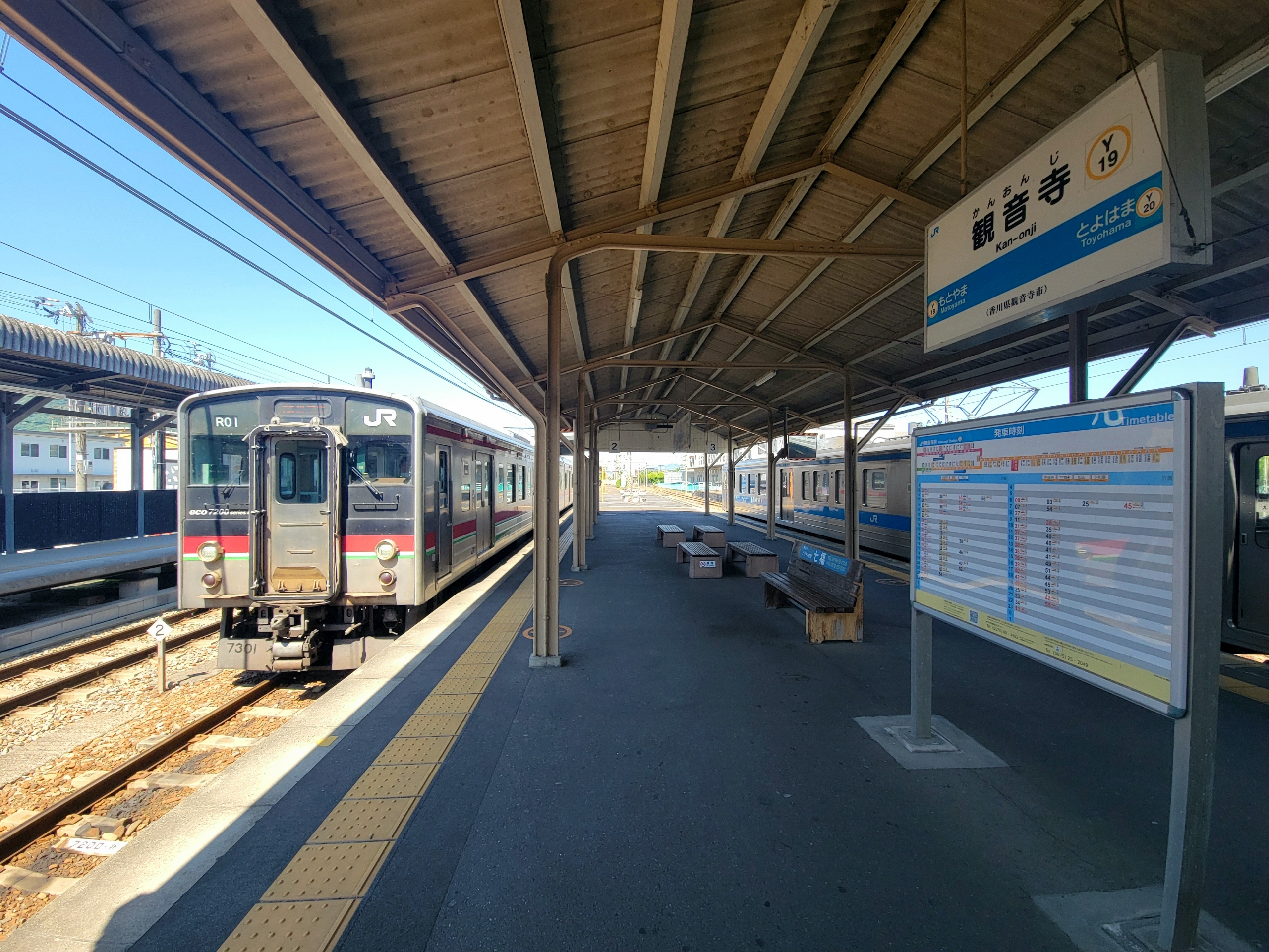 日本で一番面積の狭い香川県ですが、意外と時間がかかりました。香川県の西の端、観音寺駅からほぼ中央に位置する高松まで、各駅停車で19駅、1時間13分。