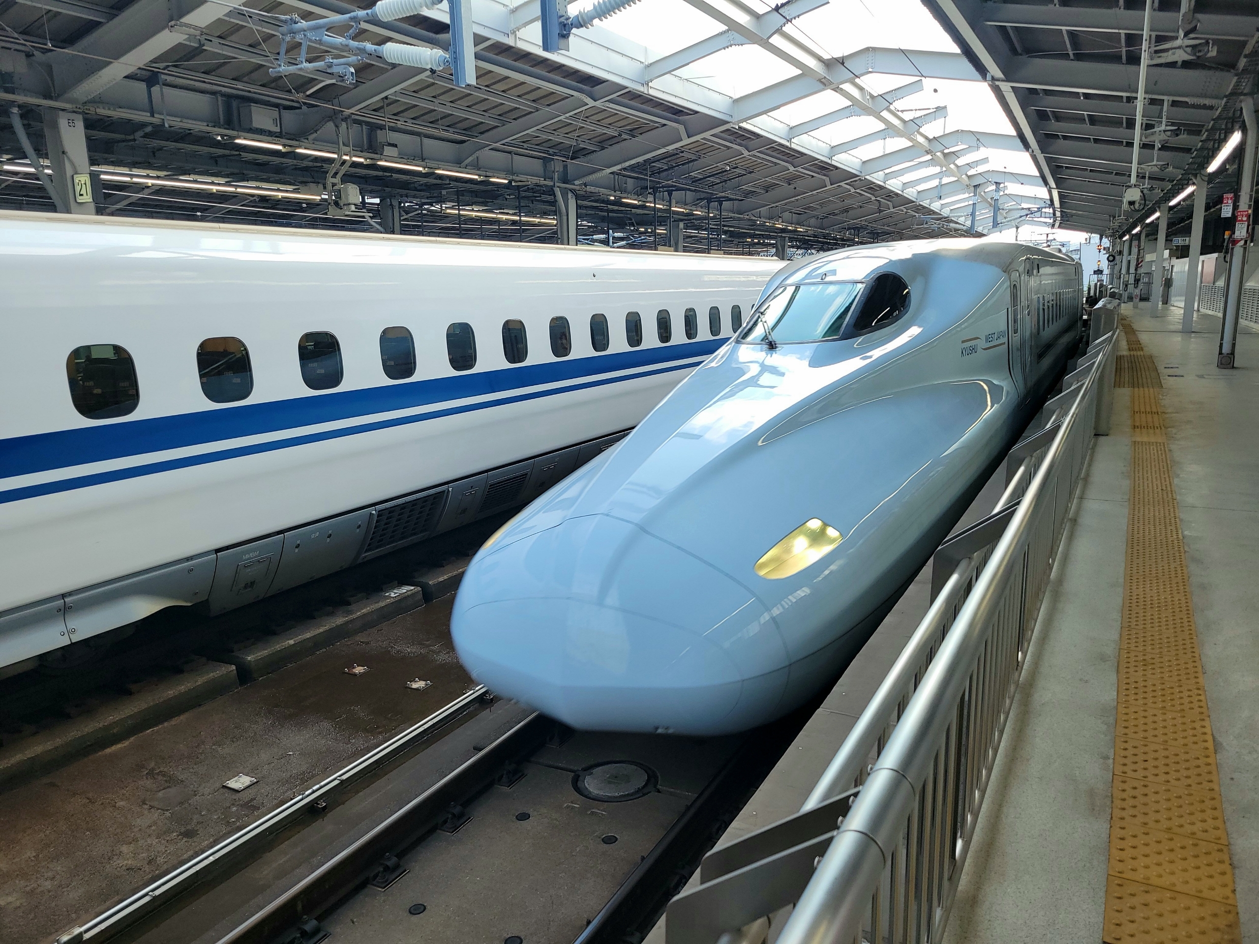 車両は、山陽新幹線から九州新幹線へ直通するN700系7000番代・8000番代で、少し青みがかった車体が特徴です。7000番代がJR西日本所有、8000番代がJR九州所有という違いだけで、車両自体に違いはありません。