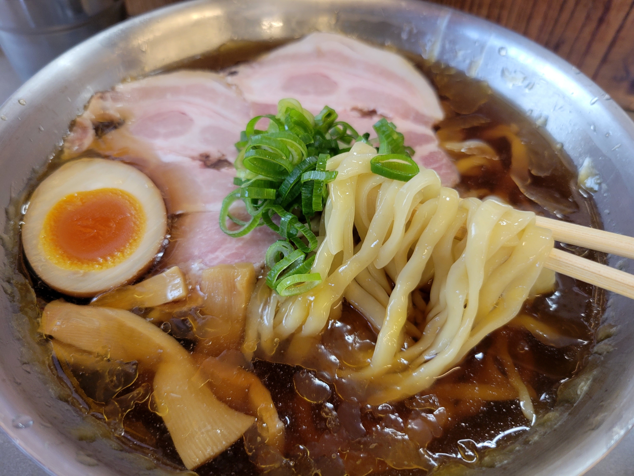 透き通ったスープに、丁寧に盛り付けられた麺。細麺も選べましたが、平打ち麺をチョイスしました。