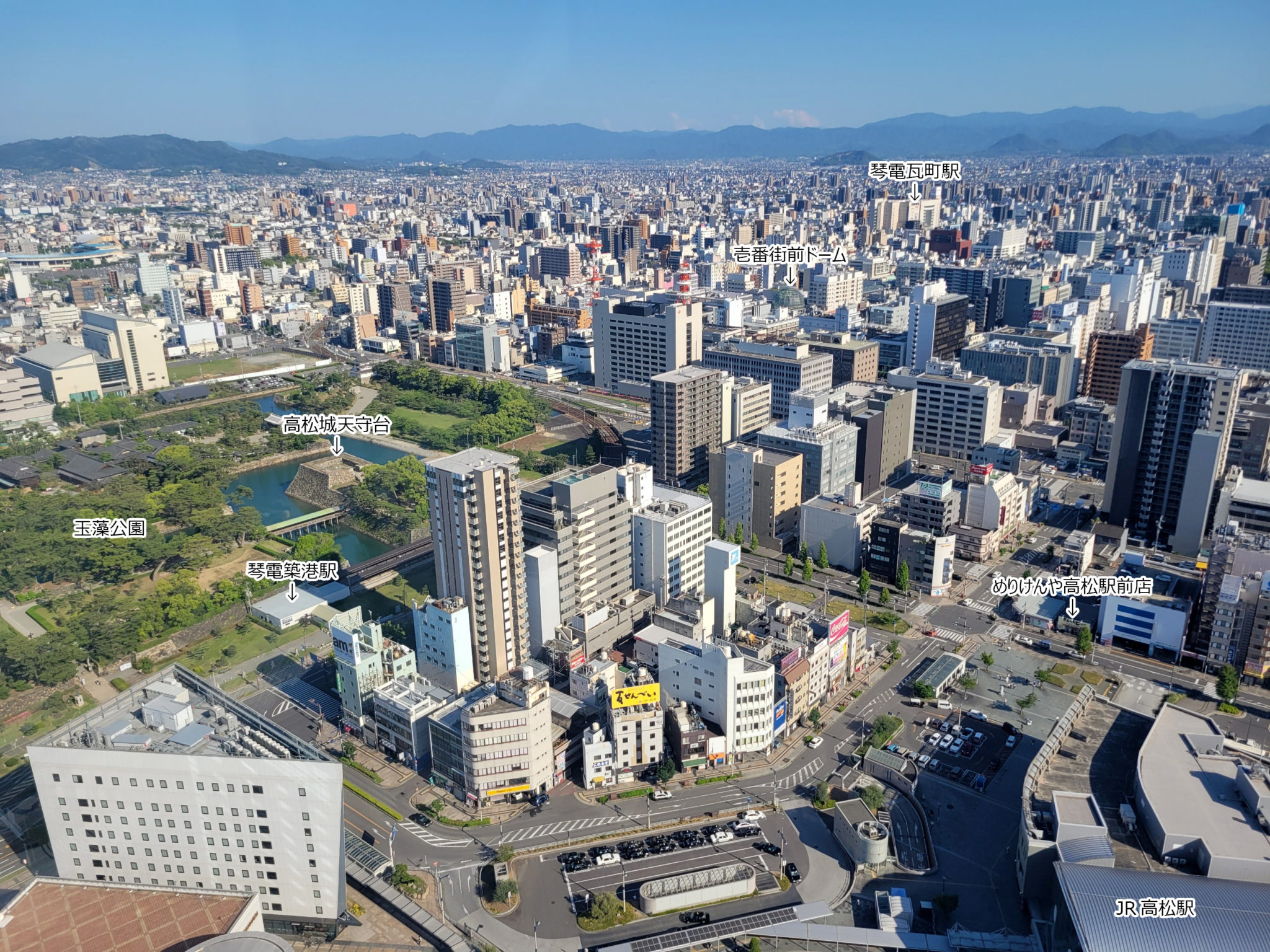 展望室のガラス越しに、南側の景色へと目を向けます。高松市の中心部—丸亀町や瓦町方面—に広がる市街地は、想像以上に高層ビルがひしめき合い、奥まで建物が途切れません。この都会的な密集ぶりに、私は軽い衝撃を受けました。