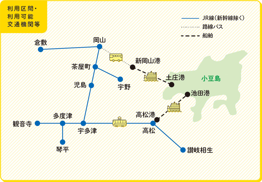 先月(5月)にtabiwaの周遊パスを使った旅行が有意義で楽しかったので、今月もtabiwaを使って、今度は香川県をメインに出かけることにしました。『岡山香川ワイドパス』は実際には香川県全体でJRが利用できるに比べて、岡山県はわりと一部です。あと小豆島に行くこともできるので船に乗ることもできます。魅力はなんといっても3日間で3,600円という安さ。