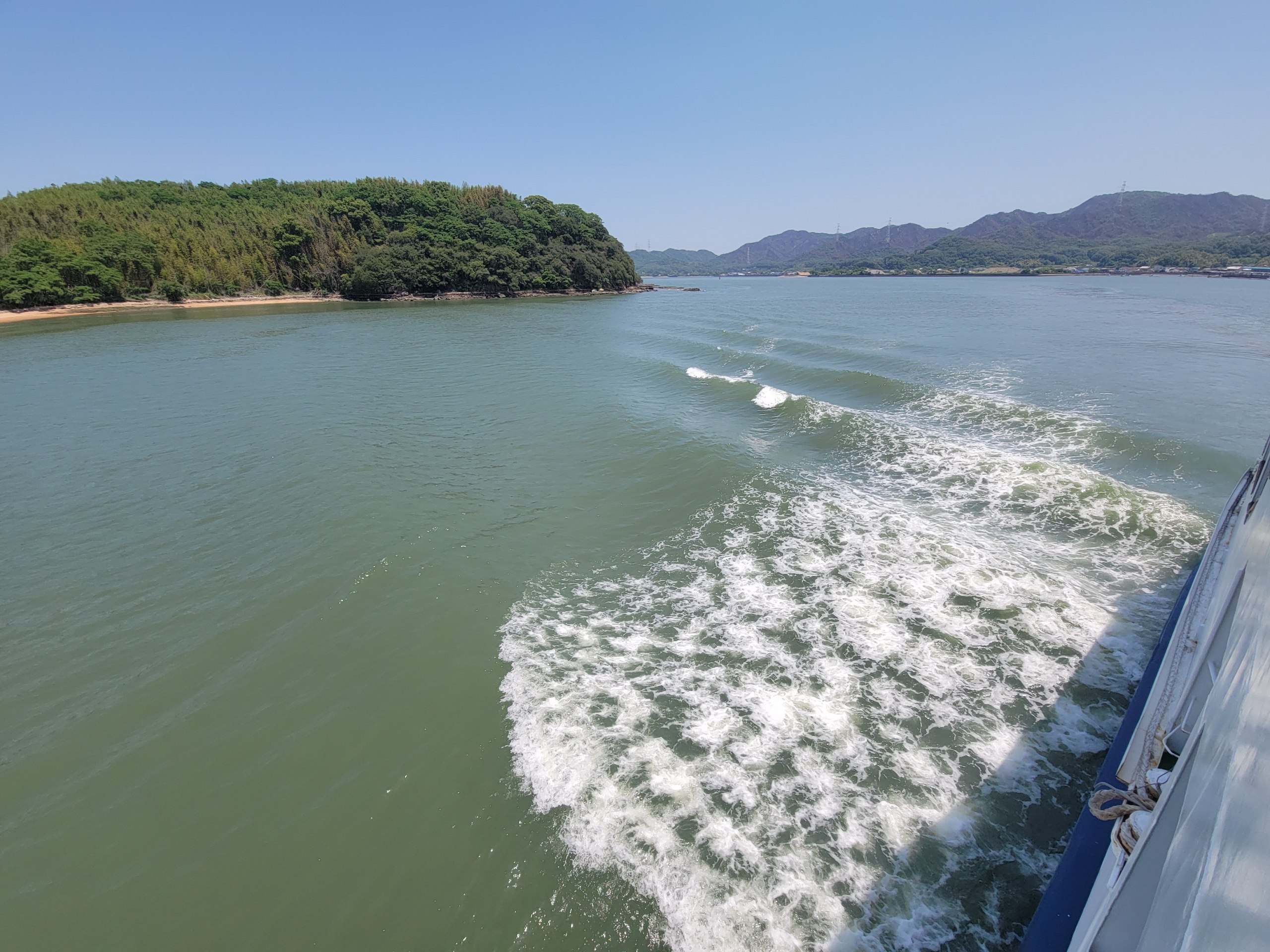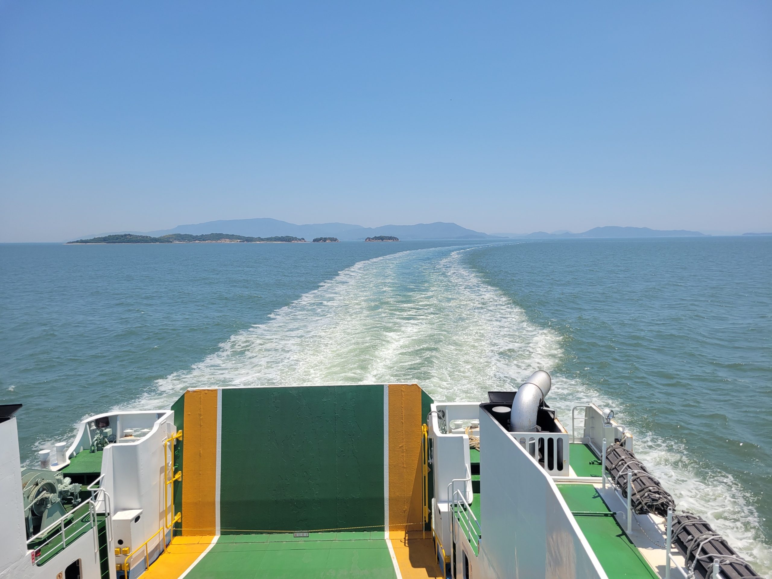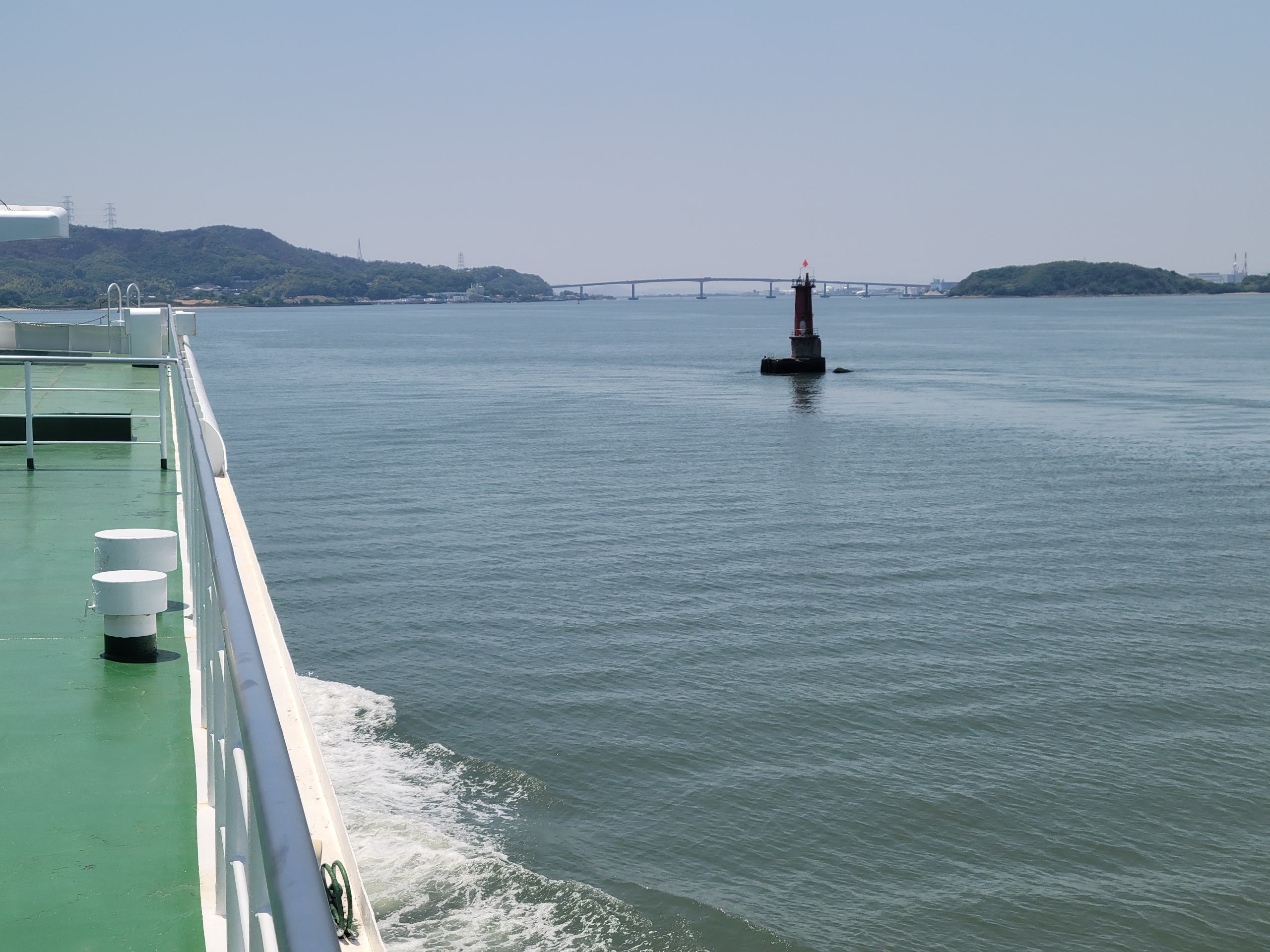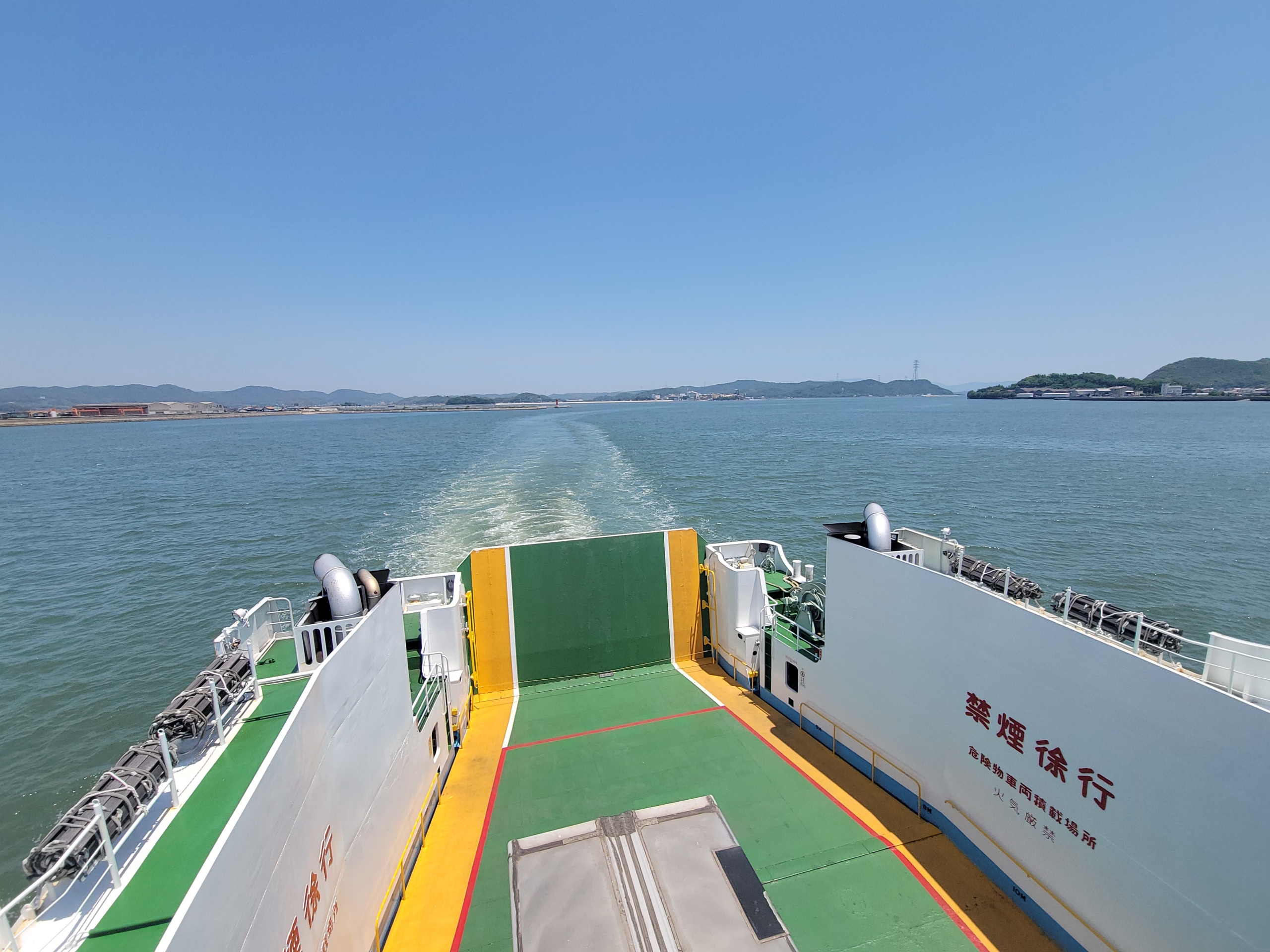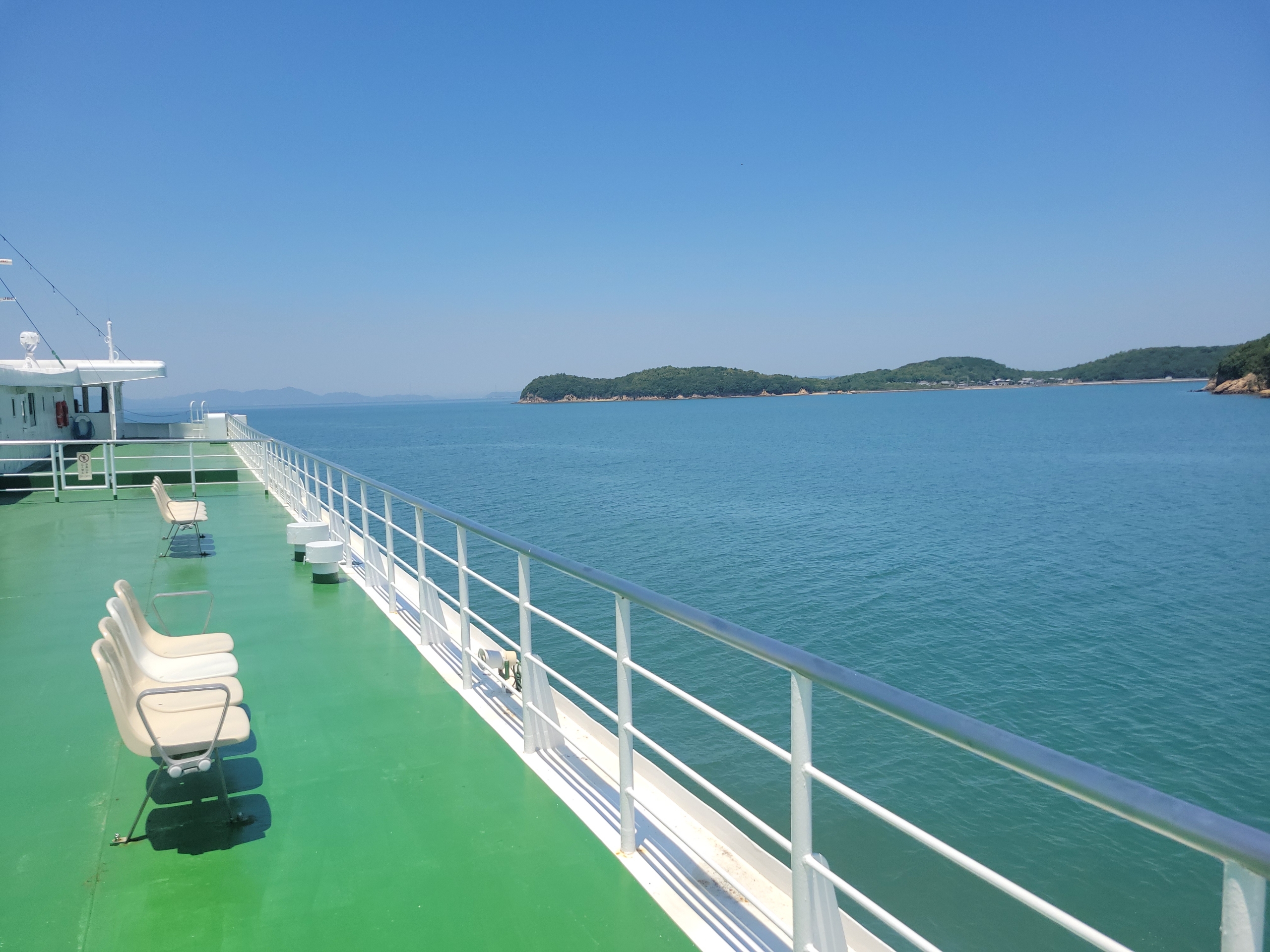 フェリーの進む風が当たって、甲板の上で景色を眺めていると気持ちよすぎるけど、日焼けはやばいだろうな。瀬戸内海は島が多いので景色を見てても飽きてこないのが良いですね。とはいっても乗客の大半は、客室で寝てましたけど。