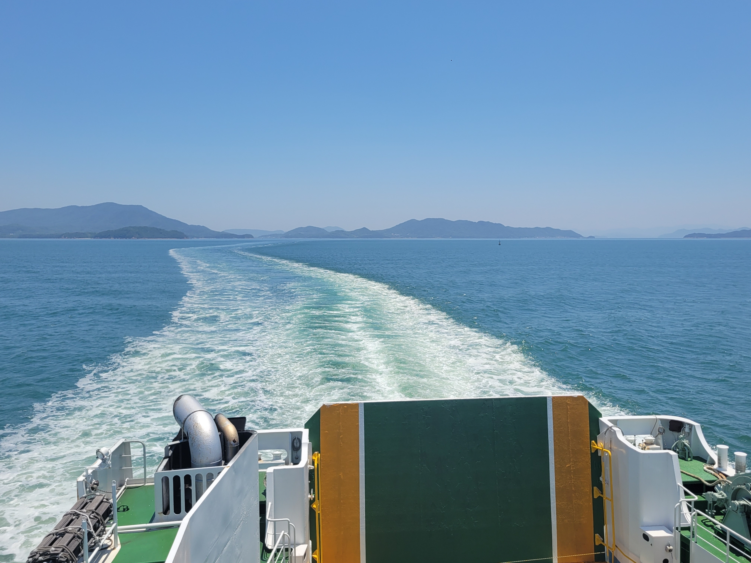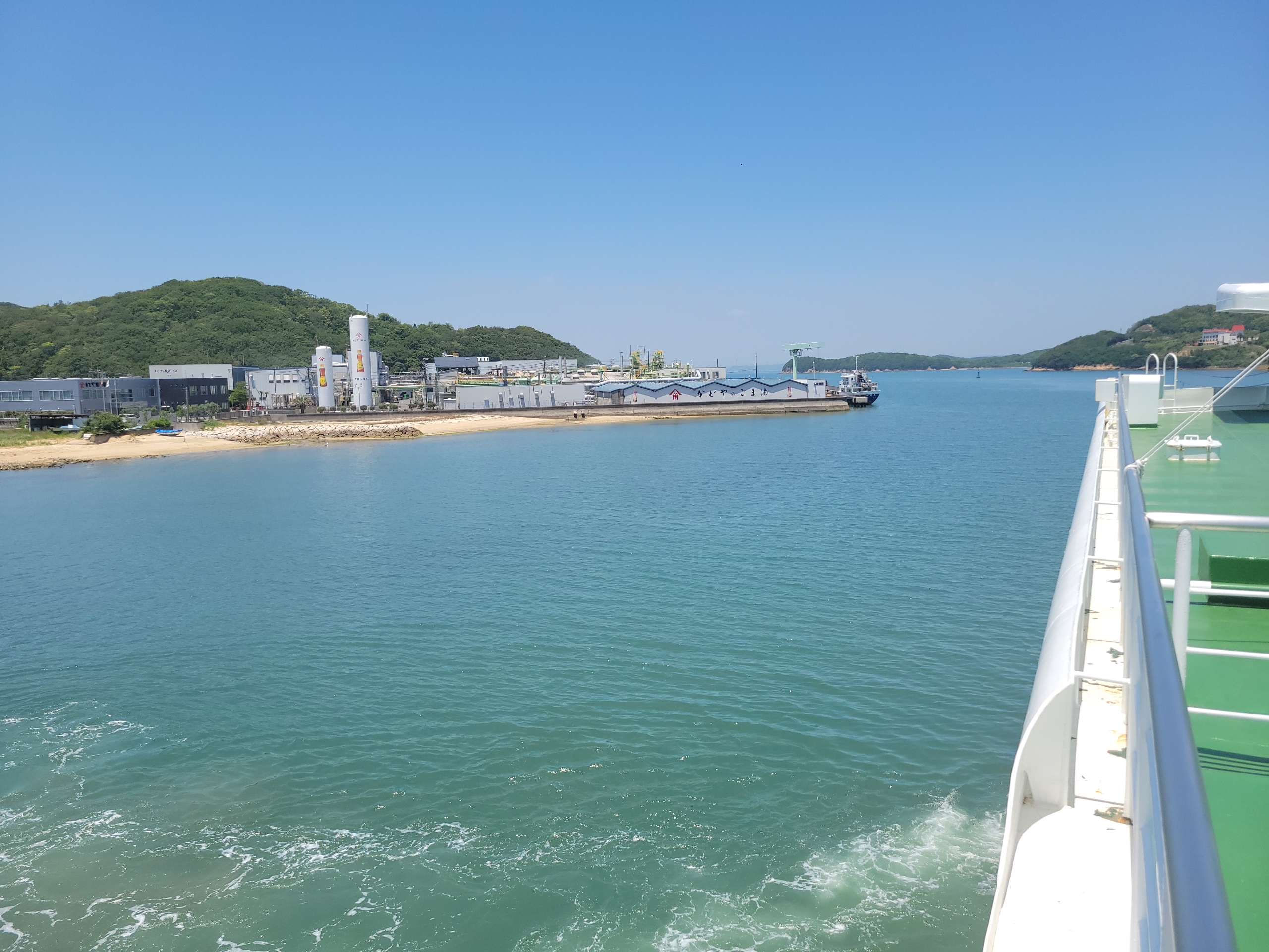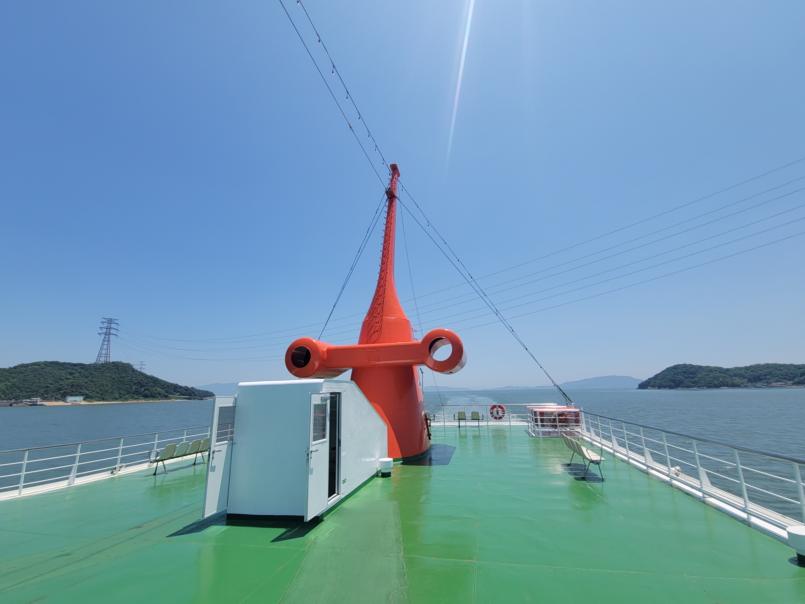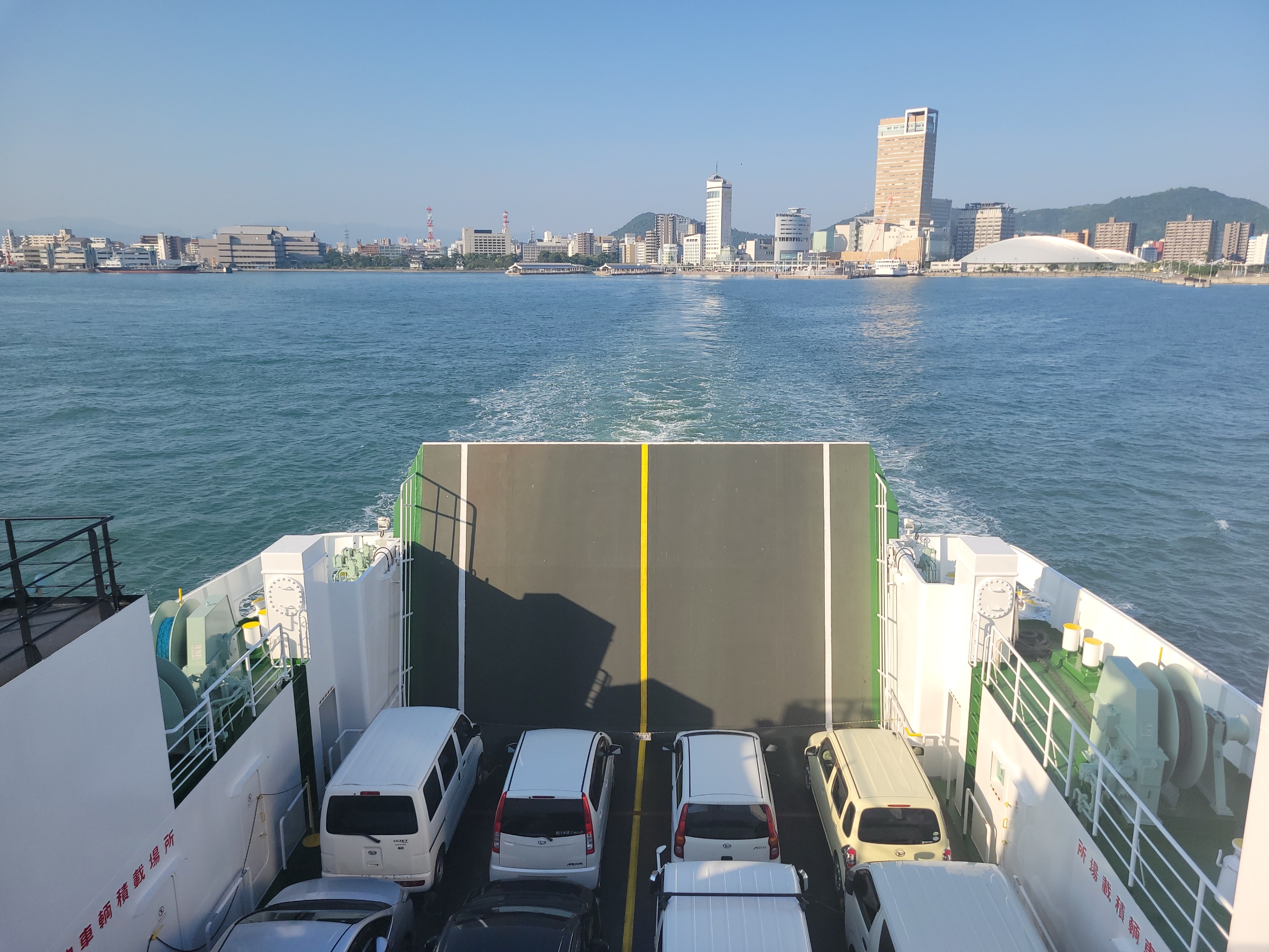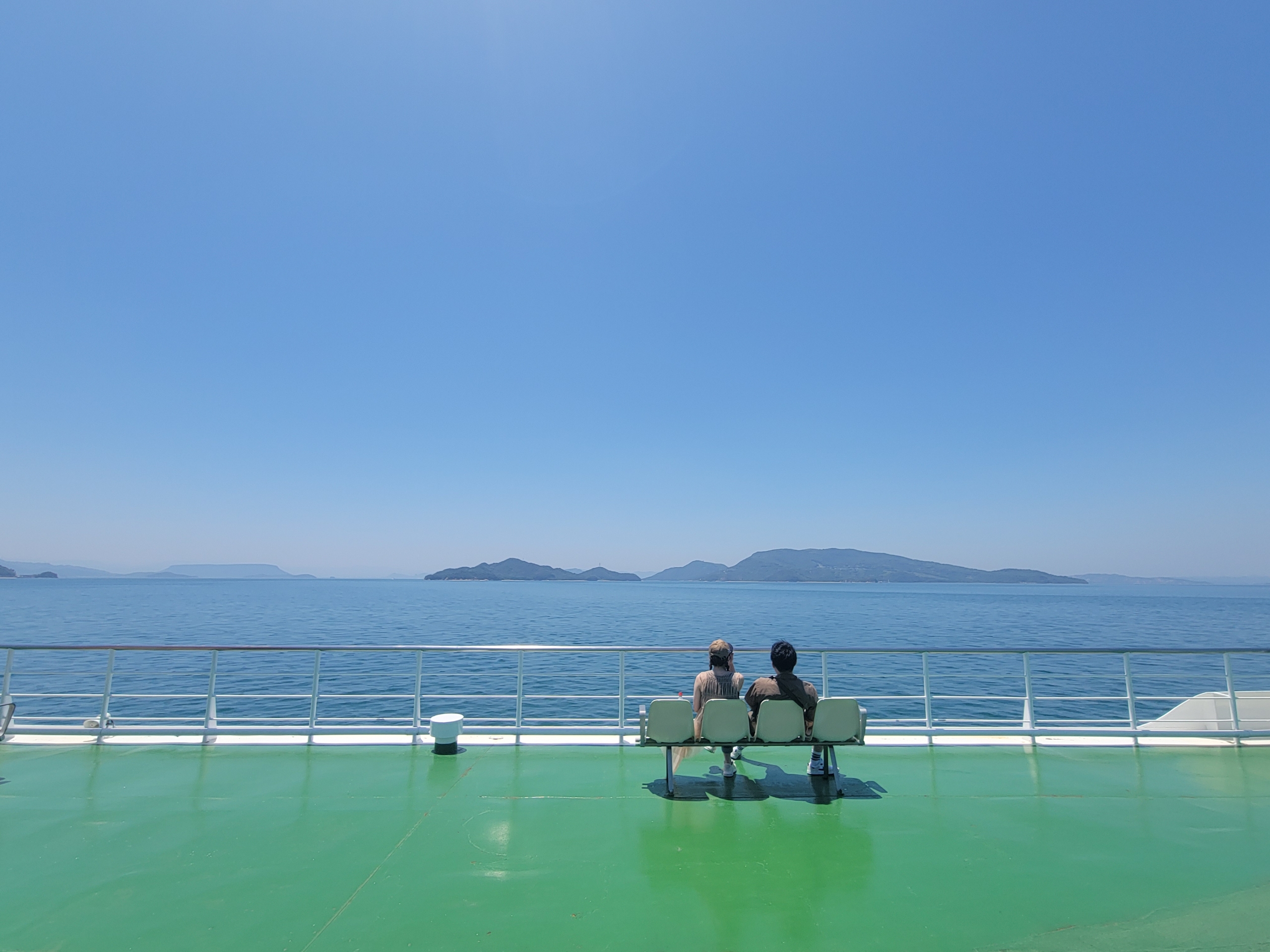 フェリーの進む風が当たって、甲板の上で景色を眺めていると気持ちよすぎるけど、日焼けはやばいだろうな。瀬戸内海は島が多いので景色を見てても飽きてこないのが良いですね。とはいっても乗客の大半は、客室で寝てましたけど。