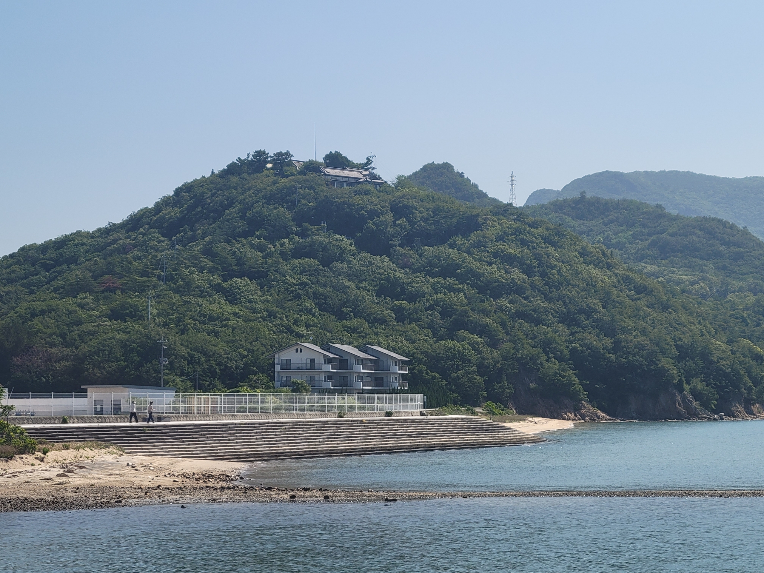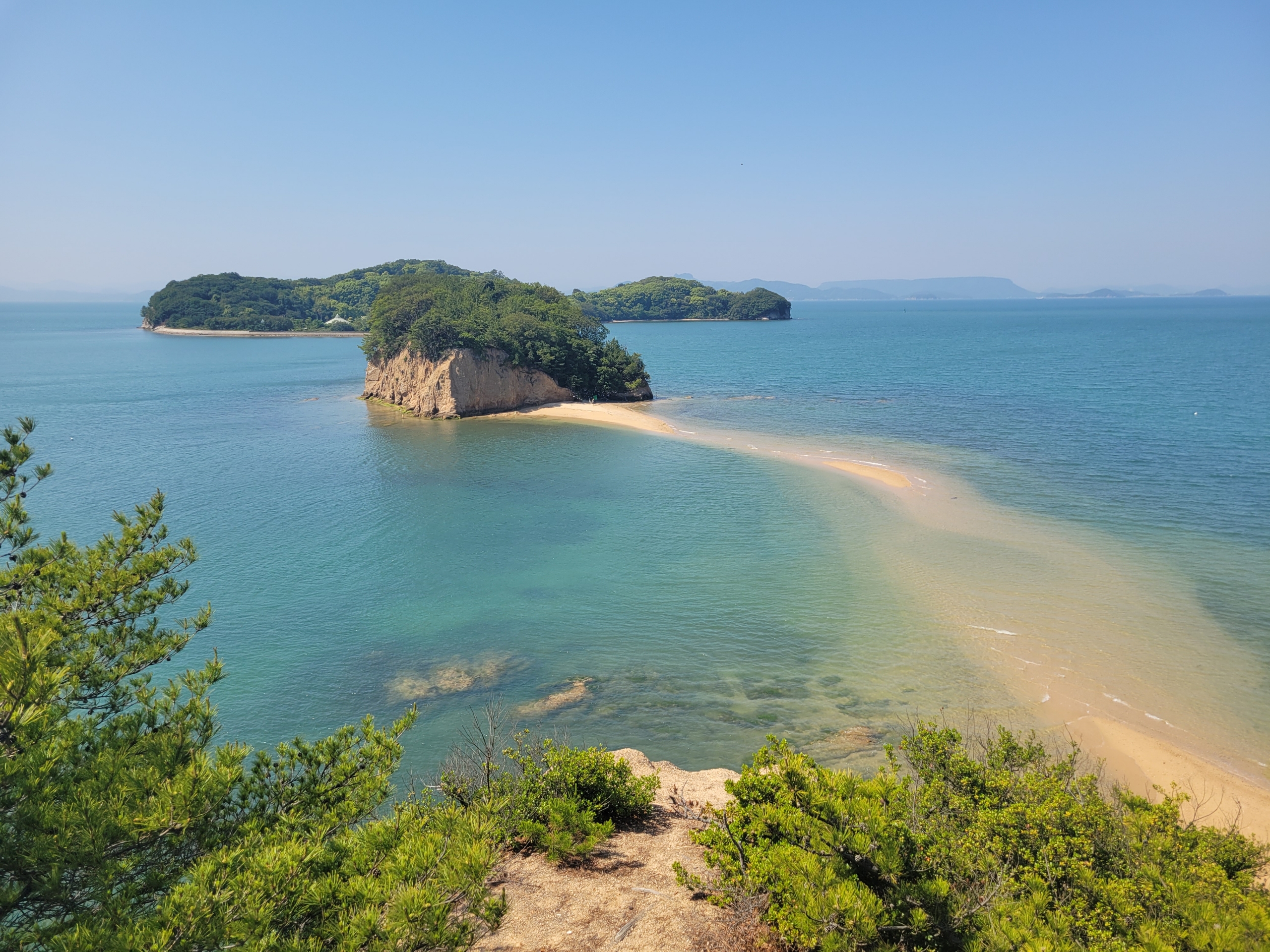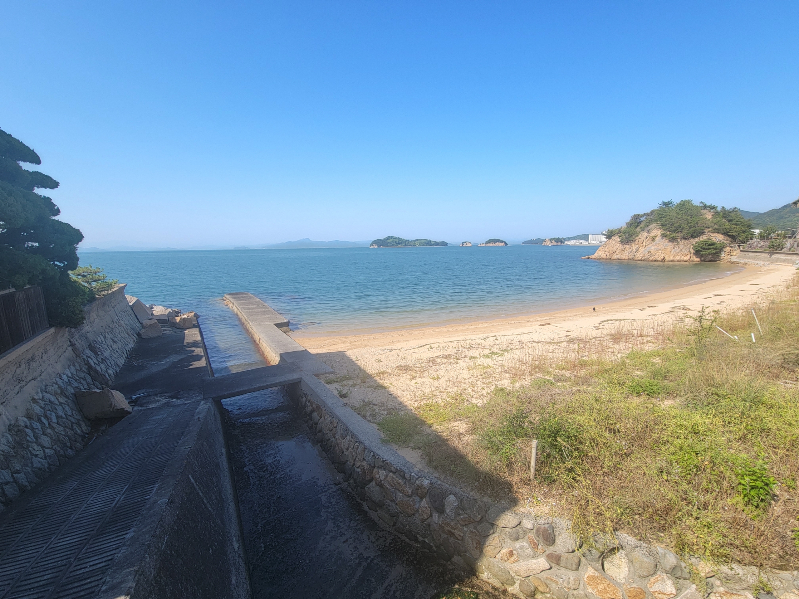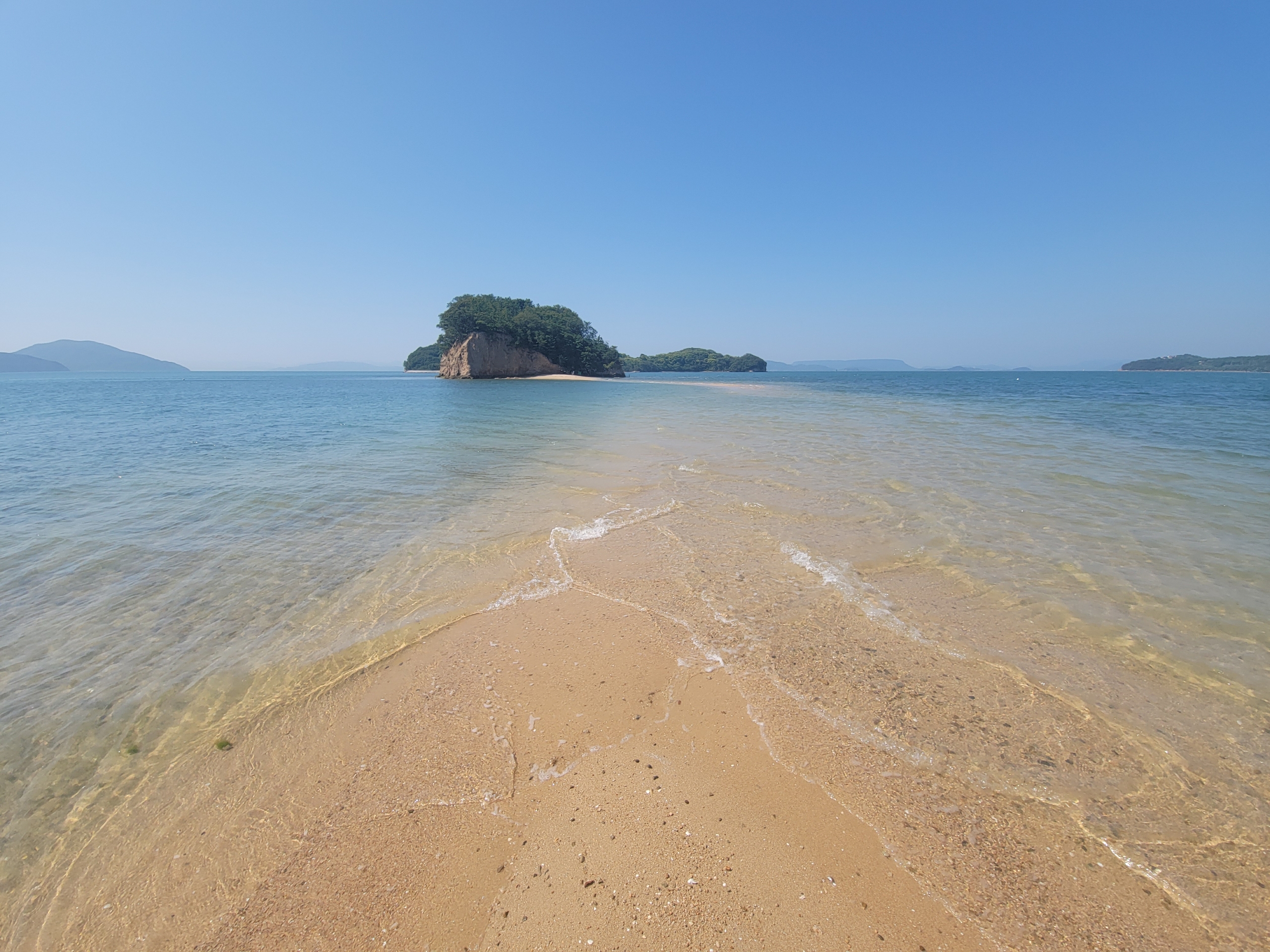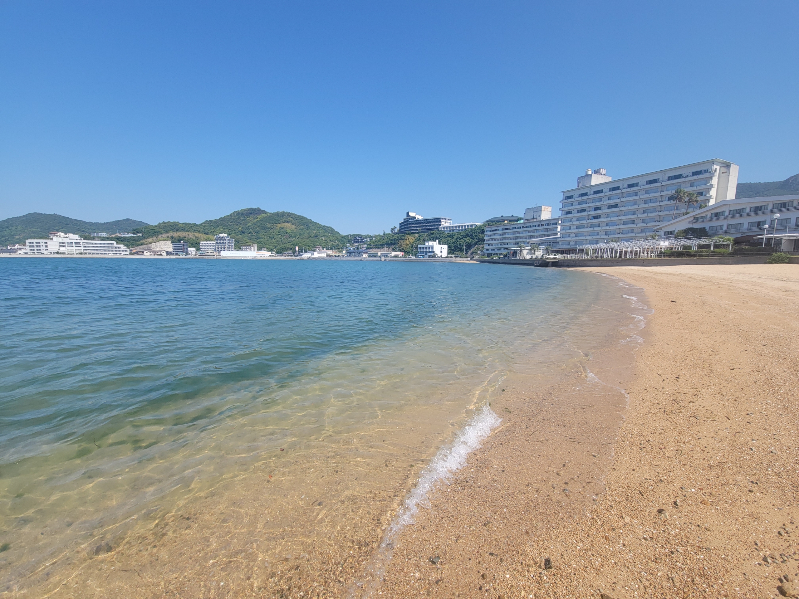 エンジェルロードがつながるビーチ。右にあるのは小豆島国際ホテルで、何度か添乗で来たことがありますが、エンジェルロードまで足を運んだことは1度もありませんでした。ほかにもホテルっぽい建物がいくつか建っていますね。