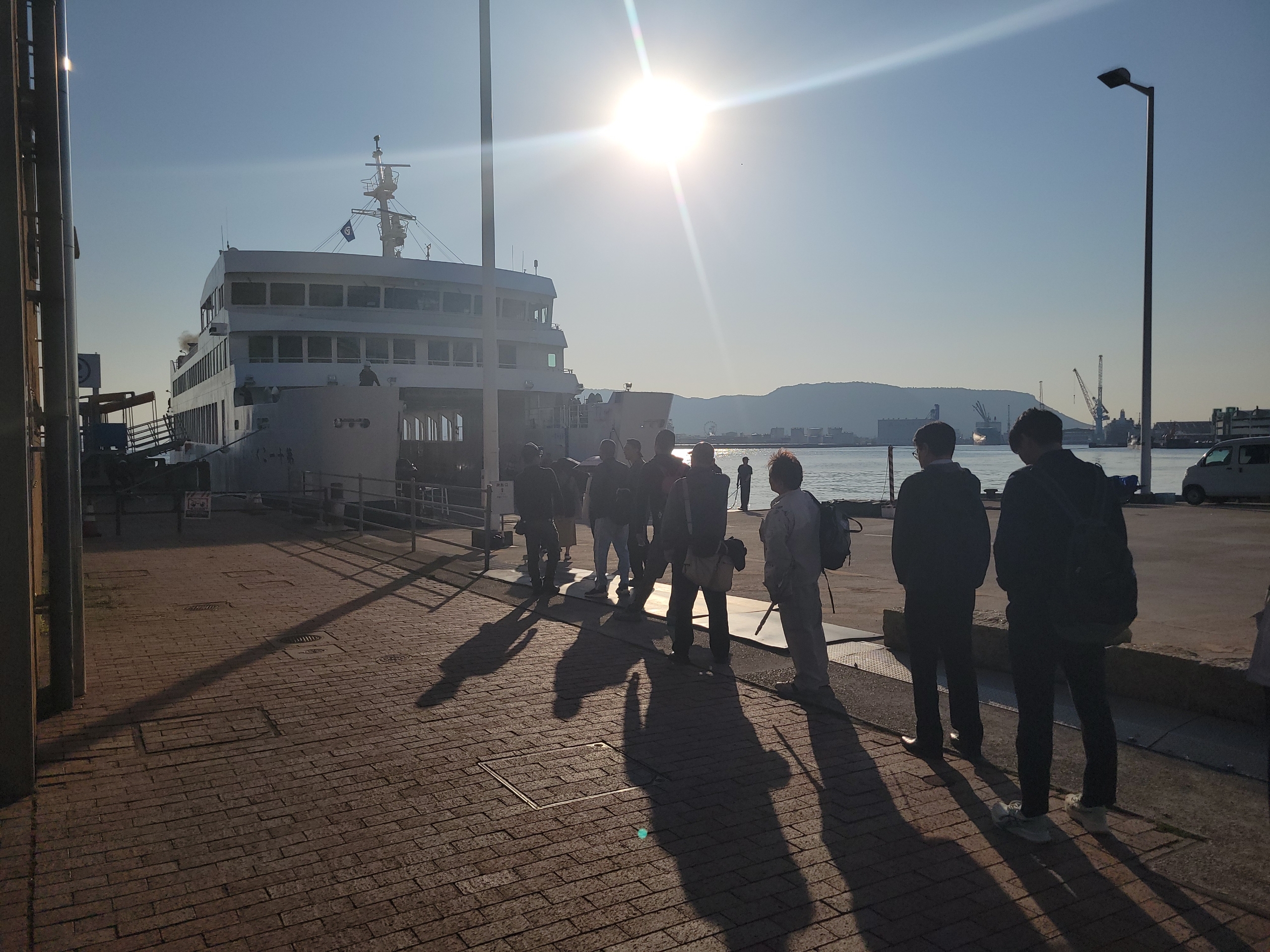 高松港、本日最初の池田行きのフェリー。すでに乗船待ちの長い列ができています。やはり高松駅から高松港は微妙に距離がありますね…。googlemapでは500m8分と表示されます。