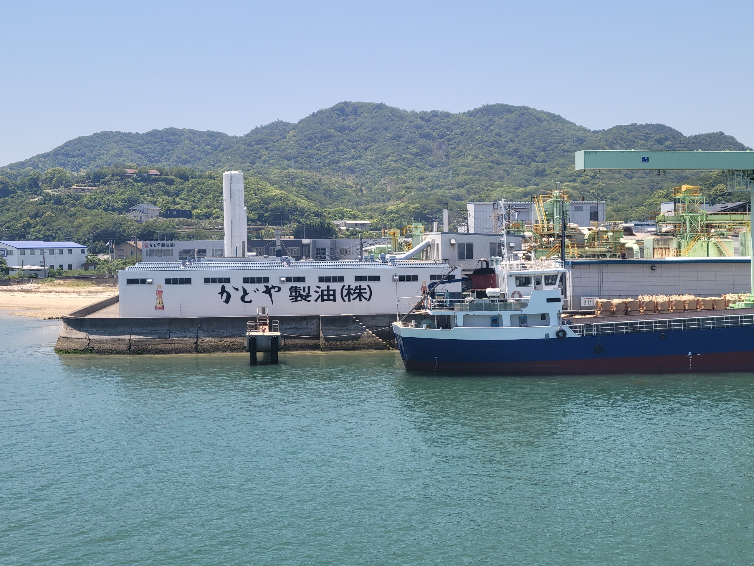 すでにフェリーターミナル周辺まで香りがきてたのですが、ごま油で有名な「かどや」の製油工場がすぐ近くにあります。小豆島の名産品のそうめんを作る際には、食用油が必要なのですが、小豆島ではごま油を使うのが特徴のようです。それに目を付けた創業者が小豆島で事業を始めたのが始まりだそうです。