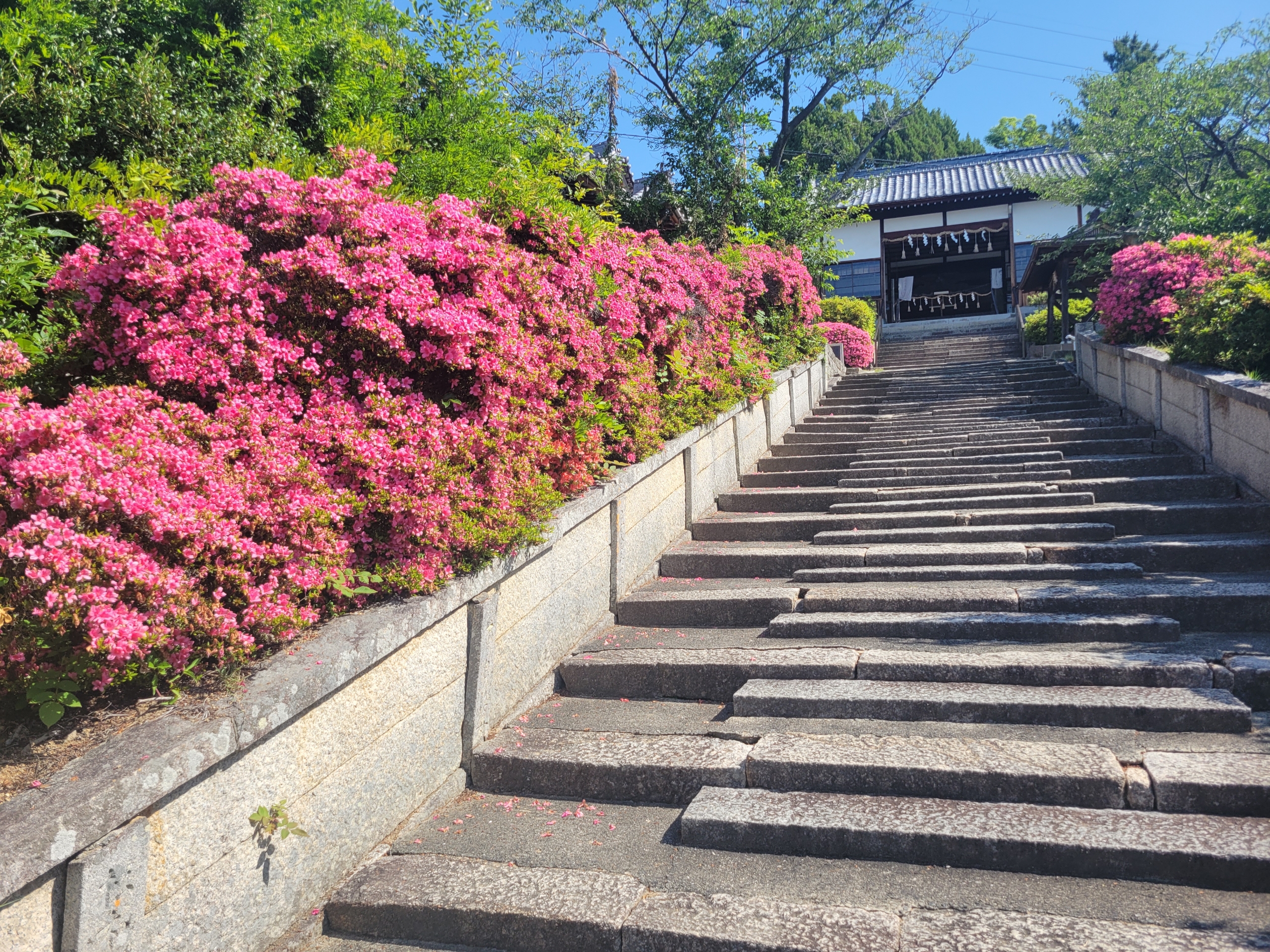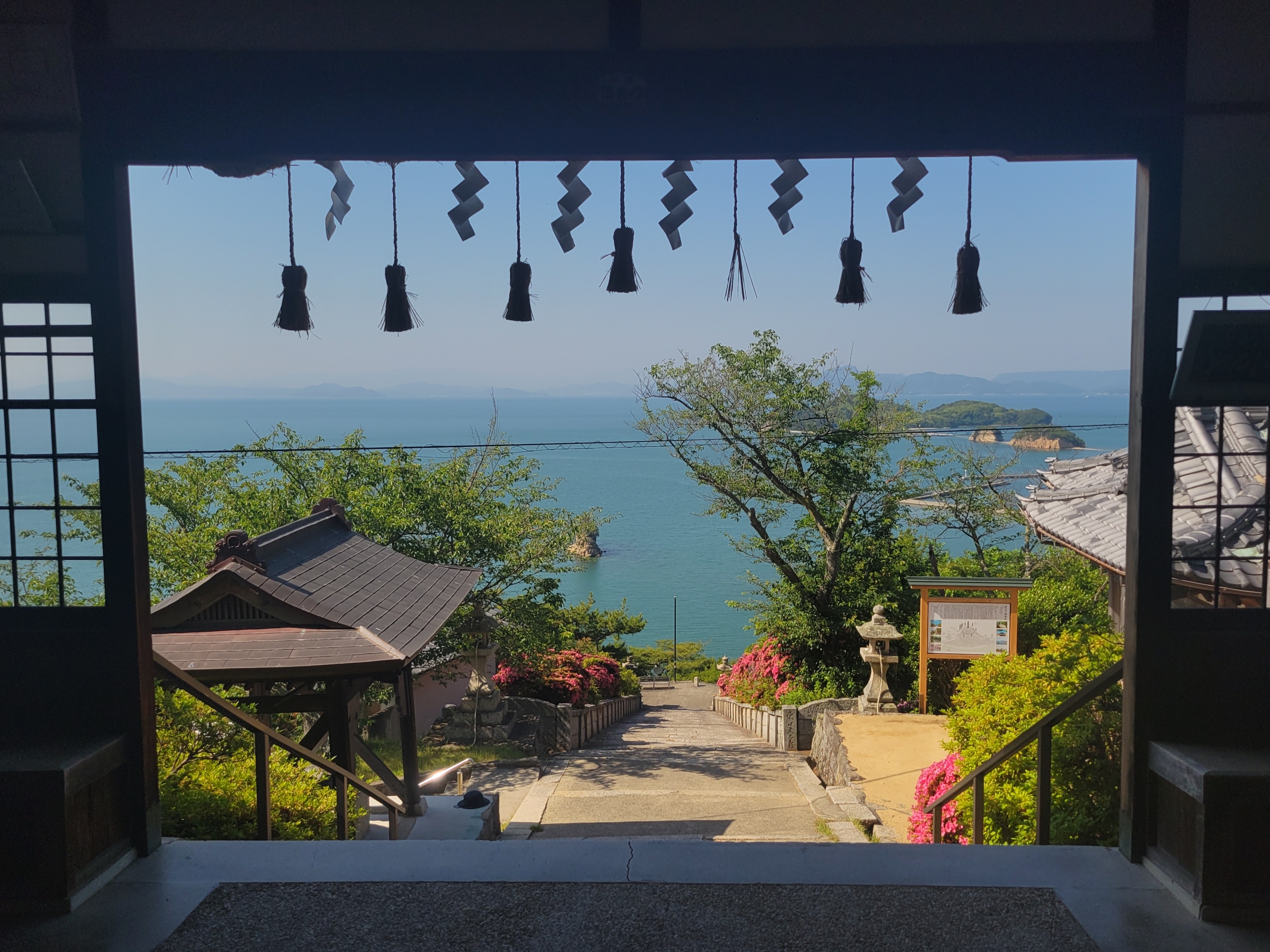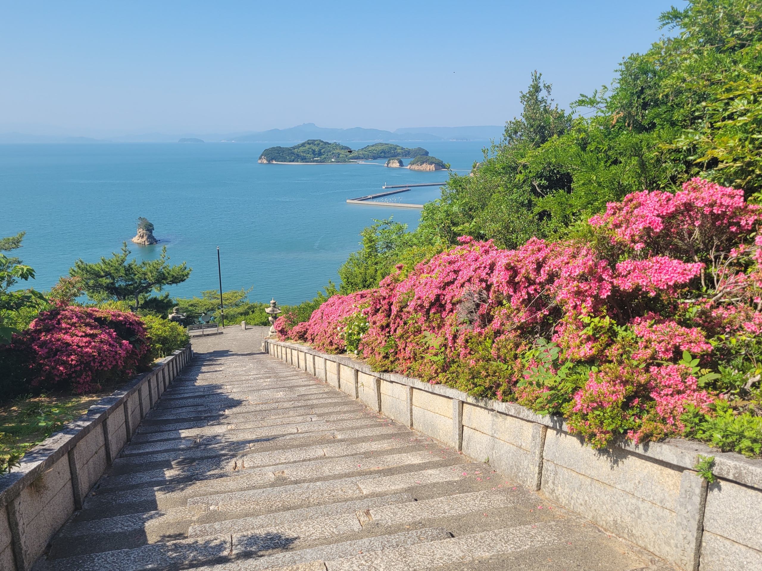 参道脇のツツジが満開。海に向かって伸びる参道を降りて、右に曲がると土庄の市街地にでるようです。ツツジと淡い瀬戸内ブルーとコントラストが美しい。