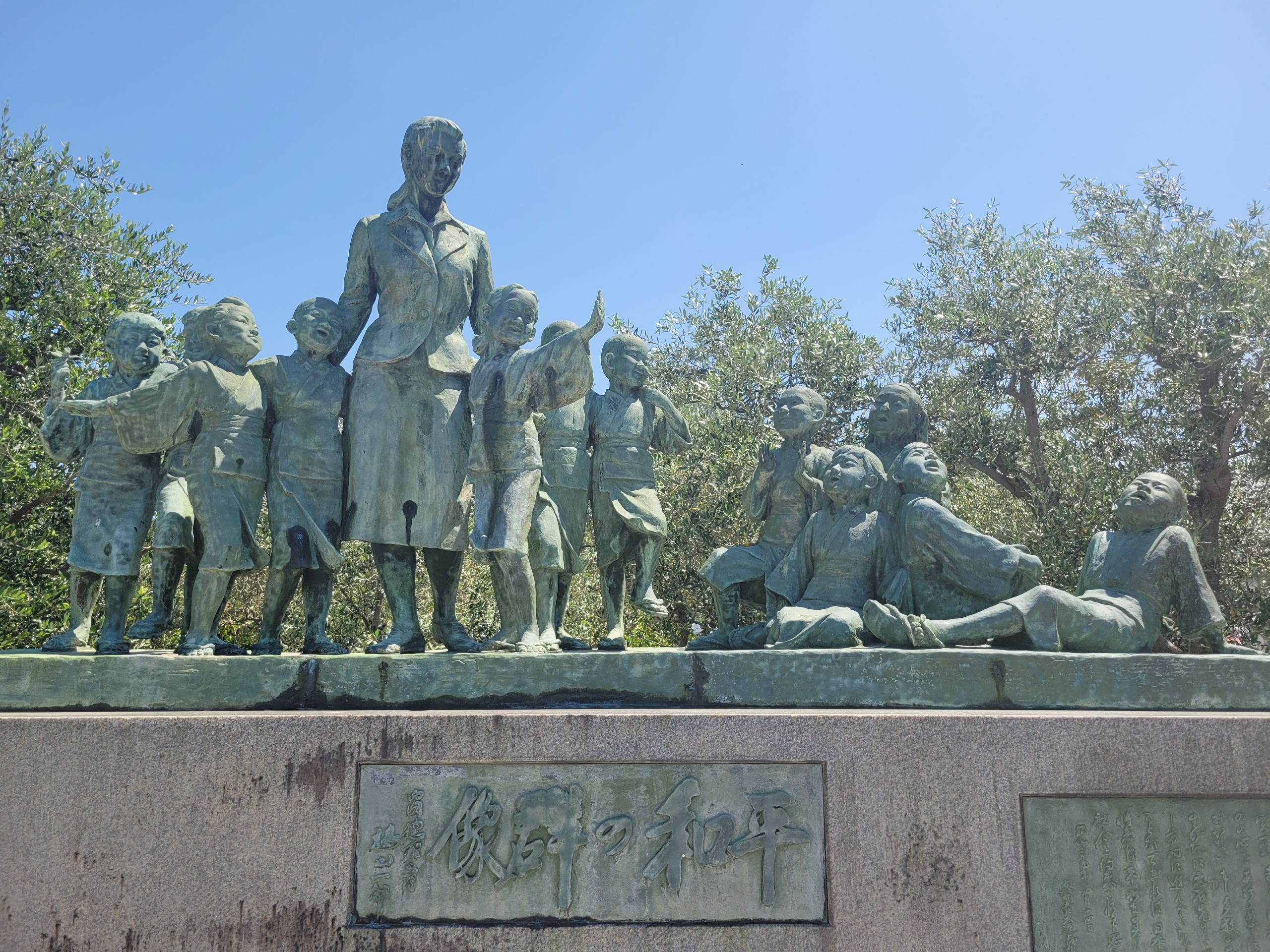壺井栄さん作者で小豆島を舞台にした女性教師と12人の生徒を描いた二十四の瞳という小説があり、過去に映画になりました。戦時中の物語だから、「平和の群像」という名前なのでしょうか。その撮影セットを使った二十四の瞳映画村があり、何度か添乗で訪れたことがあるけど、映画の内容がまったく記憶にありません。ほんとなにも知らずにコースにいれてたのだから、今思えば恥ずかしくもあります。