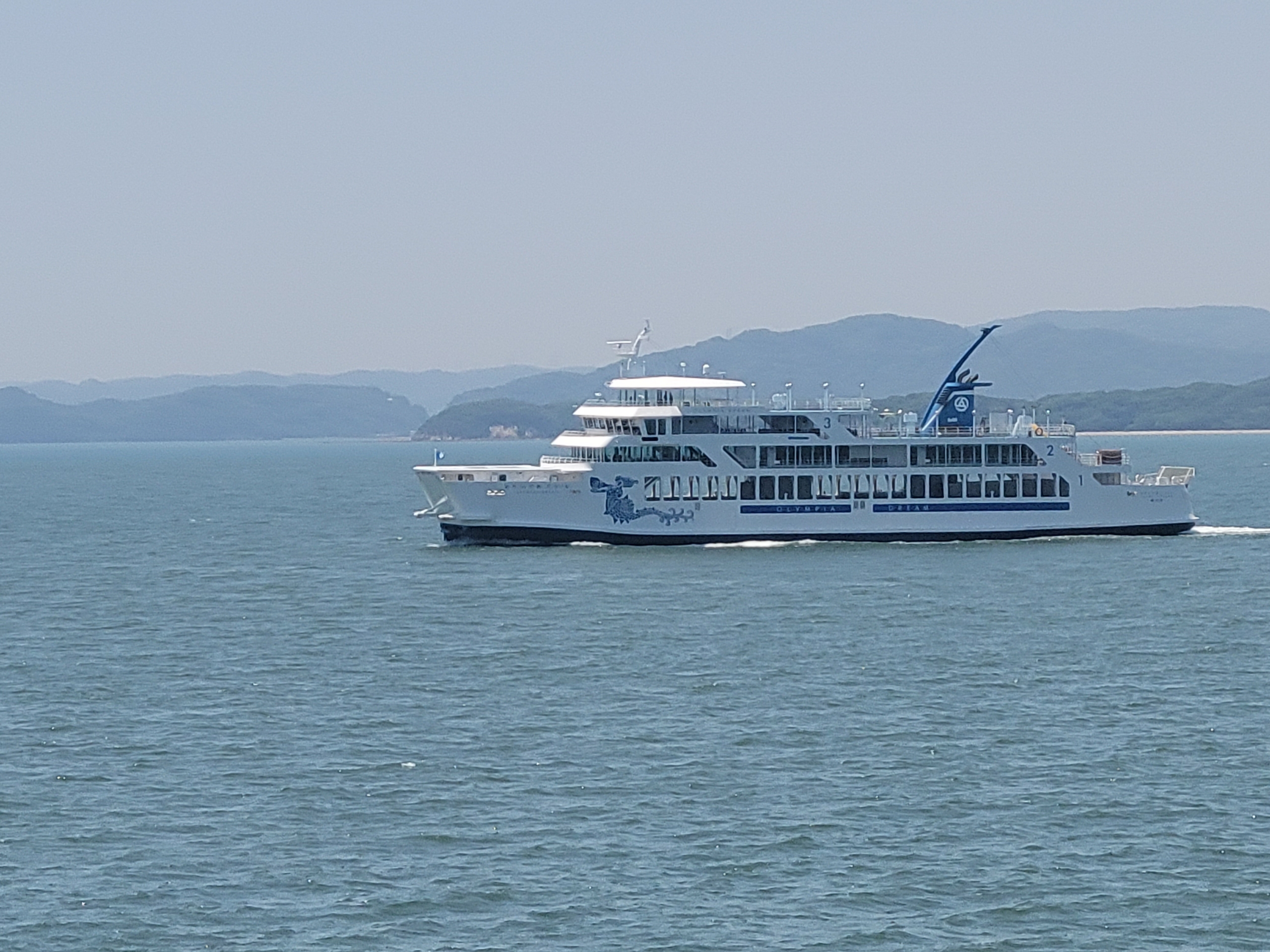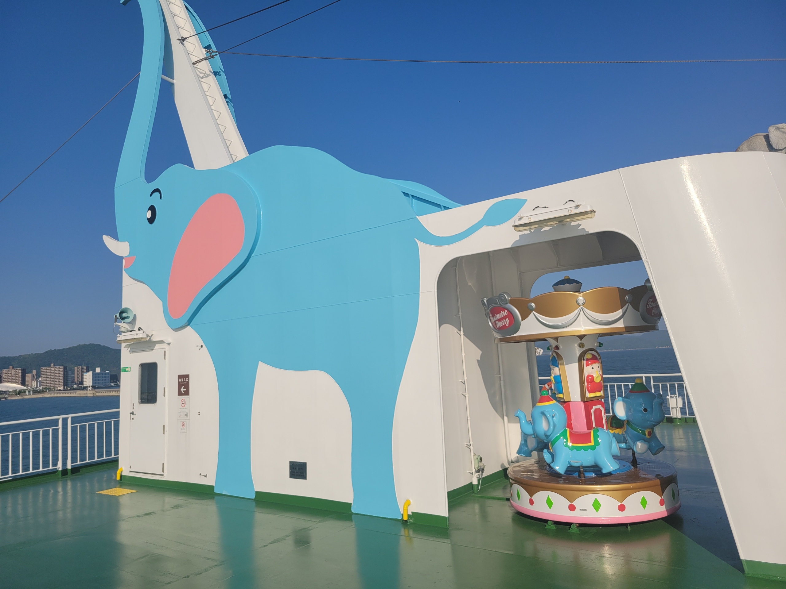 姉妹船とすれ違います。「おりんぴあどりーむ」はJR九州の列車をよくデザインされている水戸岡鋭治さんが手掛けたそうで、海の上を走る遊園地がテーマだそうです。甲板にメリーゴーランドや滑り台が設置されているそうです。