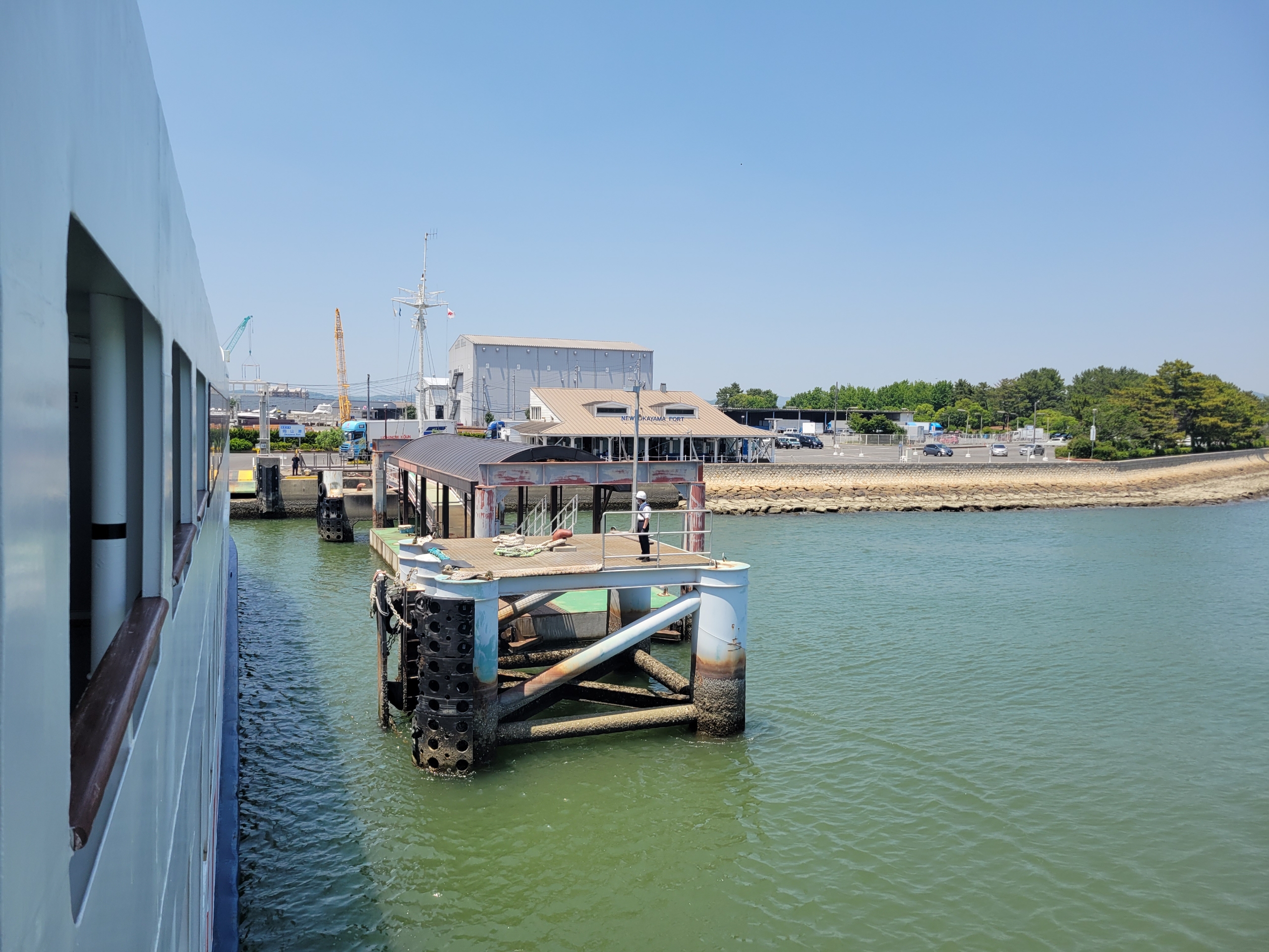 干潮時だったので、一階の甲板から降りるとき、上り坂になってました。これだけ干満差が大きいと浮き桟橋を使うことが多そうなんだけど、新岡山港は違いました。