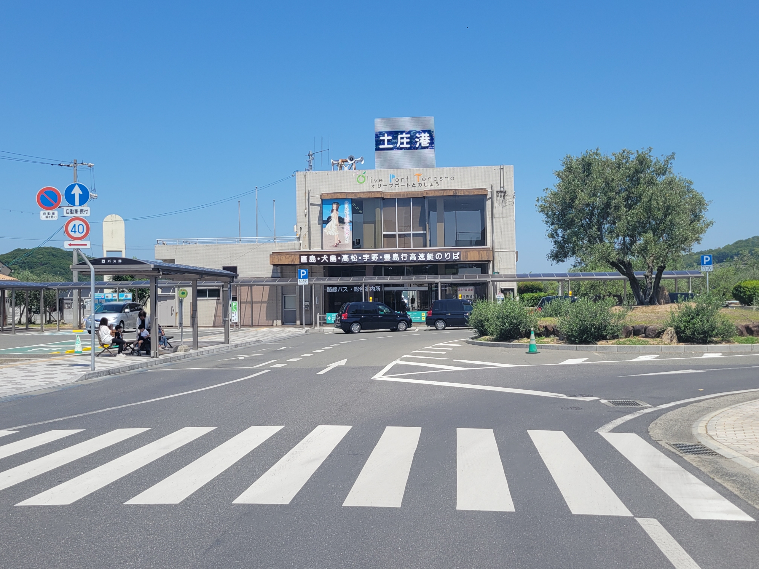 土庄港と書かれたこちらの建物は旅客船用のターミナル。高速船は高松港との間を30分で結び、フェリーに比べ半分の時間です。ほかに豊島経由で宇野への航路もあります。フェリーターミナルはもうすぐ西にあります。