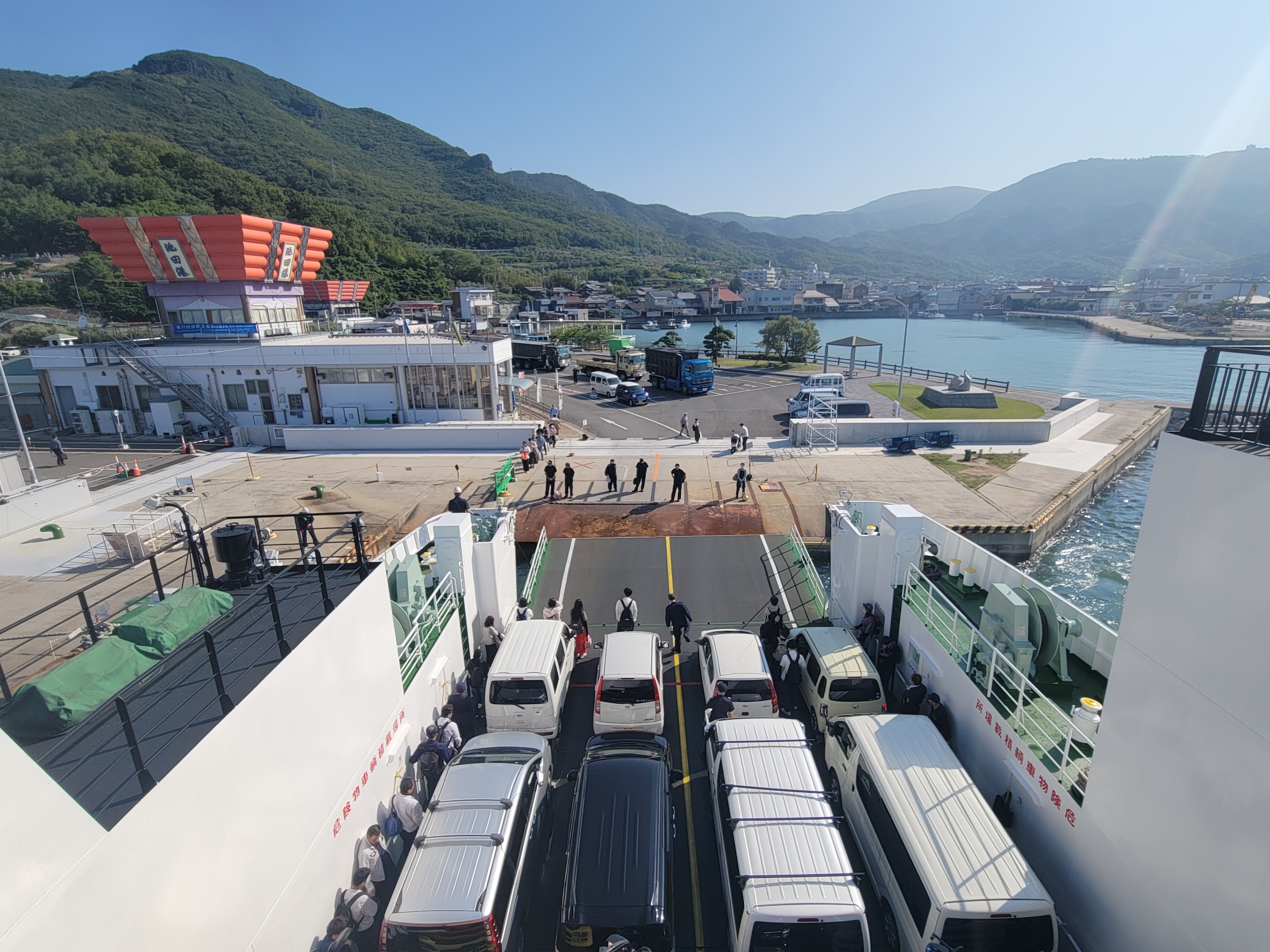 車両もたくさん積載されているようです。土木建築に携わるような工事関係者の人も多く見かけましたから、この一番船は車の利用率も高そうです。