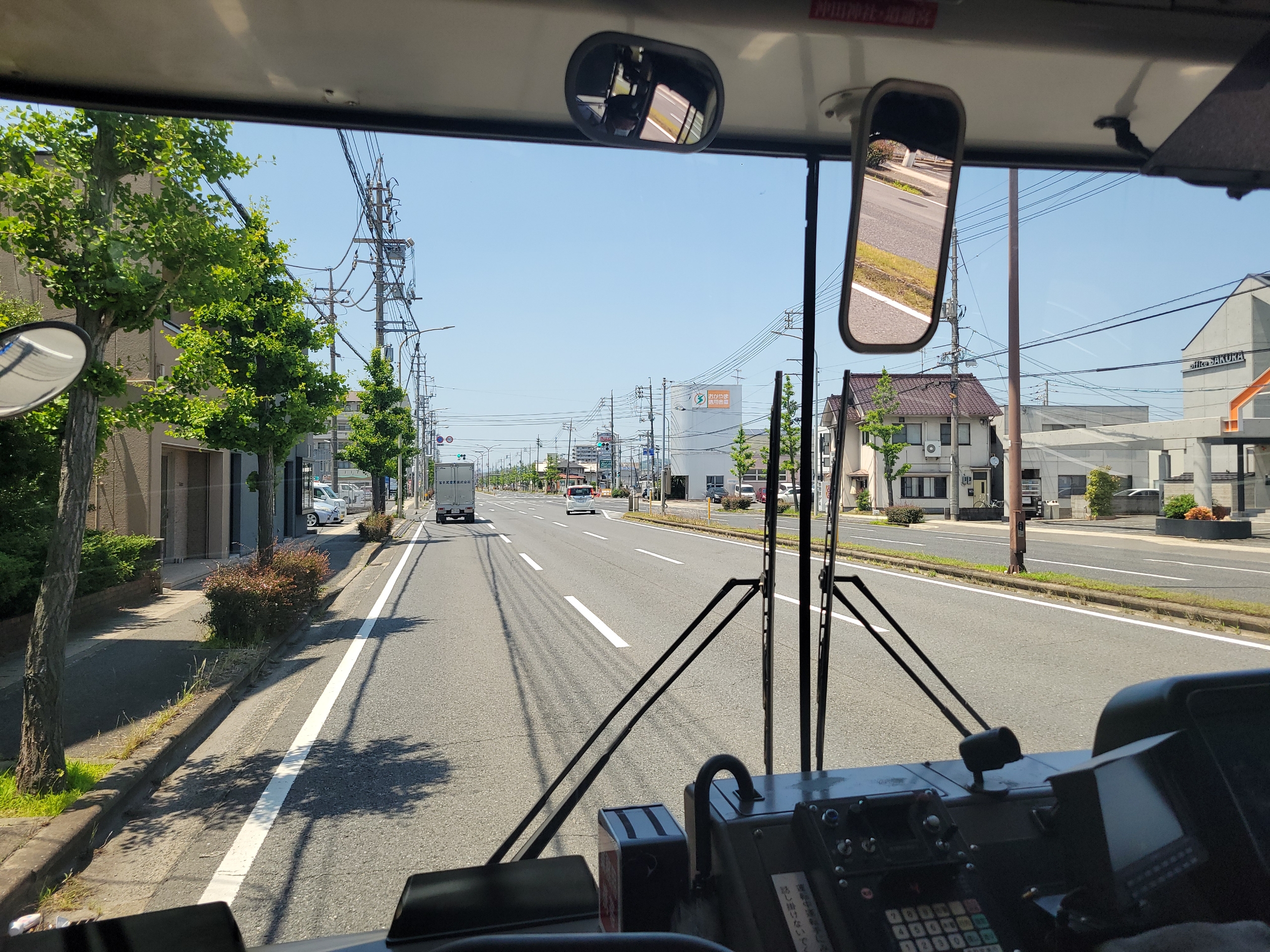 訪れたことないエリアなので最前列から景色を眺めます。新岡山港からの乗客は10人弱。片側三車線の大きな幹線道路を進みます。フェリー利用者向けの路線かと思っていたら、途中からどんどん乗車してきて、立ち客多数で車内は混雑しました。