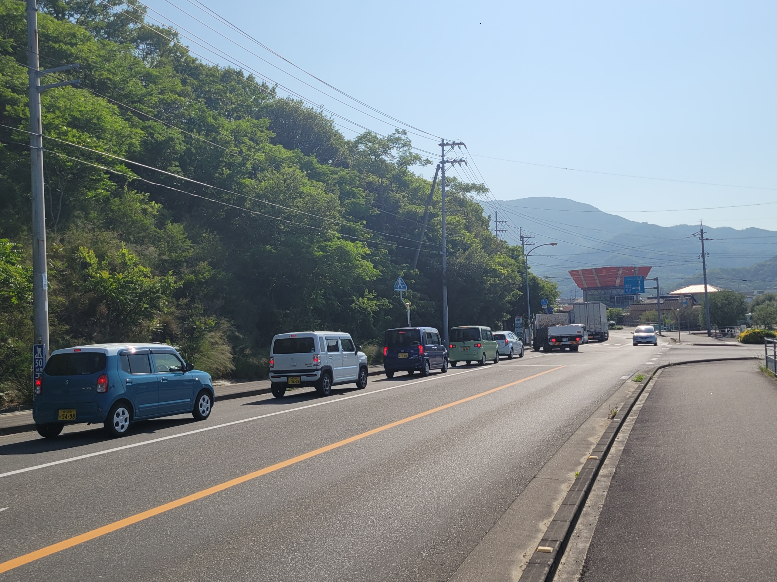 フェリーからたくさんの車輌が吐き出されてきたので、長い渋滞が発生しています。この先の交差点で、土庄町から旧池田町と旧内海町へ向かう車と、フェリーから降りてきて旧内海町へ向かう車が、がっちゃんこしたんですよね。2021年までは内海町にある草壁港へも高松港からフェリー便があったのですが廃止された影響なのでしょう。さすがにこの渋滞が日常的に発生してると思うと、住民の人はかわいそうですね。
