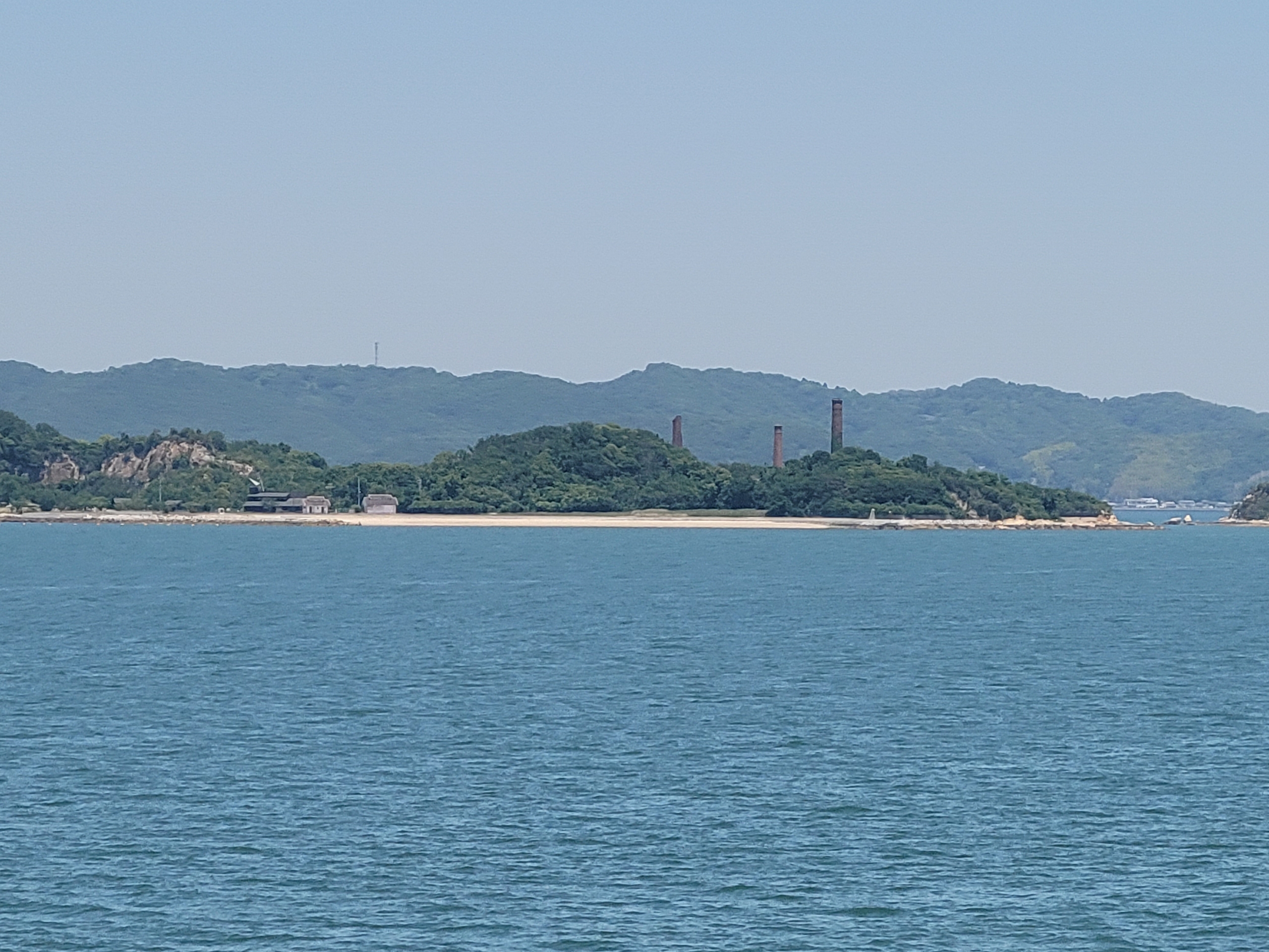 犬島。1925年に廃止されたが犬島精錬所の煙突がみえる。銅の精錬所として栄えピーク時には2000人近くが働いてたらしい。2008年に犬島精錬所美術館として利用されているとのこと。
