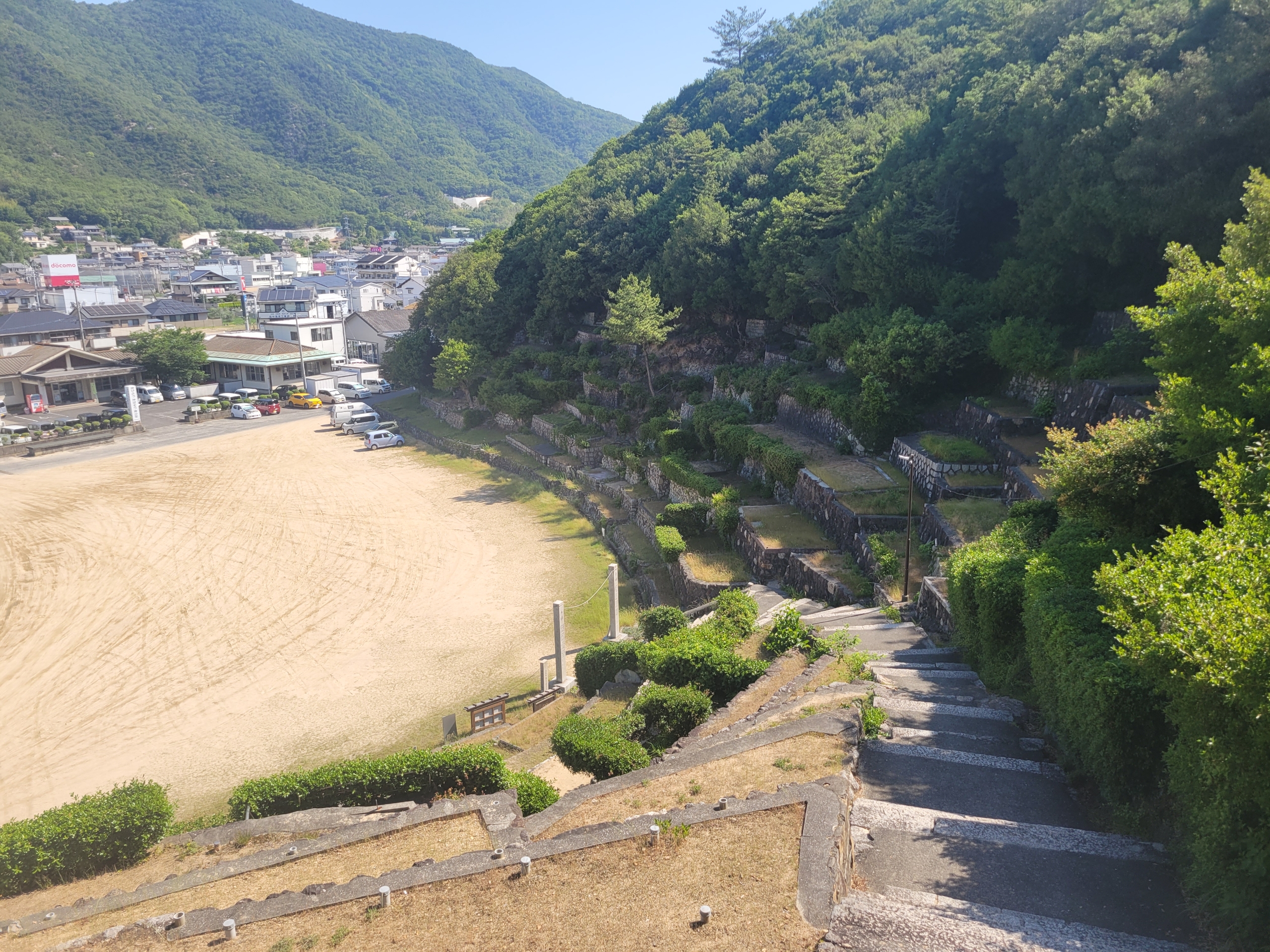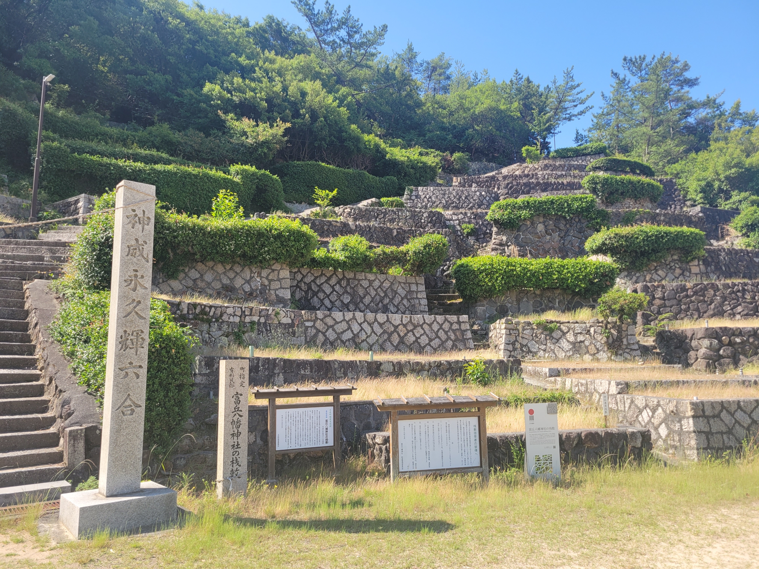 前知識がなかったので、なんか段々畑になっていると思ったら、さき程訪れた富丘八幡神社の桟敷でした。山林の傾斜地を利用して石垣を築いた後,桟敷を造り,催事を観覧できるようにしたもの。現在は364もの桟敷があるようです。