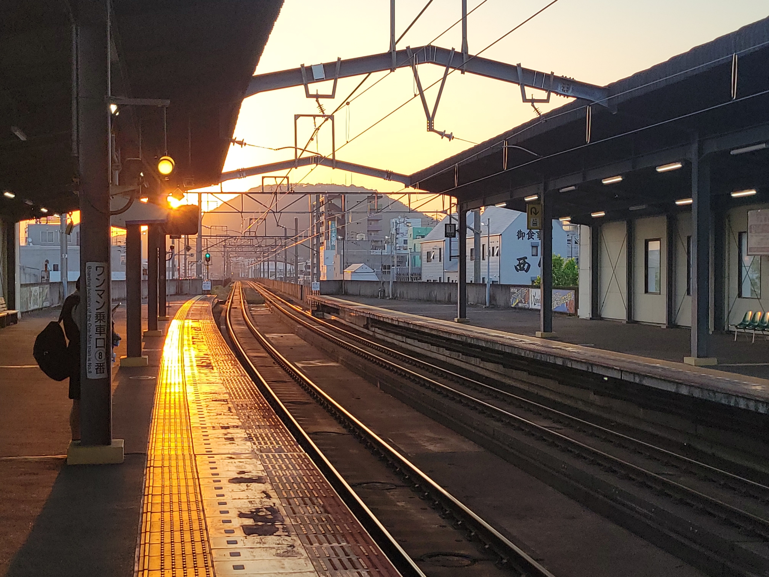 丸亀駅から始発列車で高松駅へ向かいます。太陽が昇ってきました。