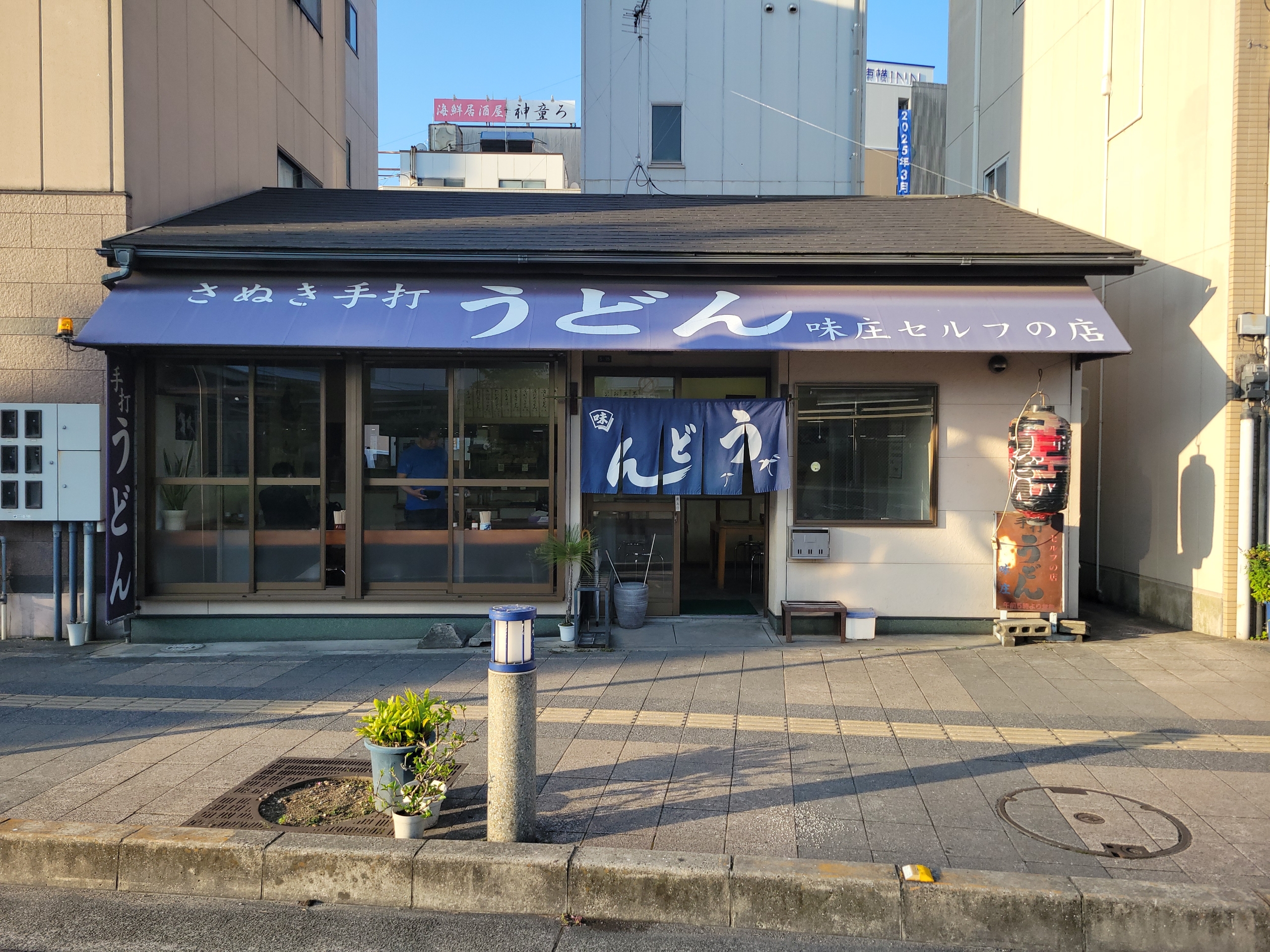 朝食はうどんです。朝5時から高松駅近く、長距離バスターミナル前で営業している手打ちうどん味庄。瀬戸大橋開通時から営業しているらしいです。