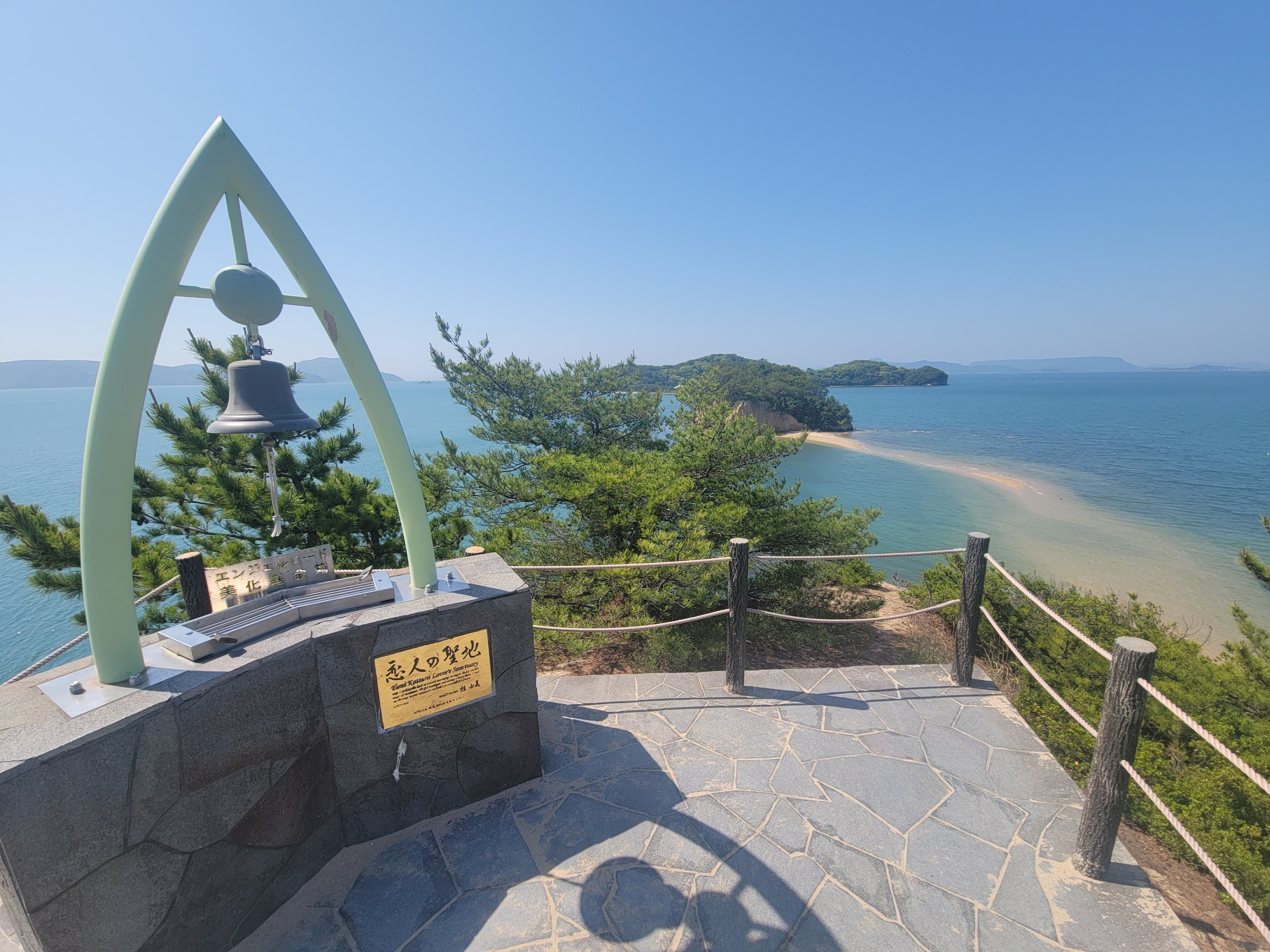 小豆島側の先端、弁天島の上に約束の丘展望台が設置され、階段で上ることができます。エンジェルロードがよく見渡せます。恋人の聖地に登録され、幸せの鐘なるものが設置されてました。うん、ひとり旅なので、人のいない満潮時にきて正解です。