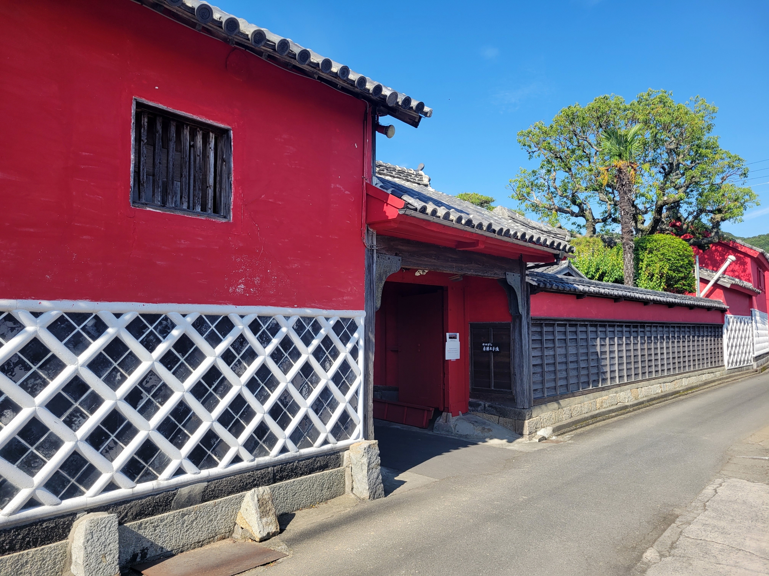 かめびし屋。引田の歴史ある町並みの中でも、「べんがら色」で塗られた壁の蔵が連なる景観で一目でわかる存在感を放っているのが「かめびし屋」です。創業約260年を迎えるこの醤油蔵は、古来の伝統製法である「むしろ麹製法」で天然長期熟成にこだわり、深い旨味でまろやかな醤油を作っているらしい。その伝統的な醤油の製法を見学でき、醬油のテイスティングもできるのですが、残念ながら本日は臨時休業とのことです…。事前に調べて分かっていたのです、急にがっかりしたわけではないのが救いです。