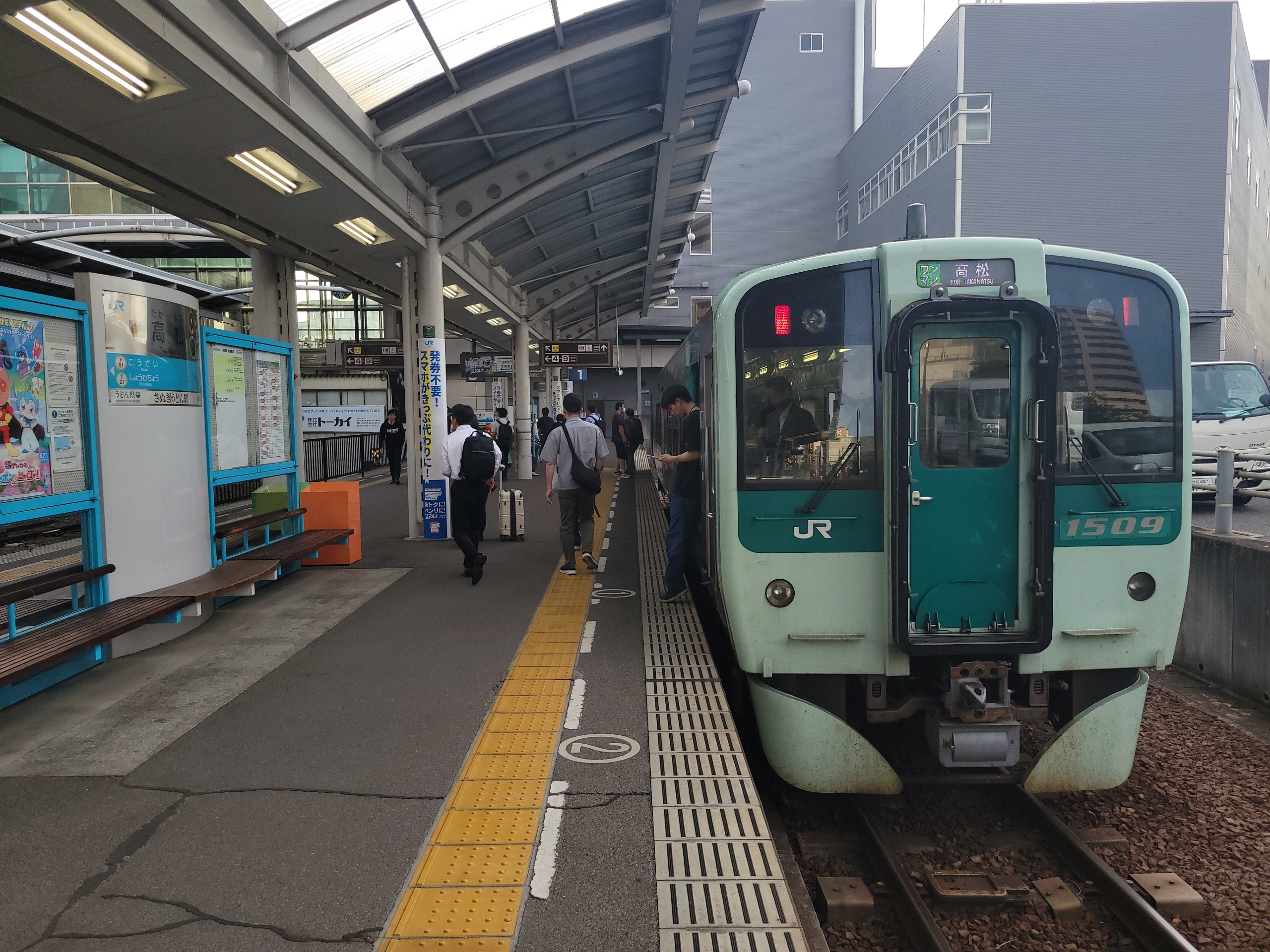 乗車してきた列車は折り返し07:50発高松行きとなるのですが、出発間際にたくさんの学生が乗車してきて混雑していました。2駅戻った三本木駅近くに高校があったのでそこの生徒さんかと思われます。地方の鉄道って学生が支えているんだなと実感させられる光景でした。