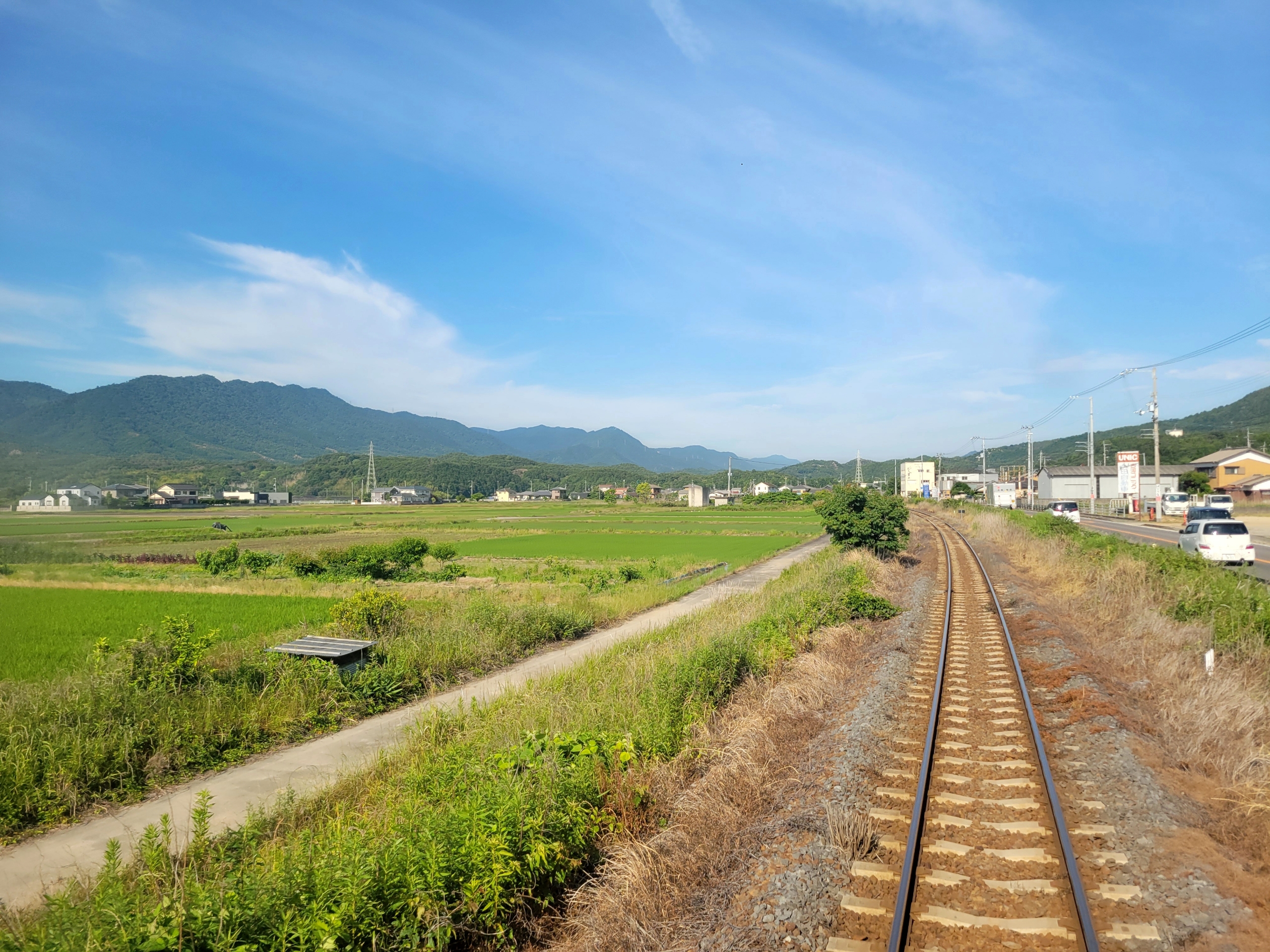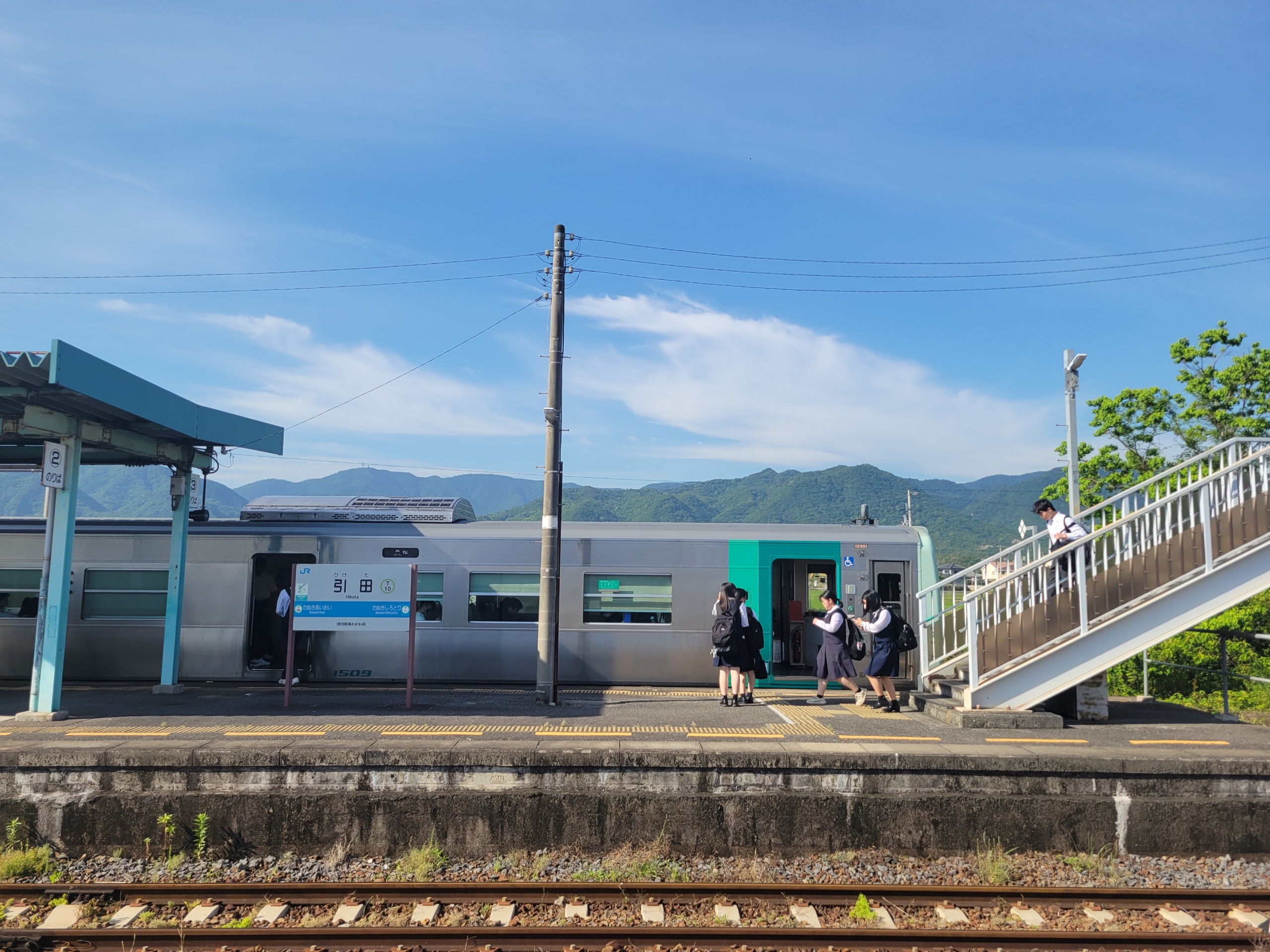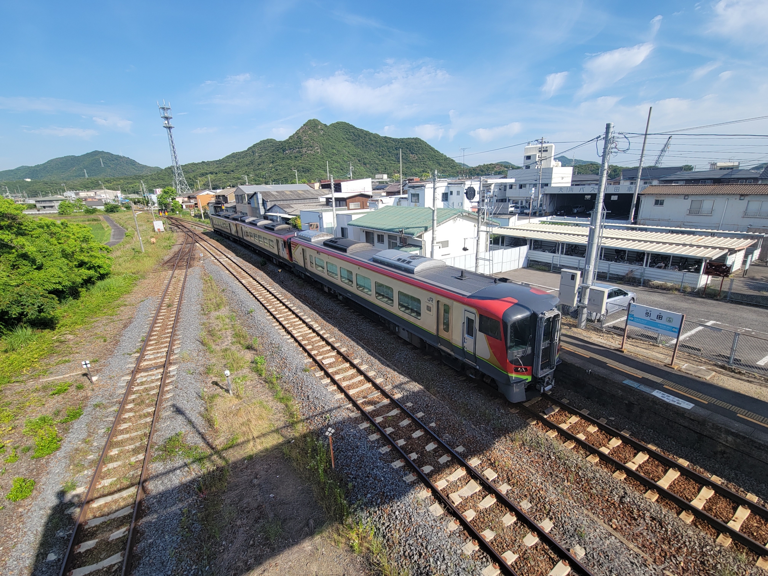 もうすぐ終点の引田駅ということは香川県ももうすぐ終わりです。香川県と徳島県を隔てる讃岐山脈も近づいてきました。高徳線は特急も多く走る路線なので、頑丈なコンクリート製の枕木が使われていますね。高速バスとの競争もありますから、できるだけ高速で走る必要がありますから。