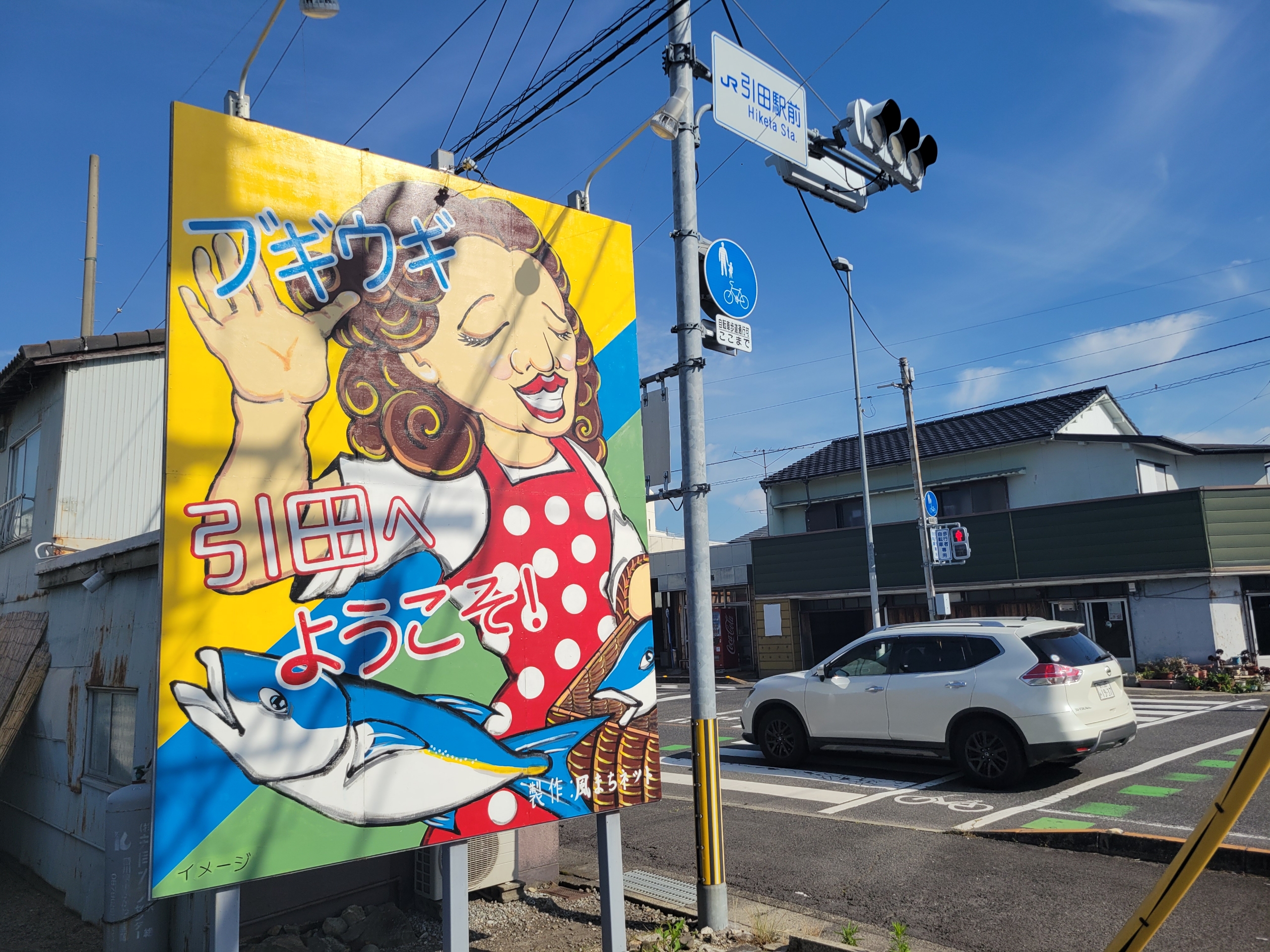 引田駅駅前の看板ですが、派手ですね。目の前には国道11号線が通っています。