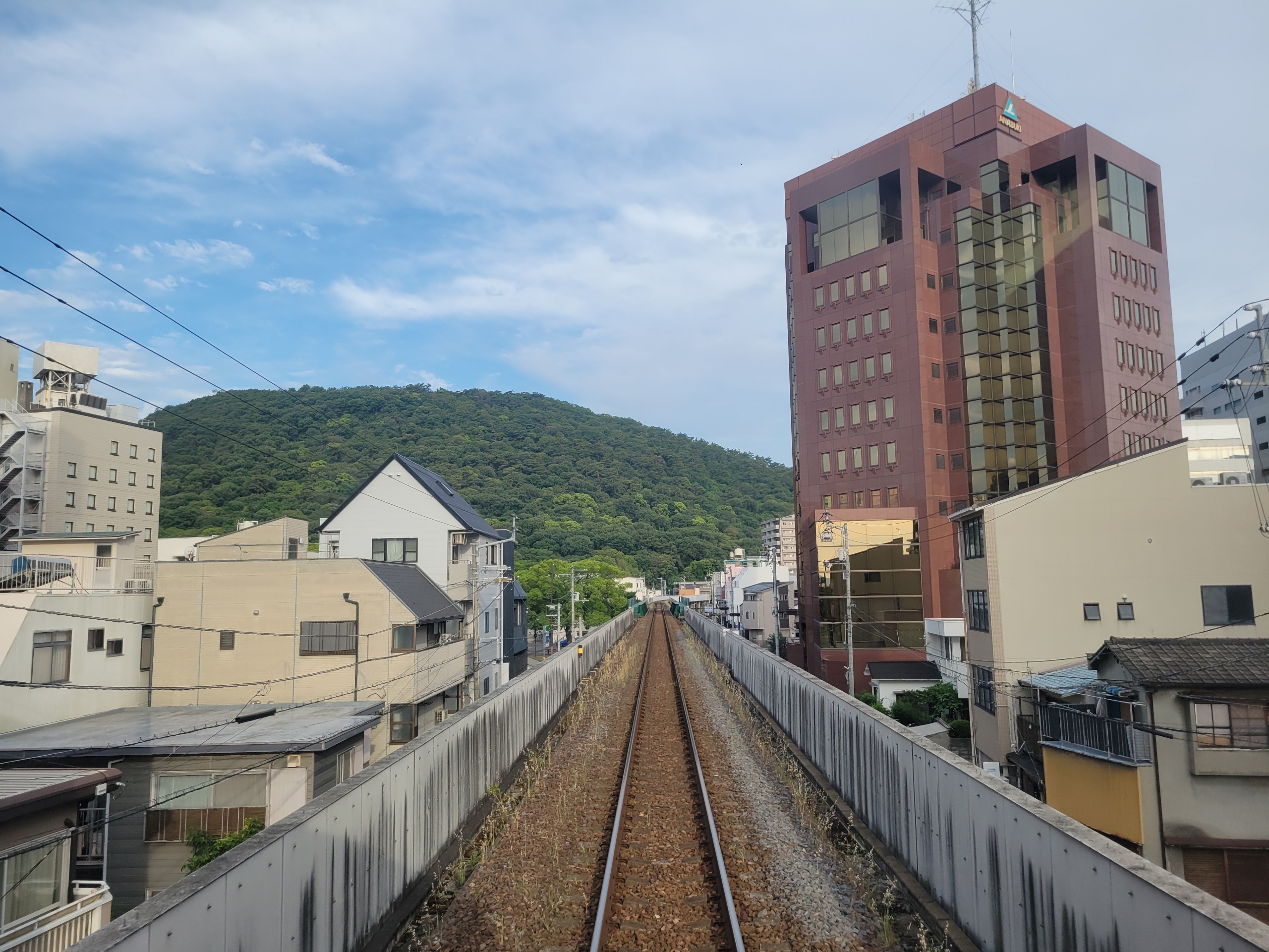 高徳線はさびしく単線。高松市内をいったん大きく西に迂回してから、東に進みます。高松の中心部では高架化されていました。