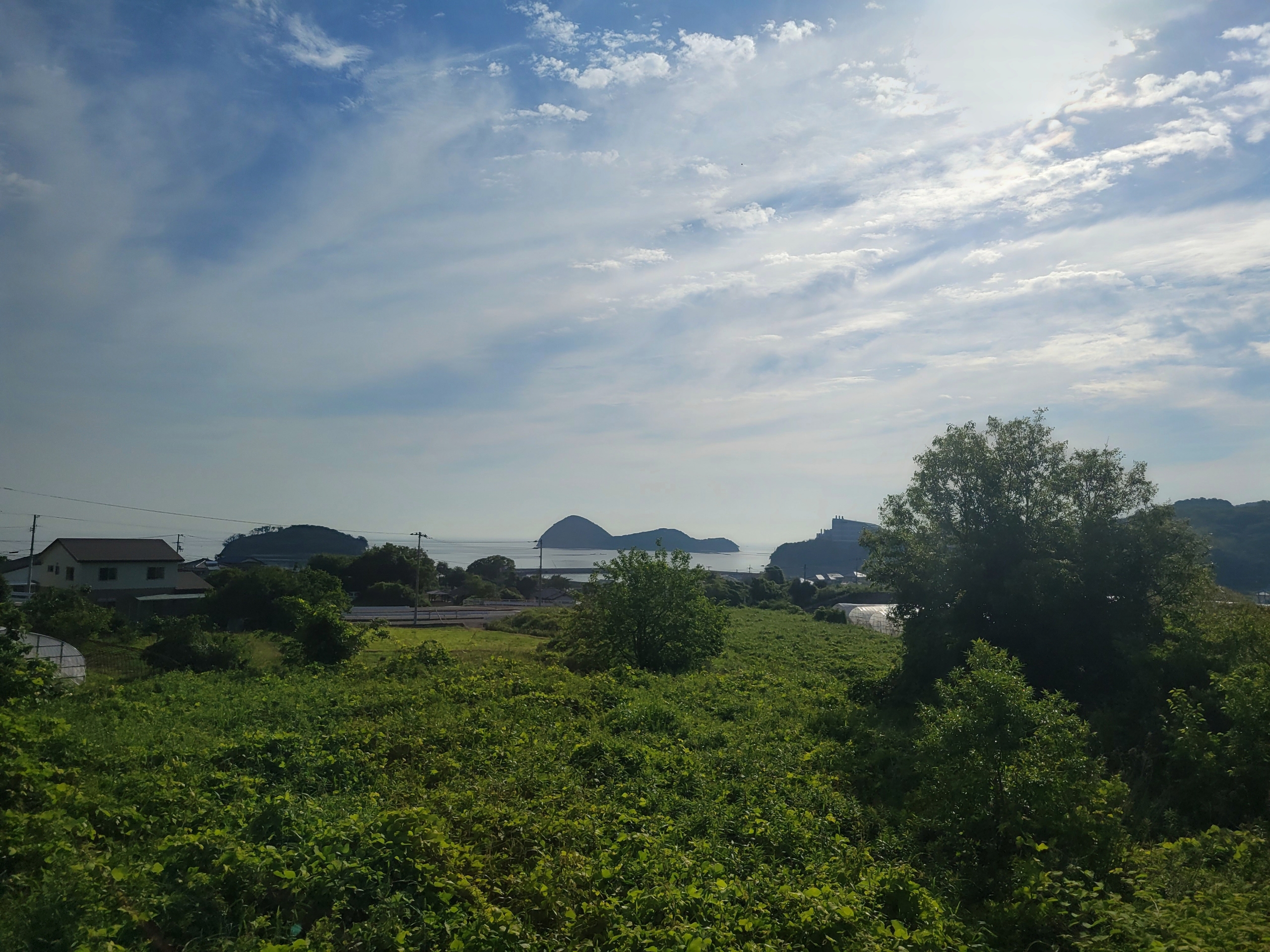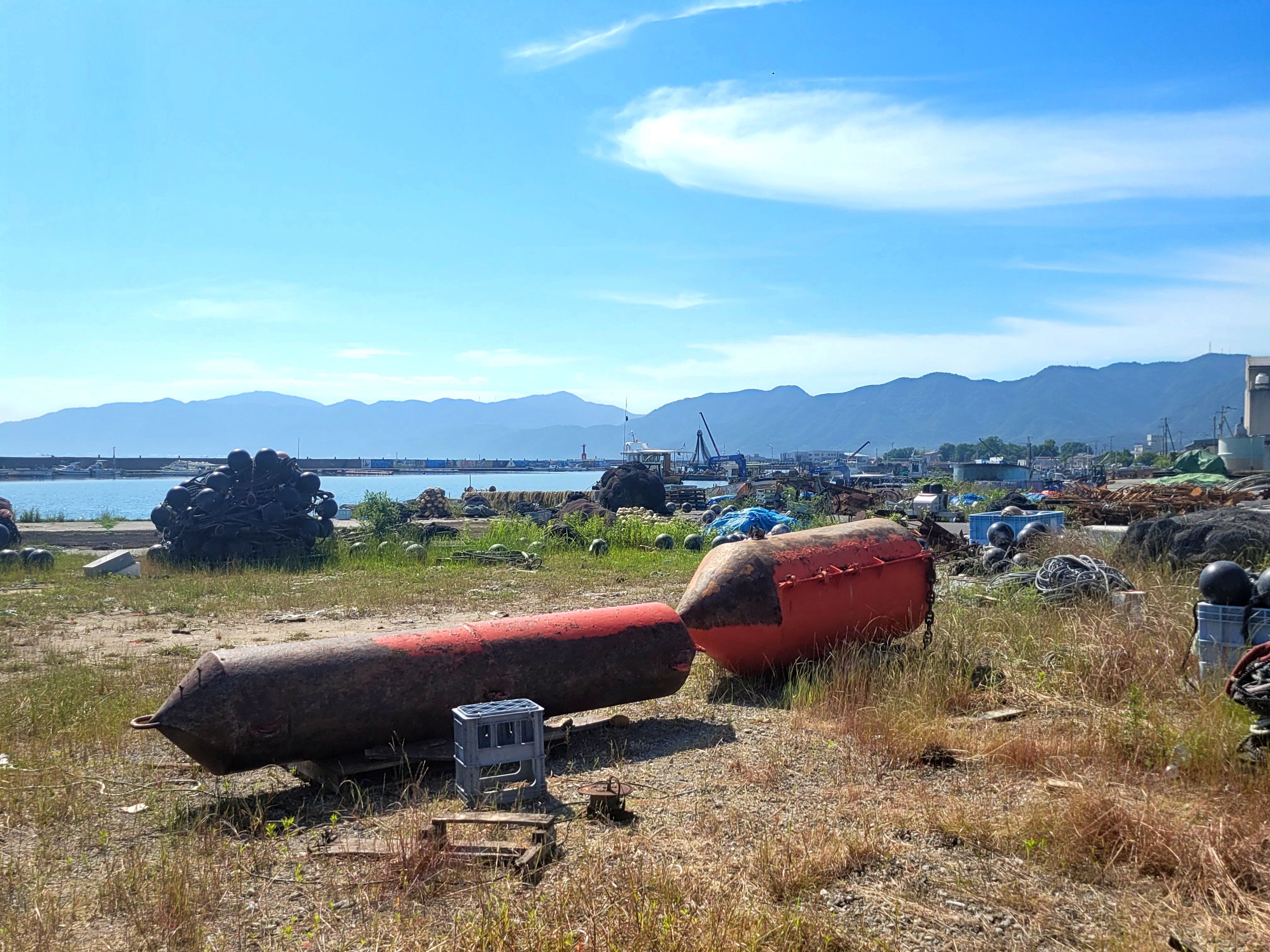 引田漁港近くの空き地です。堤防に「湾岸アート」と称してたくさんの絵が描かれているそうですが、もう暑くて見に行く気になれないですね。一応ずっと日なたでは日傘をさしているんですが本当に暑い。もう駅に戻ります…。あとアートも良いけど、こういう荷物が散乱しているの何とかしないのかな。
