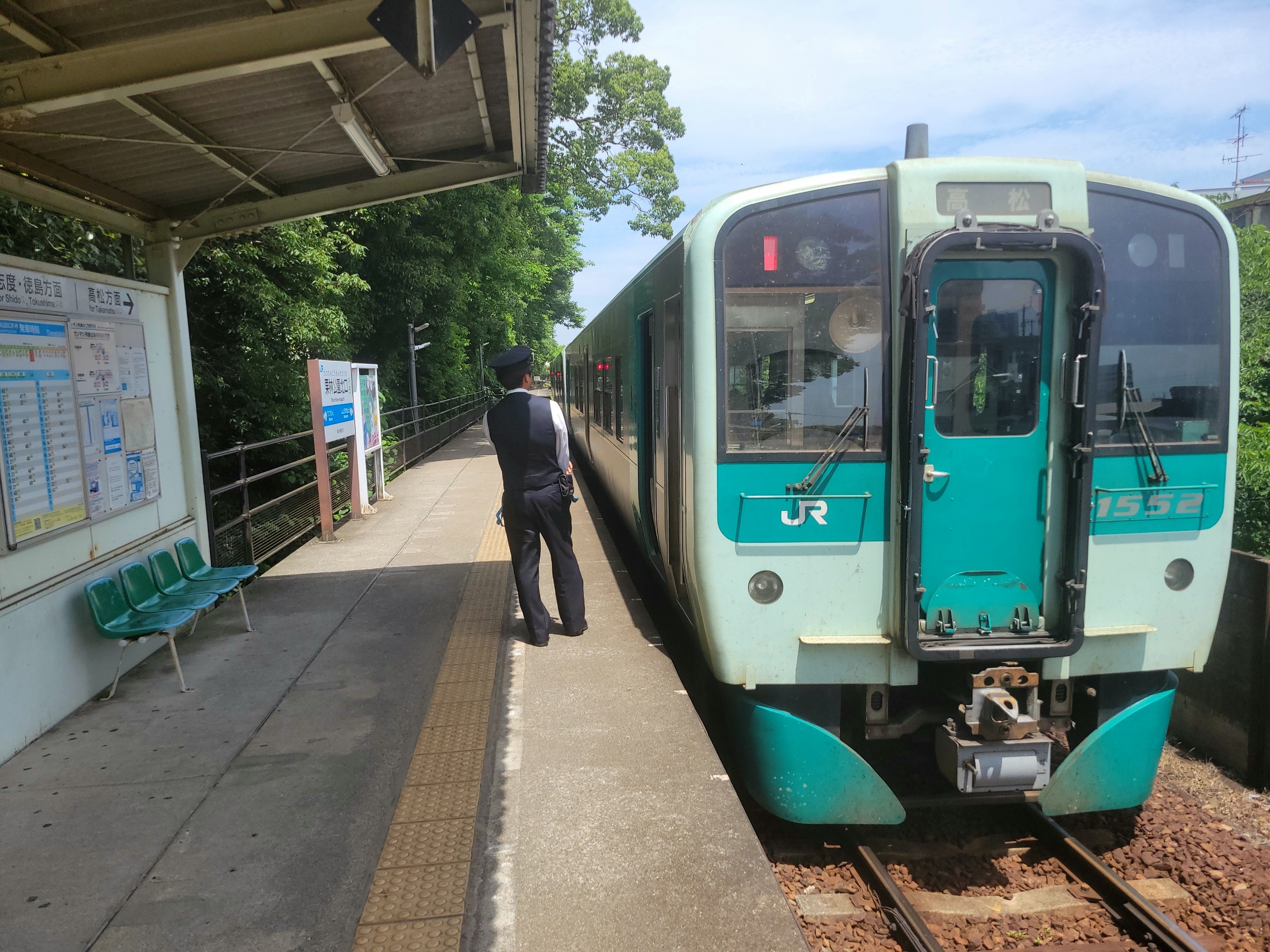 架線も屋根もない引田駅。空が広くて解放感あふれる。大盤振る舞い3両編成で、ワンマンではなく車掌さんもいました。始発駅で早くから列車を開放してくれてたので、早めにエアコンの効いた車内で涼みました。ほんとJR四国はサービス良いなあ。その分、乗務員は苦労してそうですが。