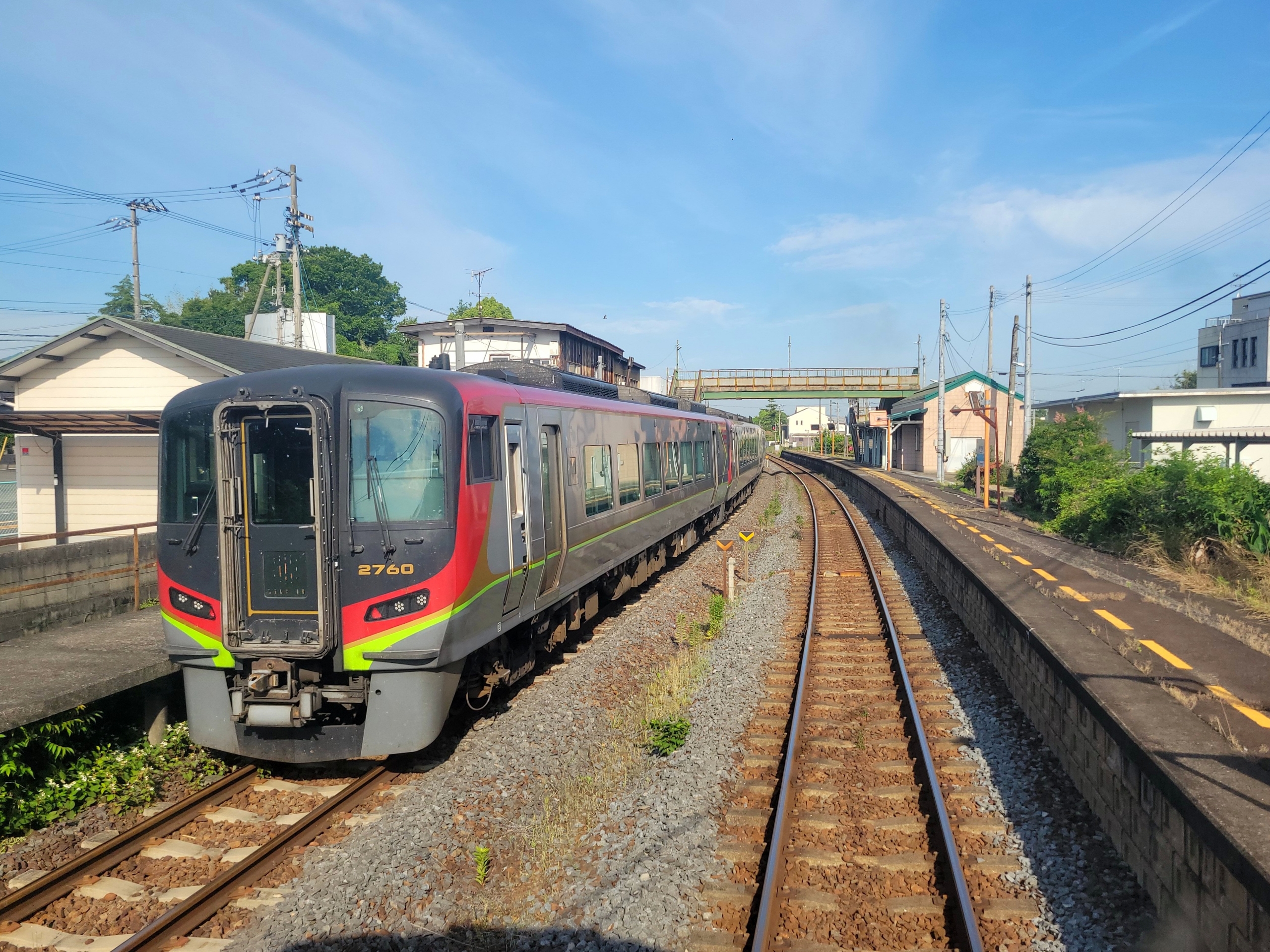屋島駅でうずしお2号と列車交換。まだ利用者が少ないのか2両編成です。列車交換とは単線区間ですれ違いができないので、駅か信号場など線路が複線以上あるところで列車同士がすれ違うことです。