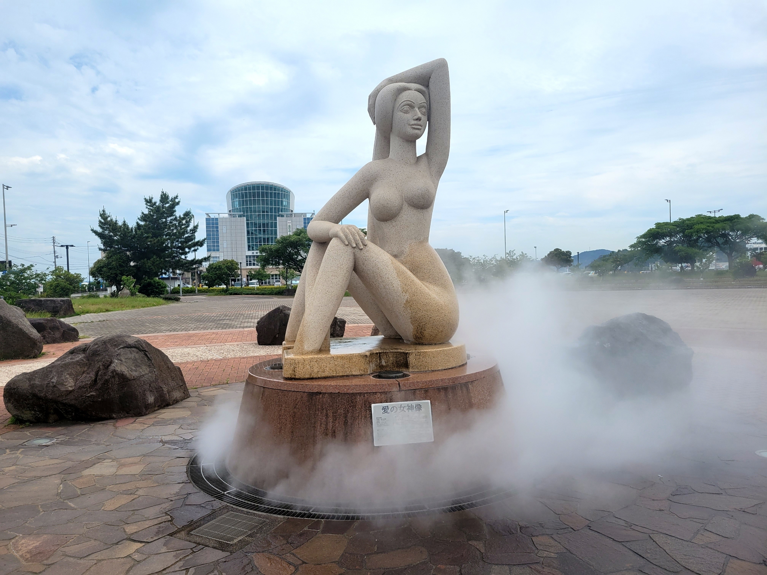 駅前の道路を渡ると、突然現れる「愛の女神像」。インド人彫刻家による作品で、玉野市の「七つの女神像プロジェクト」の一環として、2002年に設置されたものらしい。ミストが噴き出しているが、維持費はそれなりにかかりそうだ。
