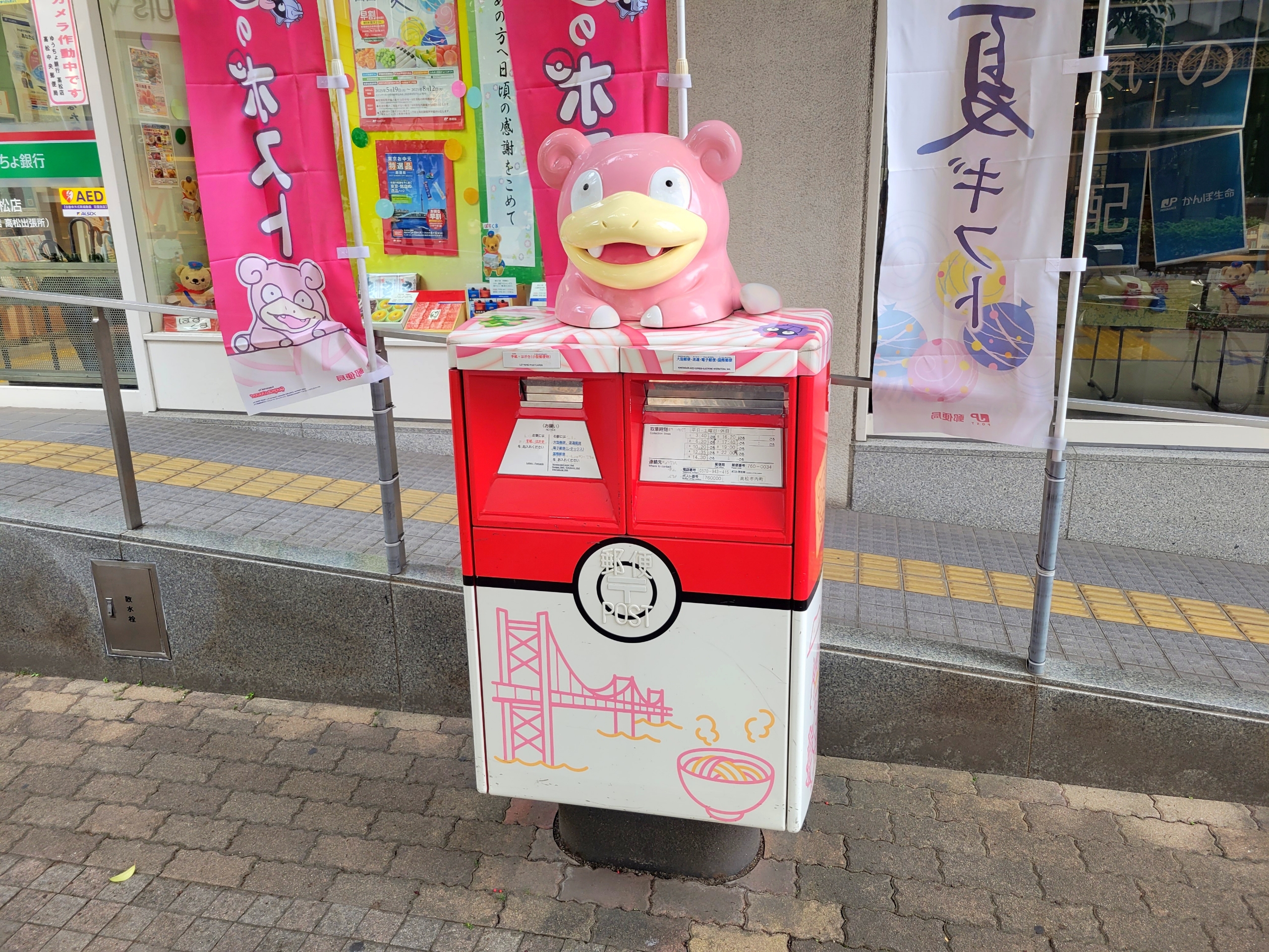 高松中央郵便局前のポスト。ポケモンの「ヤドン」がデザインされている。「ヤドン」と「うどん」で名前が似ていることから、香川県のご当地ポケモンとして採用されているらしい。商店街にも隣接していて、立地的にも便利な場所にある。