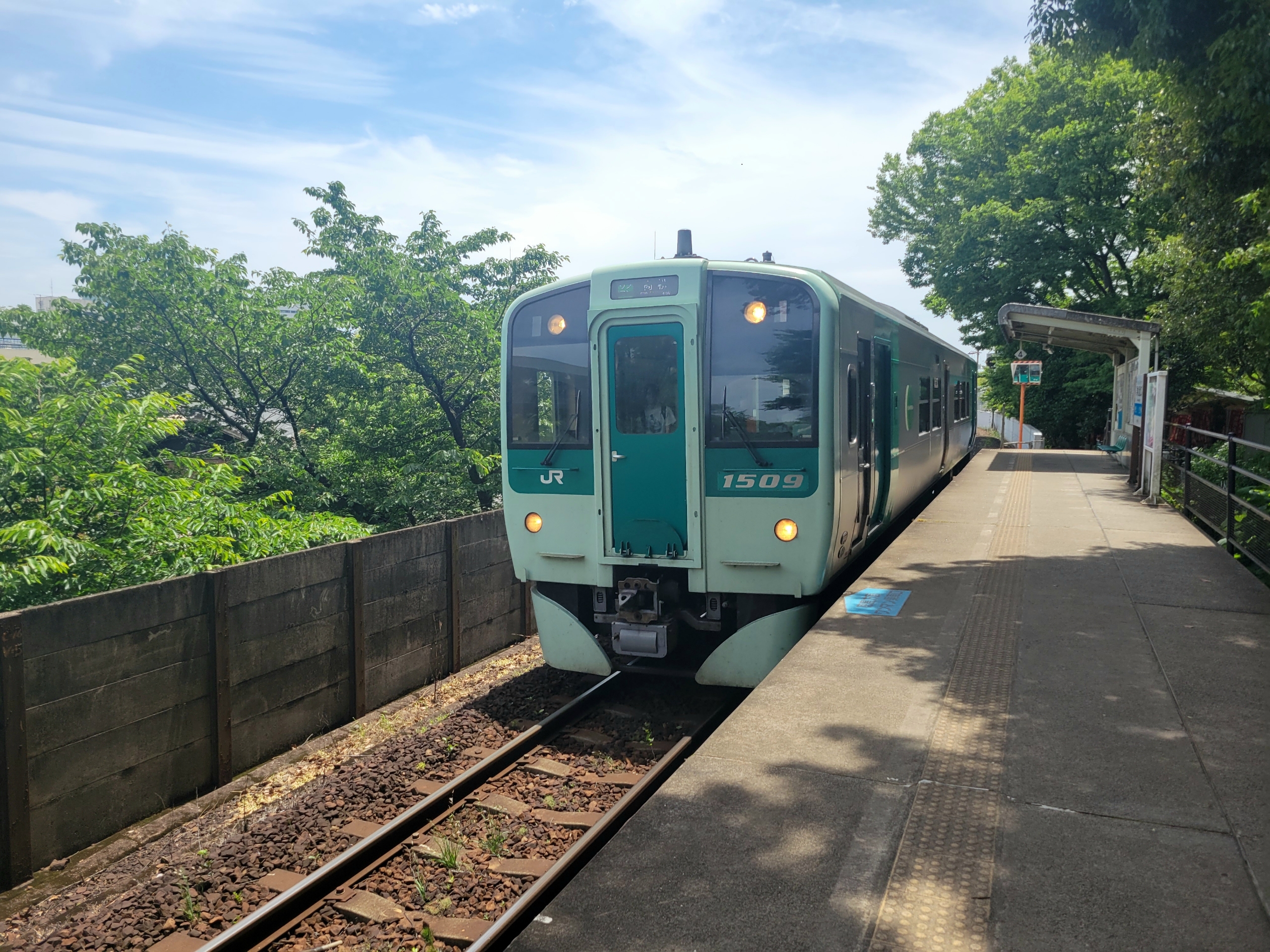 先行する特急が遅れていた影響で、普通列車も2分遅れで到着。栗林公園北口から高松までは2駅だけの短い乗車。高松駅近郊ということもあって利用者は多く、車内はやや混雑していた。