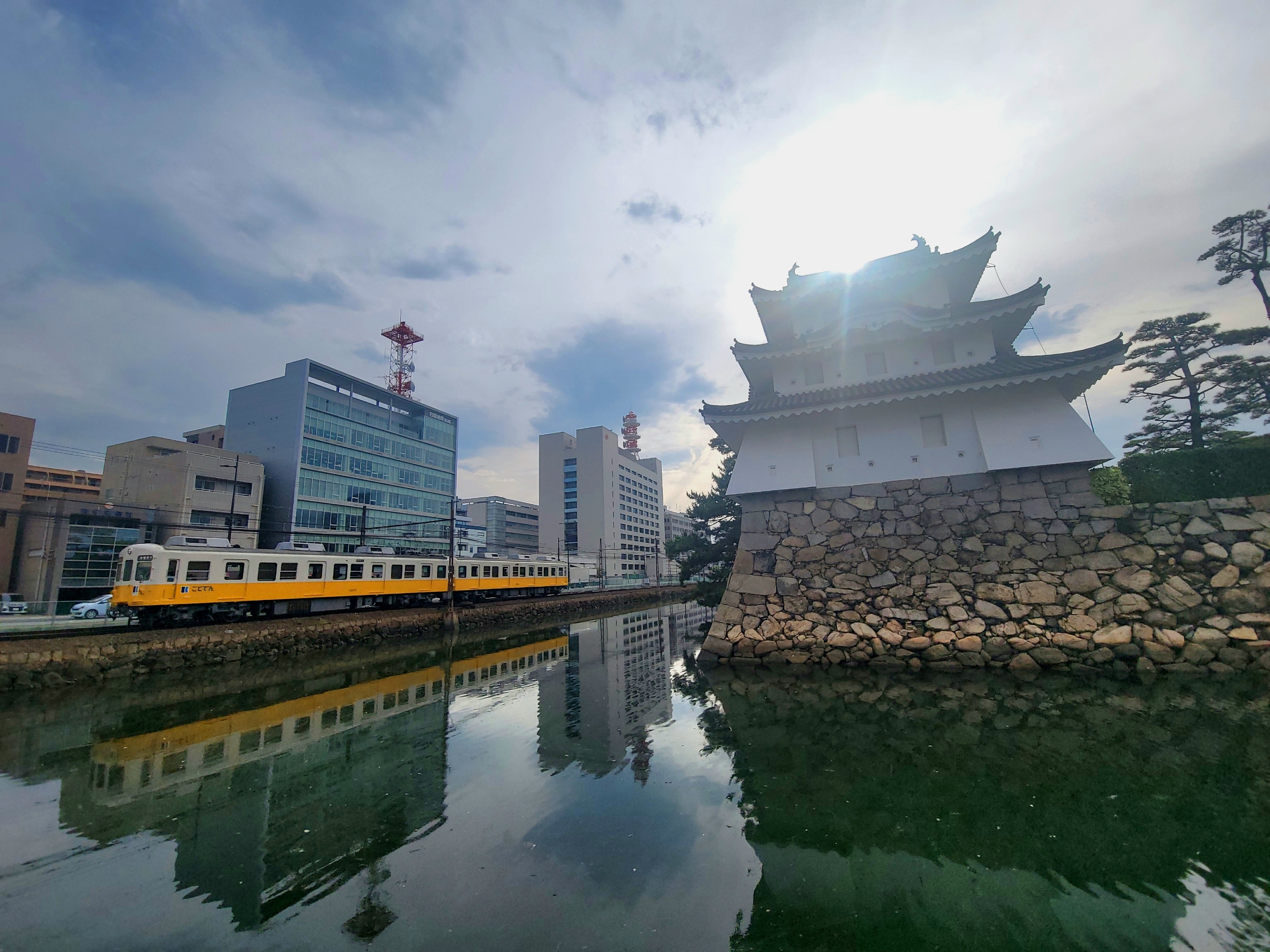 高松城の堀沿いを走る琴平電鉄。城のすぐ脇にある高松築港駅を出ると、列車は堀の縁をなぞるように進み、水面にその姿を映しながら中心地の瓦町へ向かっていく。